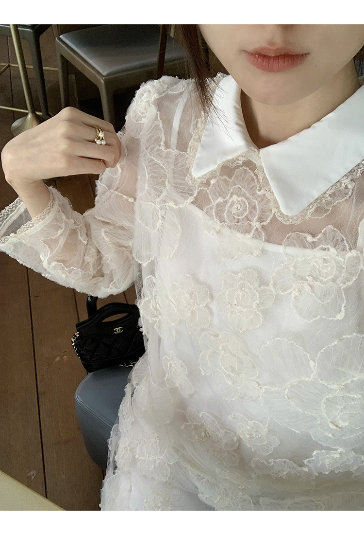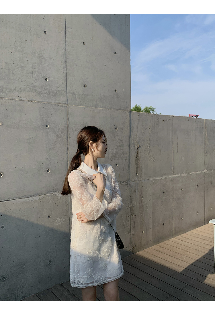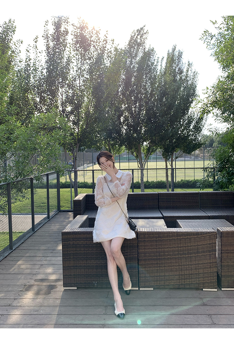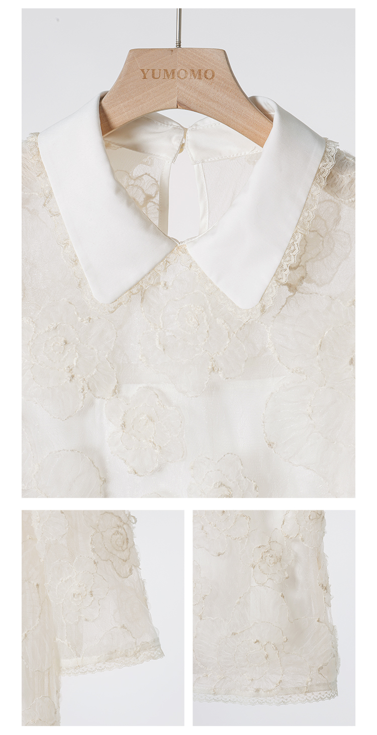 領型設計微微撞色的襯衫領設計,領口整圈點綴蕾絲小花邊