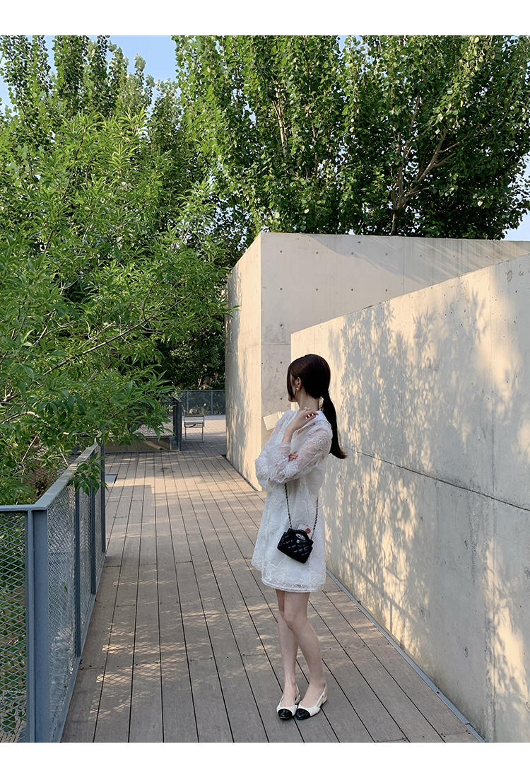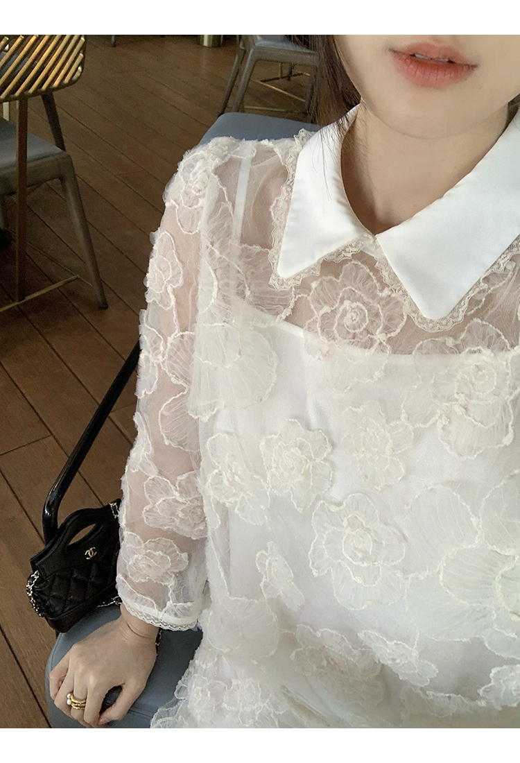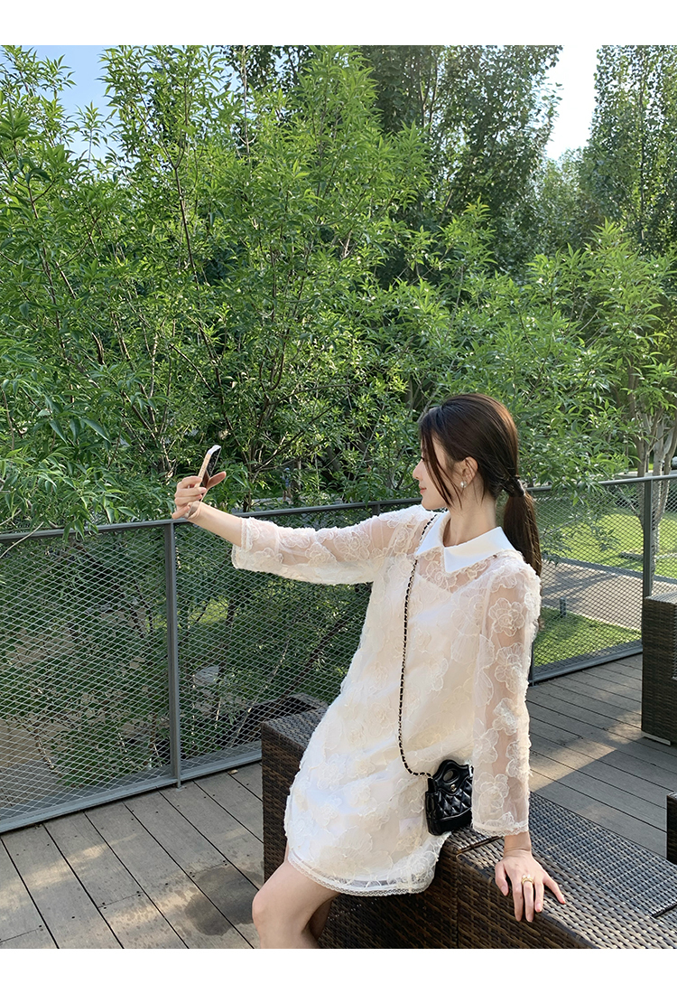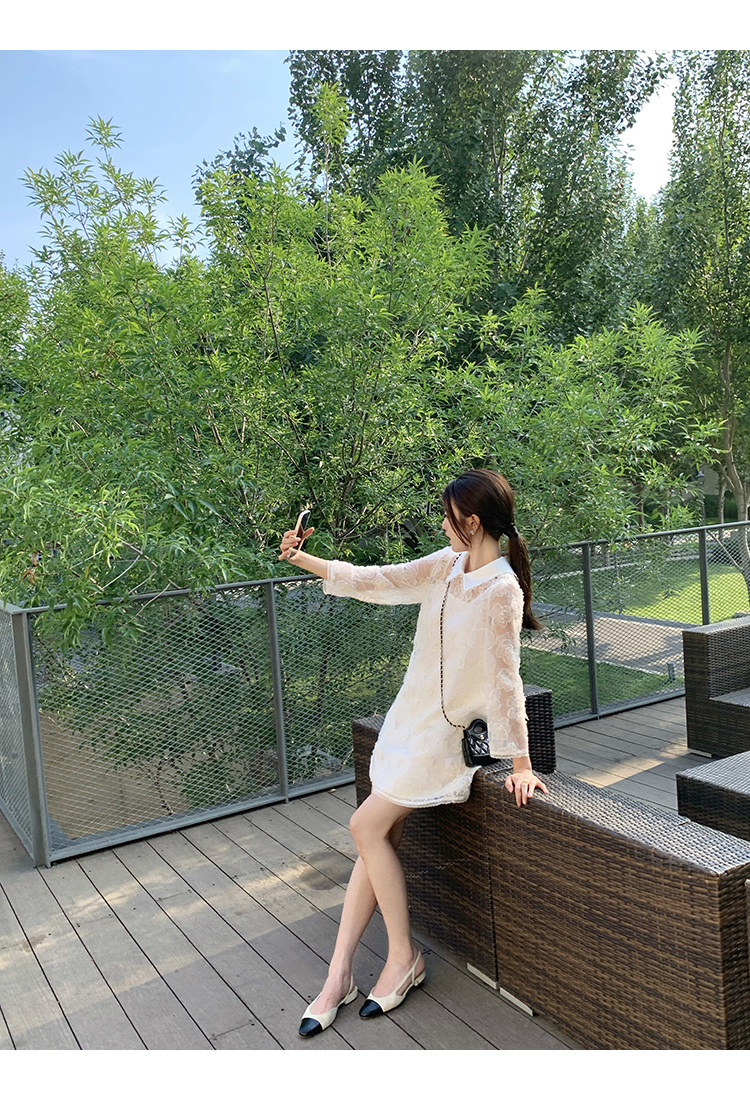 領型設計微微撞色的襯衫領設計,領口整圈點綴蕾絲小花邊