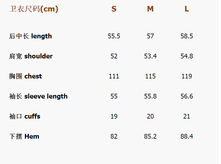 衣長/肩寬/袖長為平量,其他為一圈(單位:公分)