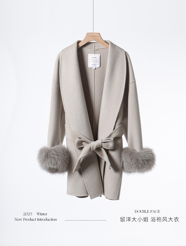 浴袍式大翻领设计,线条流畅,修饰脖颈线条