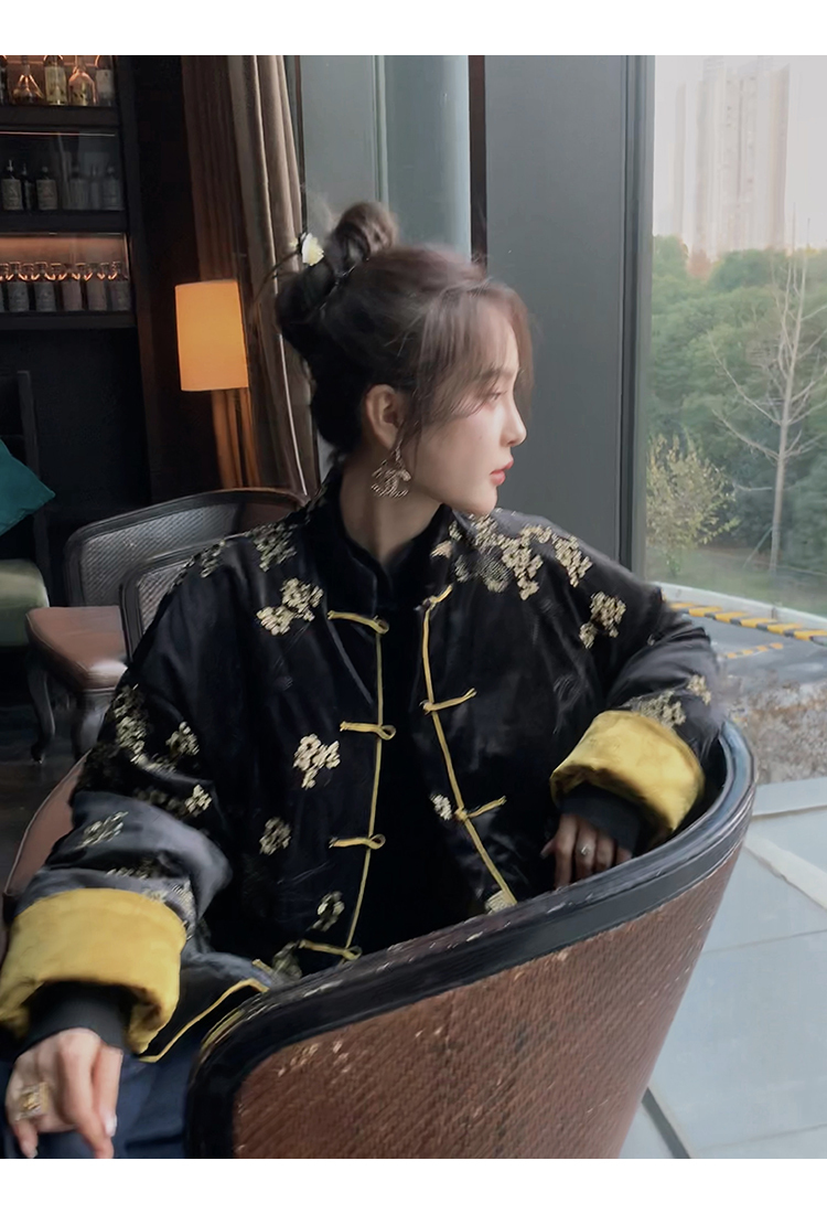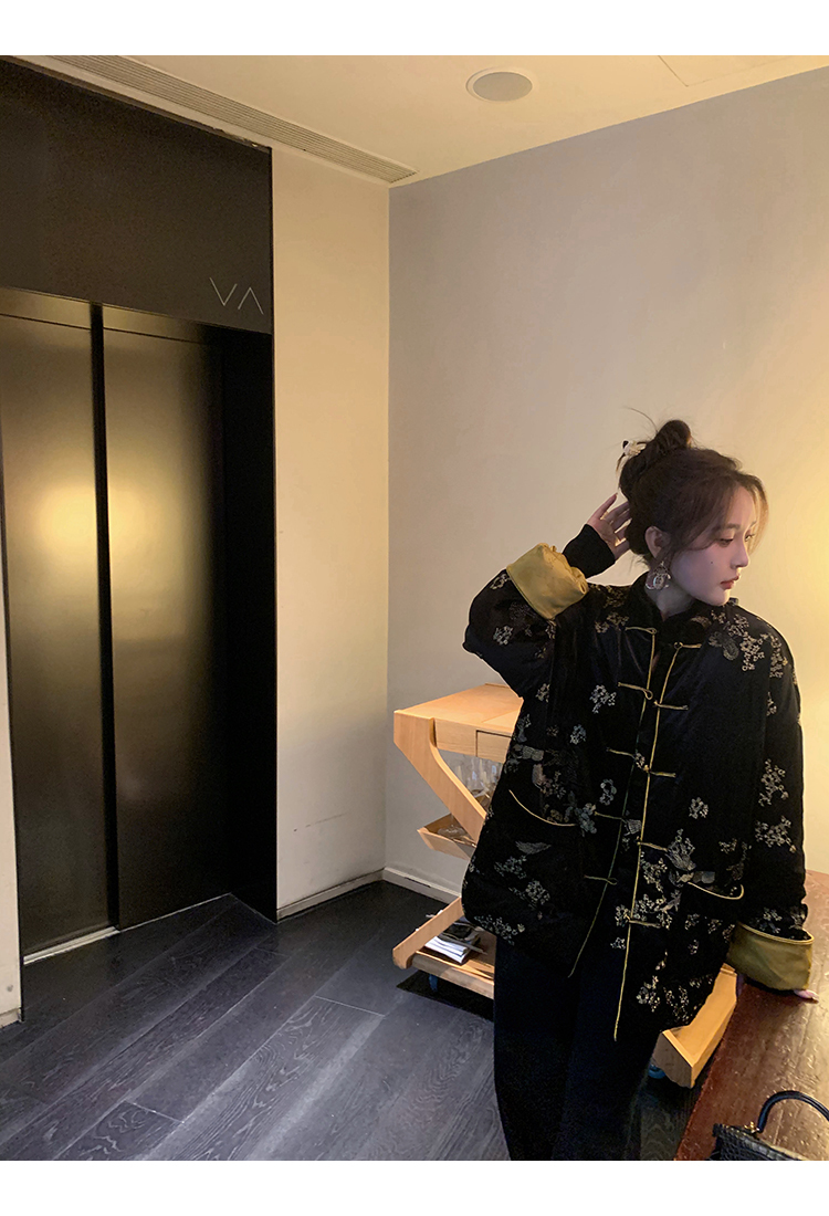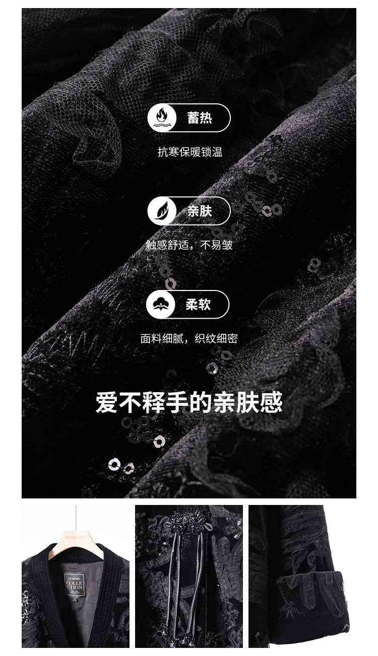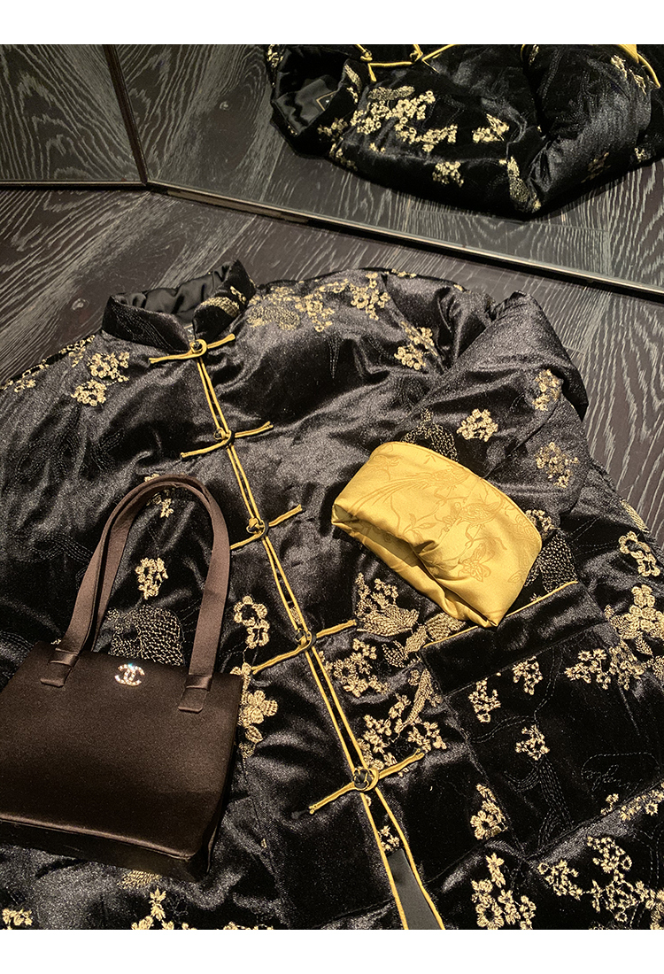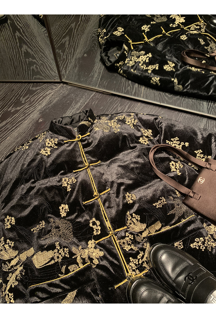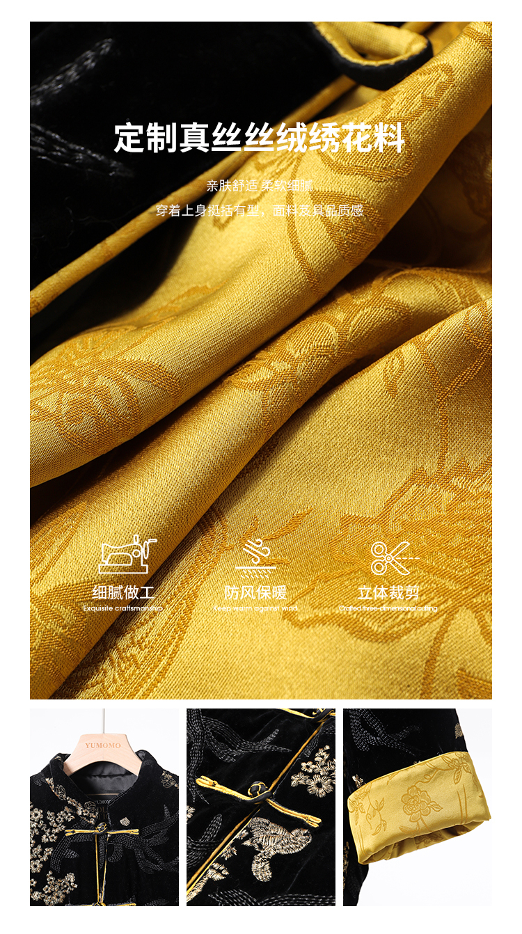 真絲絲絨布料再融入菁致金色絲線繡花, 整體衣服盡顯菁、輕奢感和高芨感。