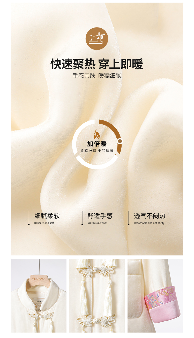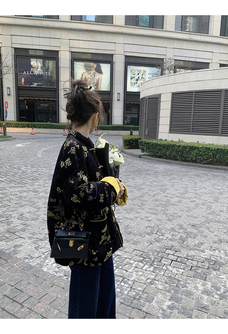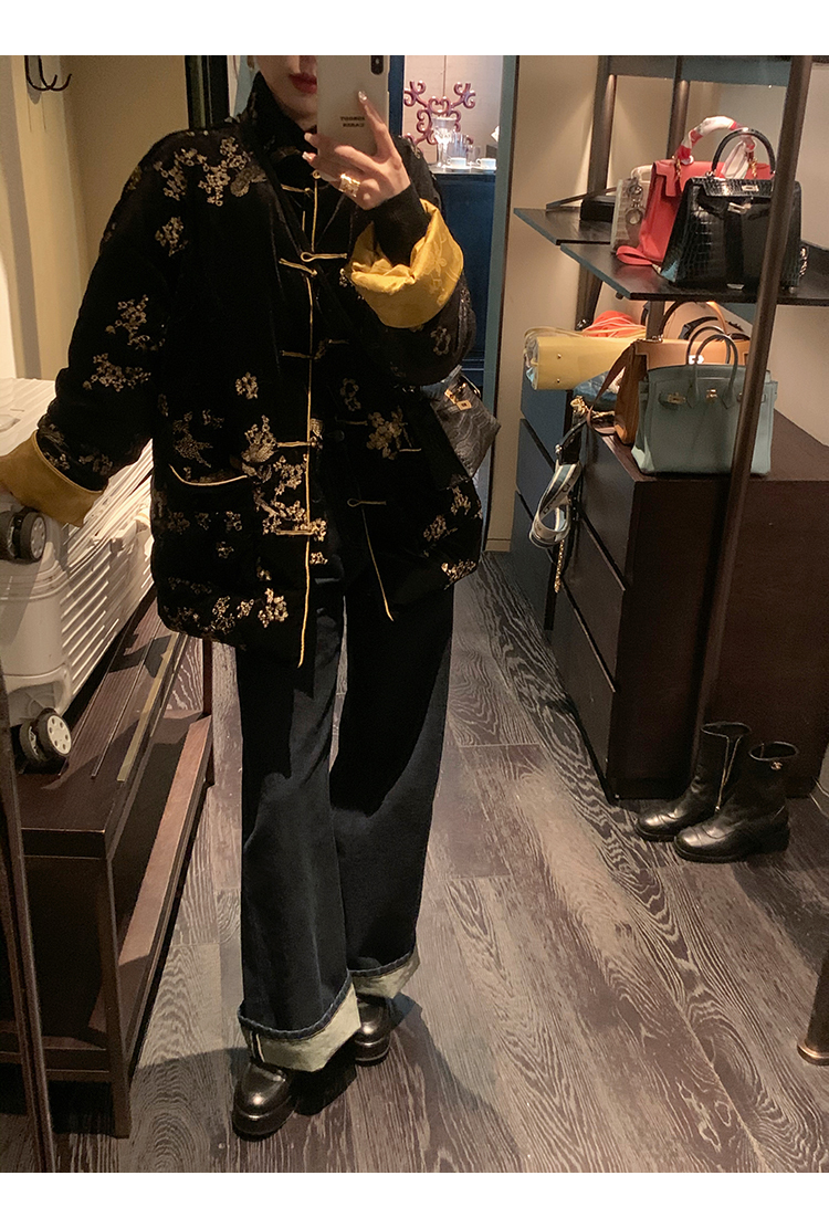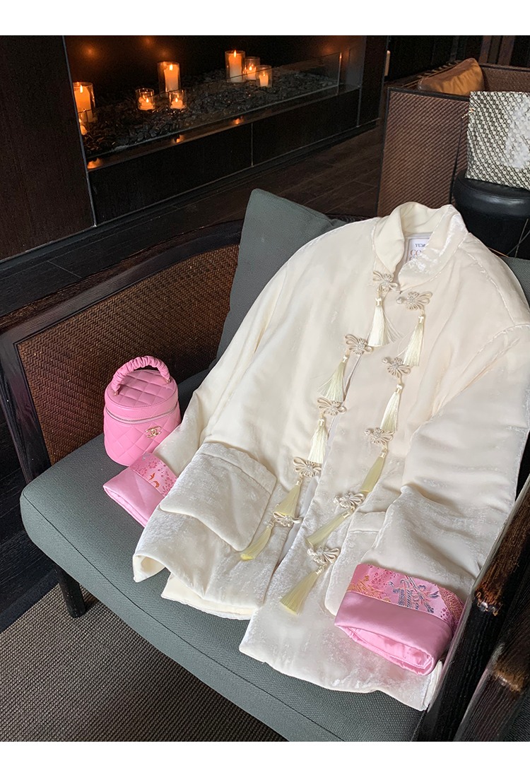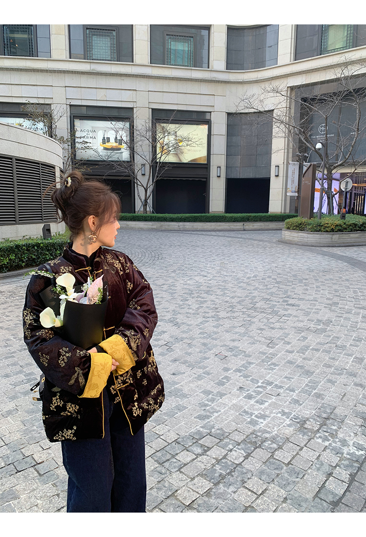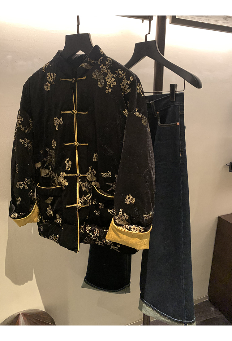 真絲絲絨布料再融入菁致金色絲線繡花, 整體衣服盡顯菁、輕奢感和高芨感。
