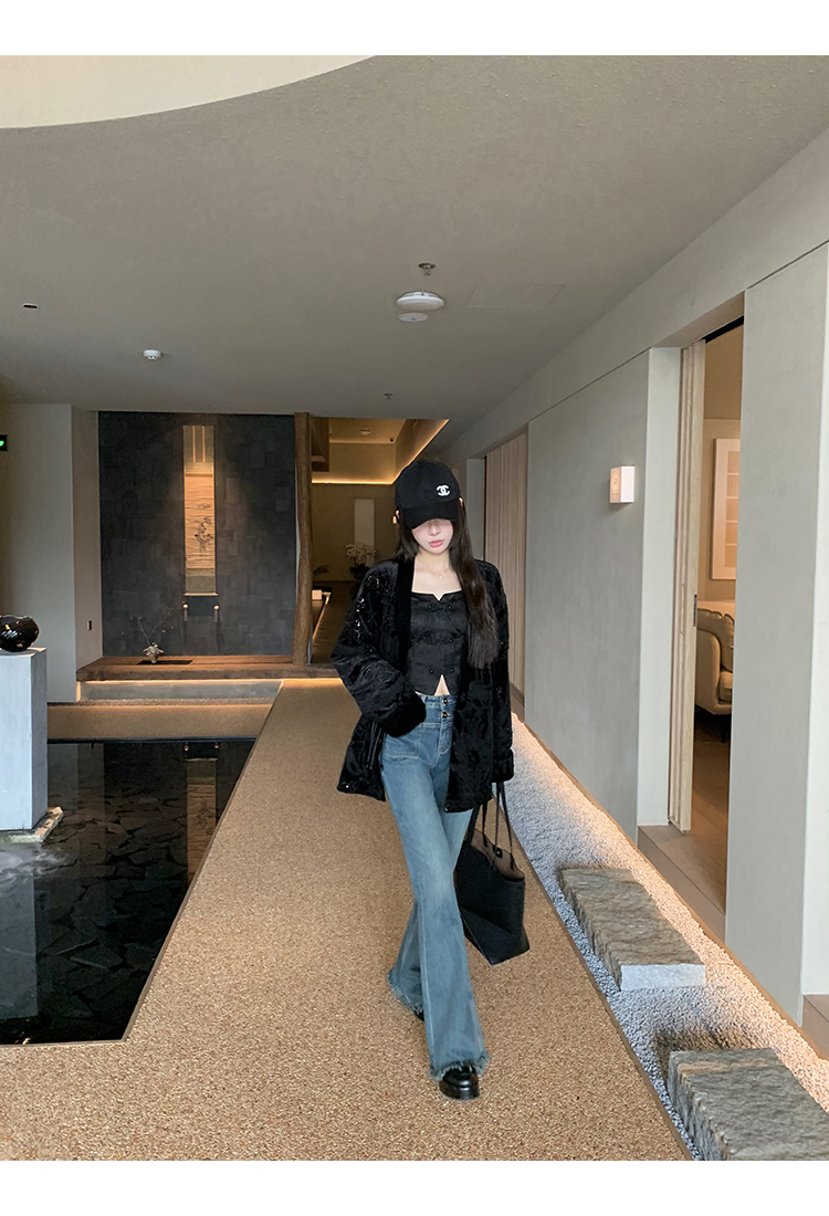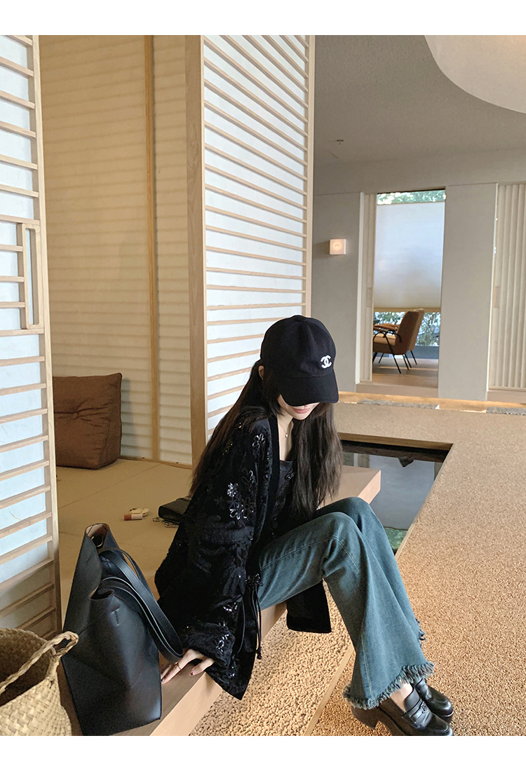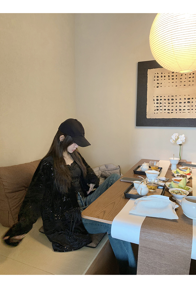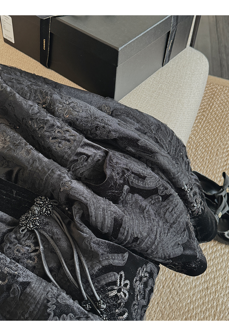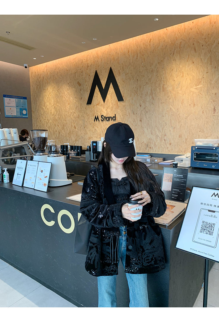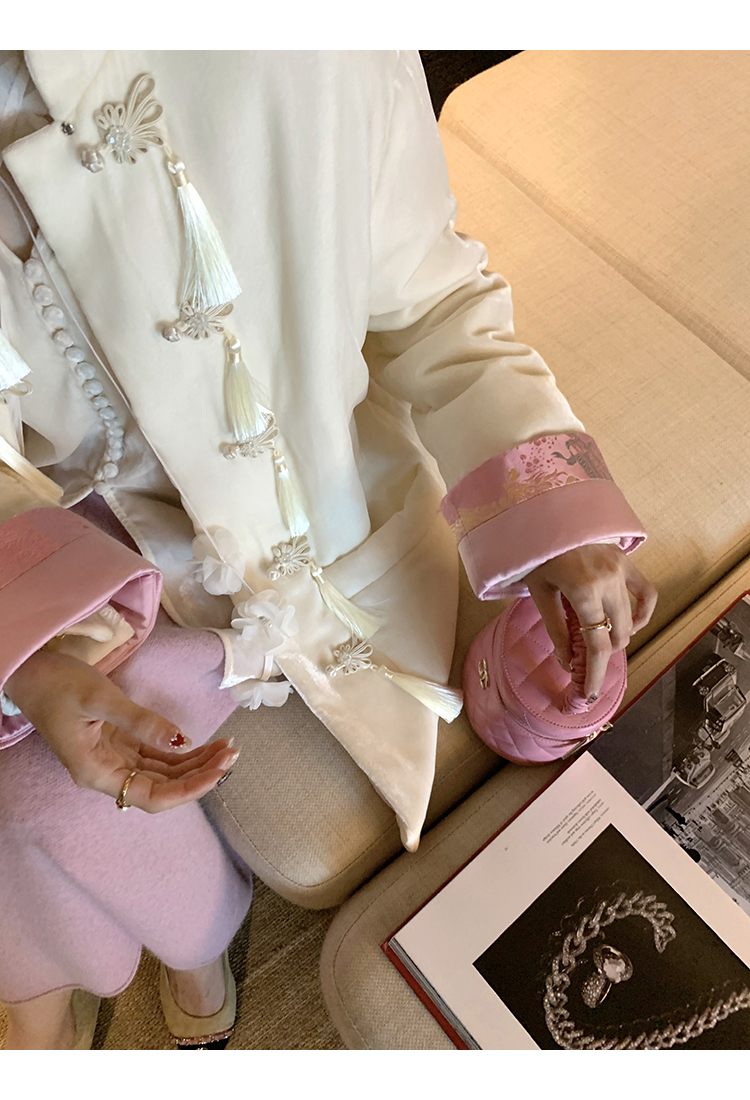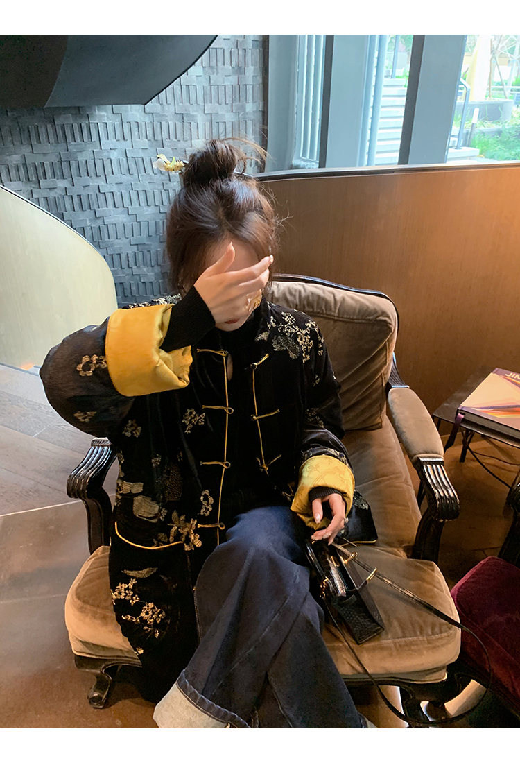 真絲絲絨布料再融入菁致金色絲線繡花, 整體衣服盡顯菁、輕奢感和高芨感。