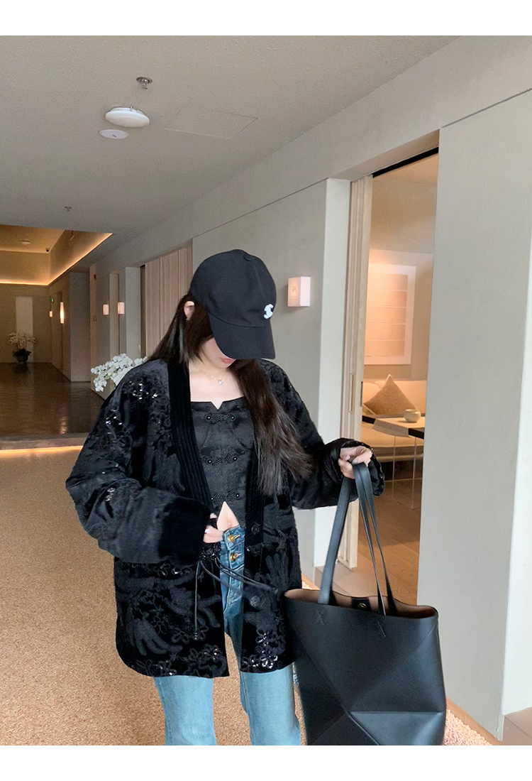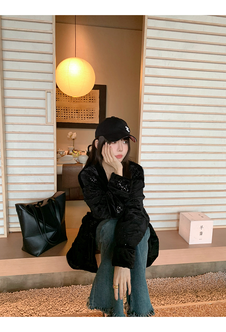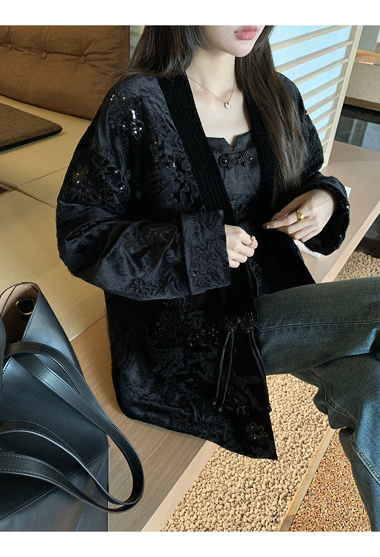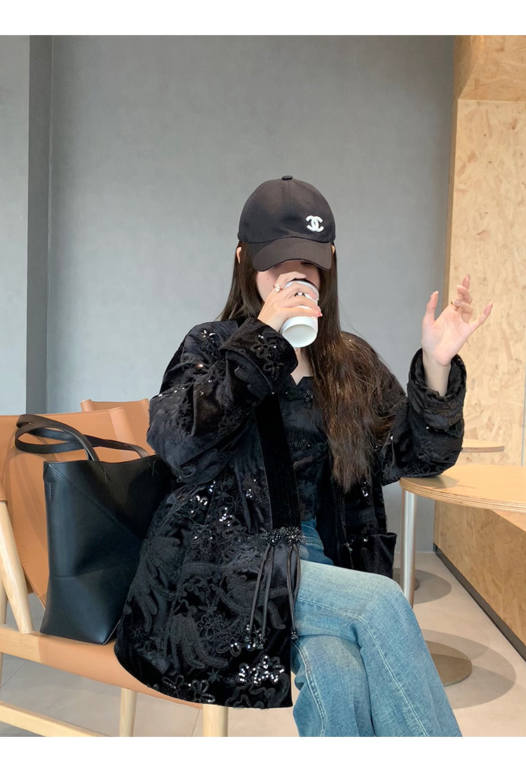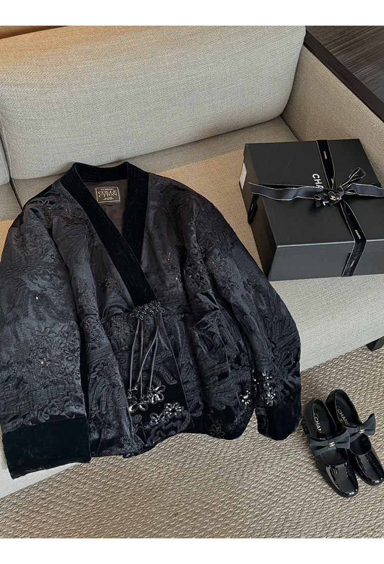 黑色V領棉服布料品名:訂製高芨立體盤繡絲絨布料