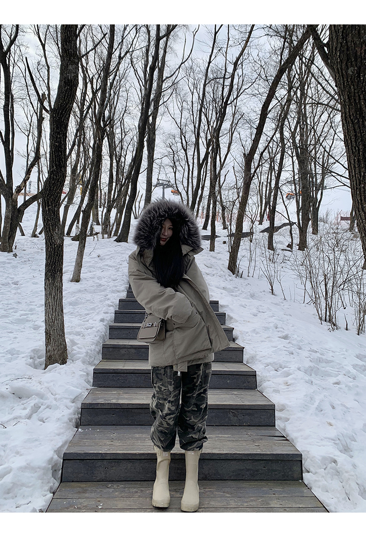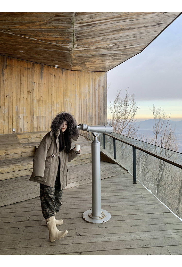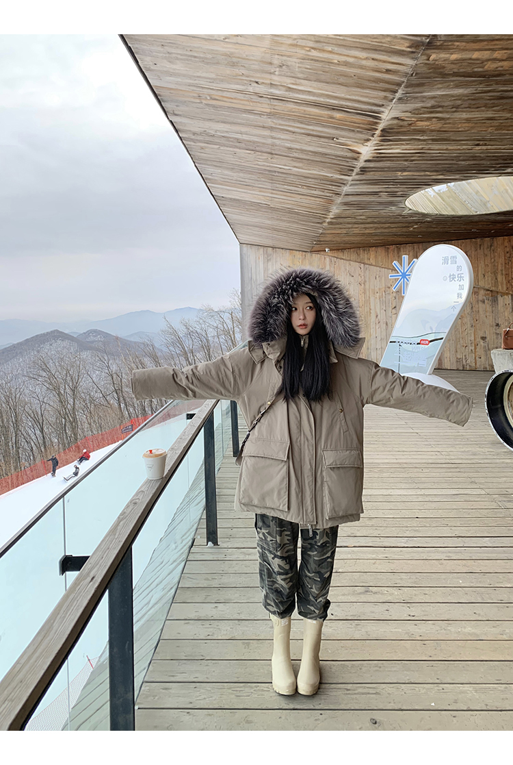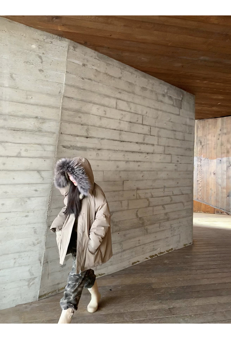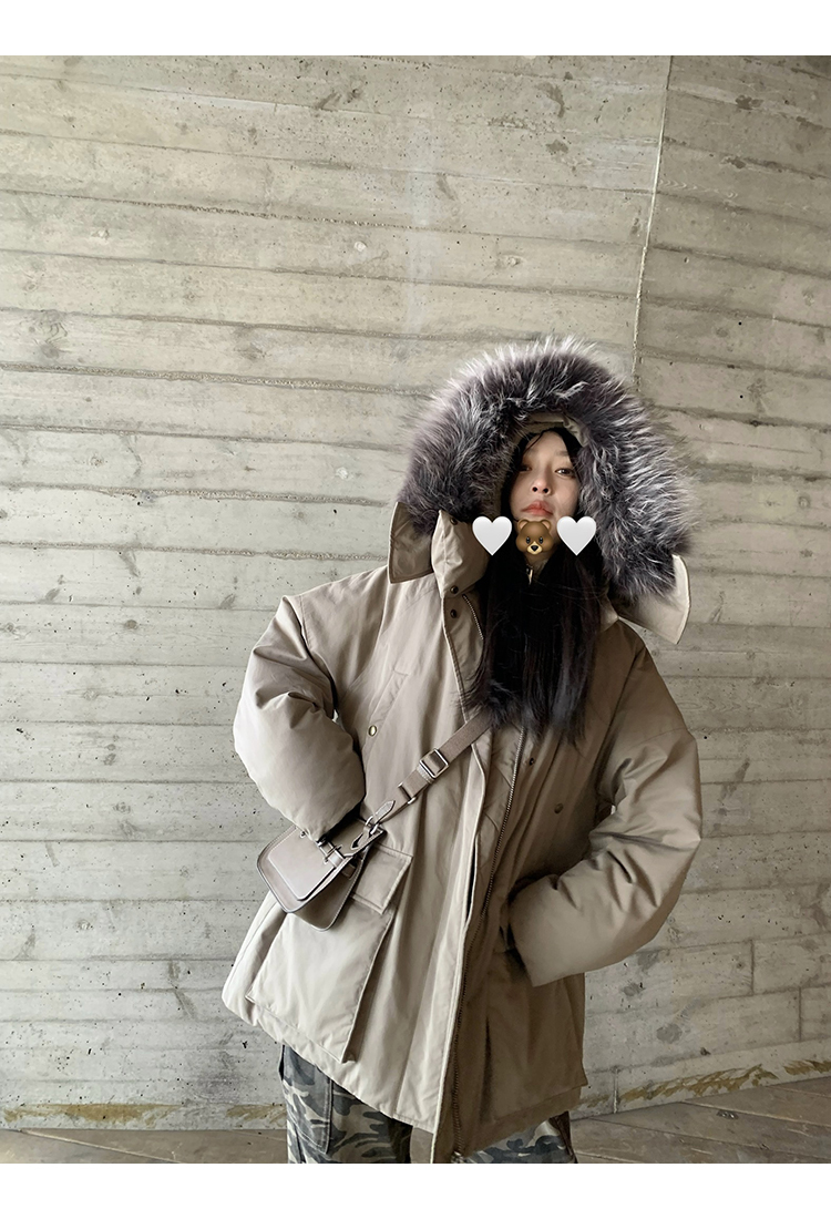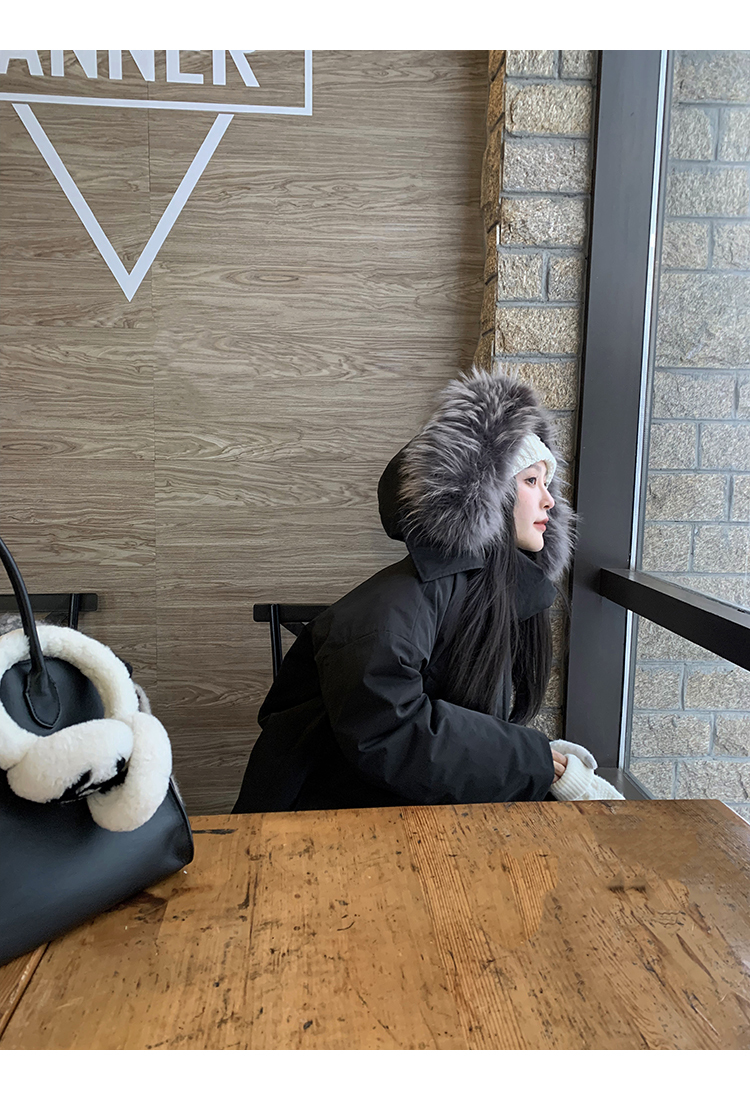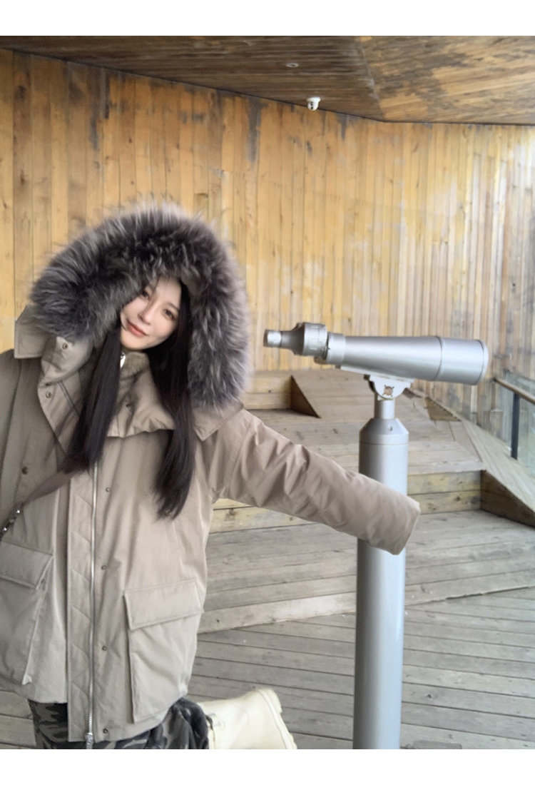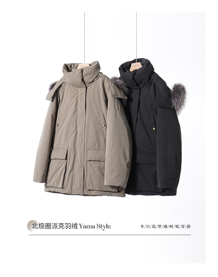 领型设计可拆卸帽子+可拆卸定染貉子毛领,工装感和可爱版型上身不显臃肿