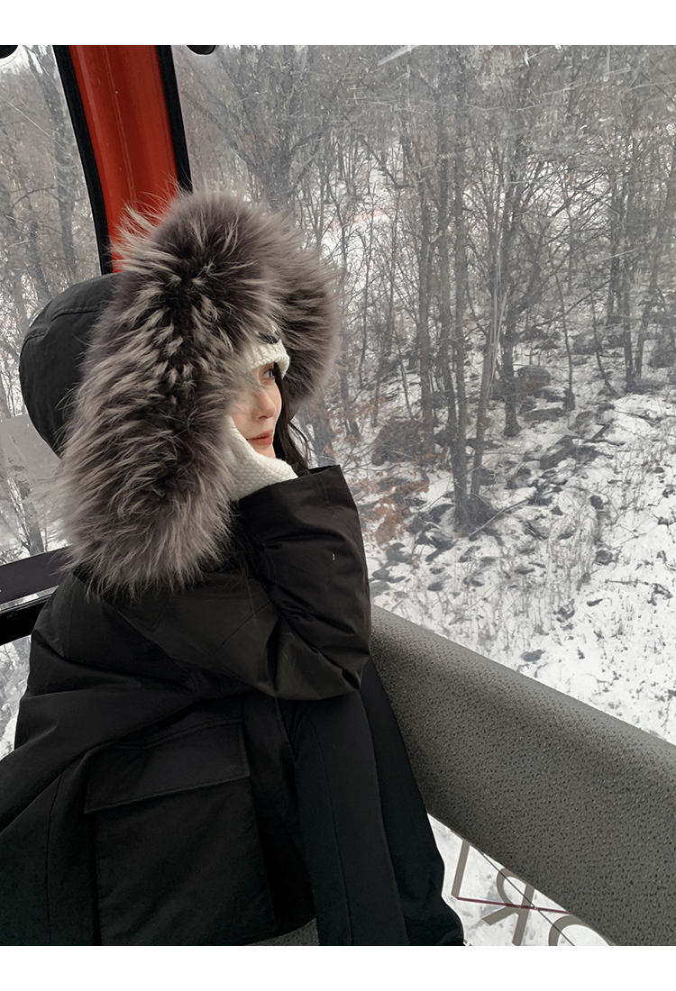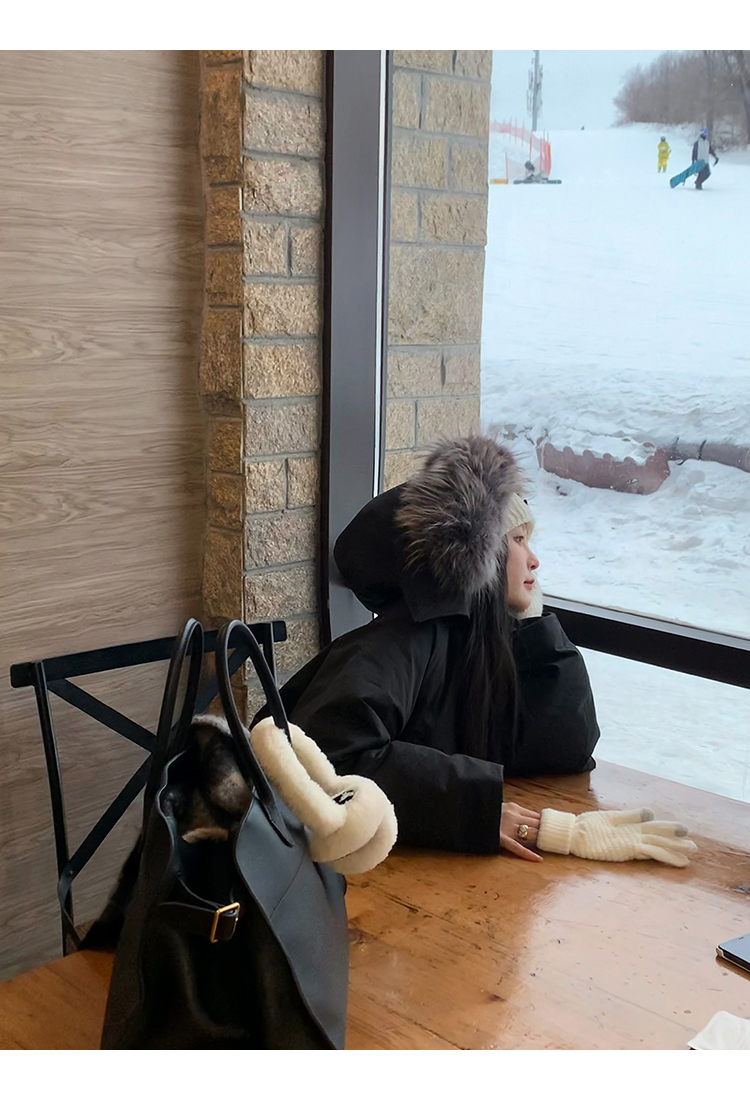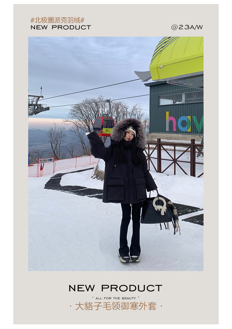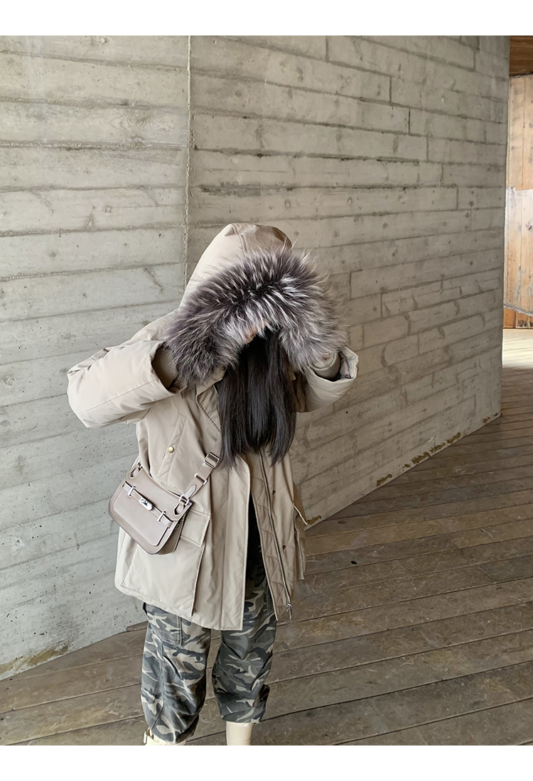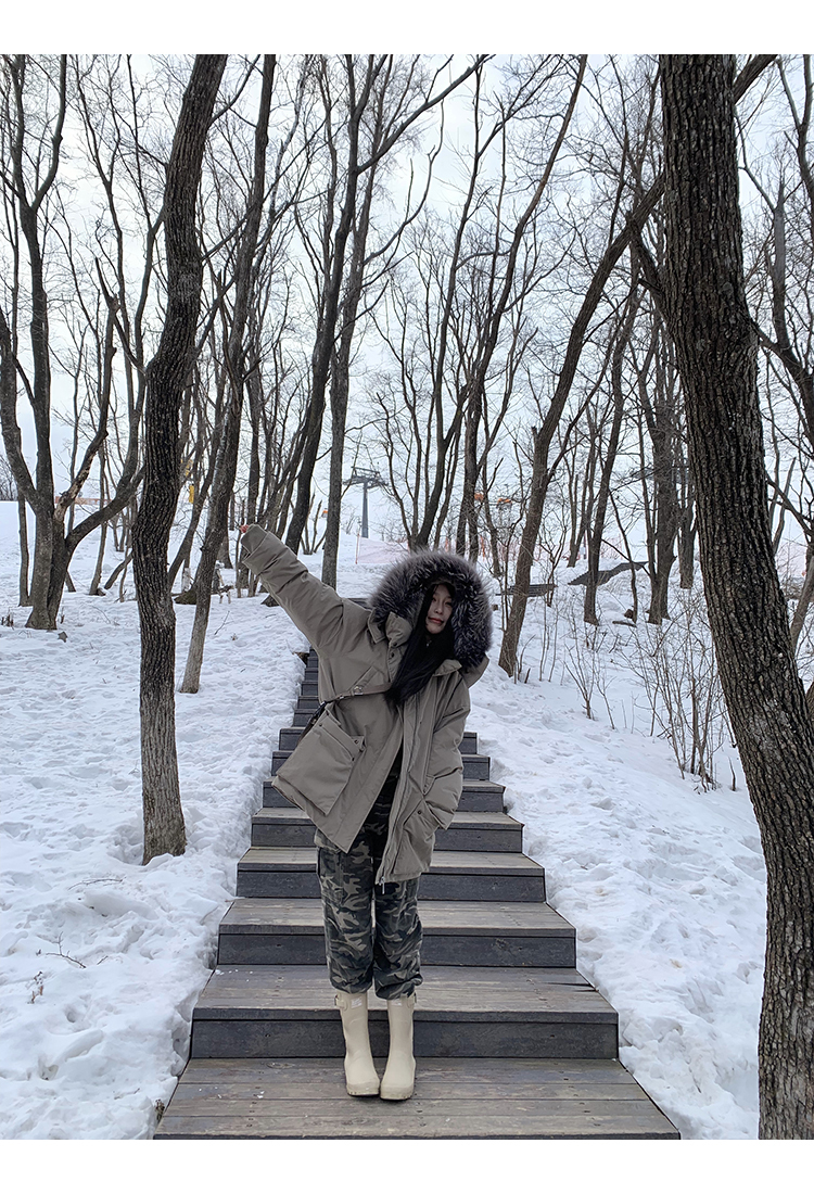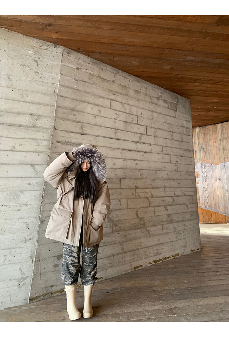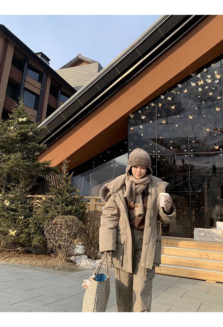 领型设计可拆卸帽子+可拆卸定染貉子毛领,工装感和可爱版型上身不显臃肿