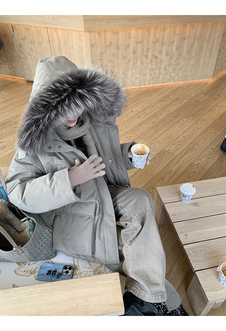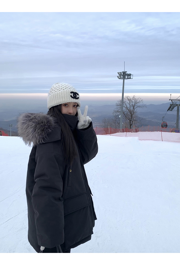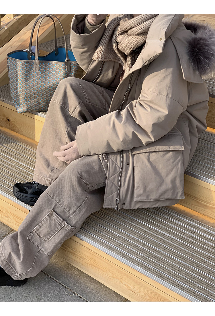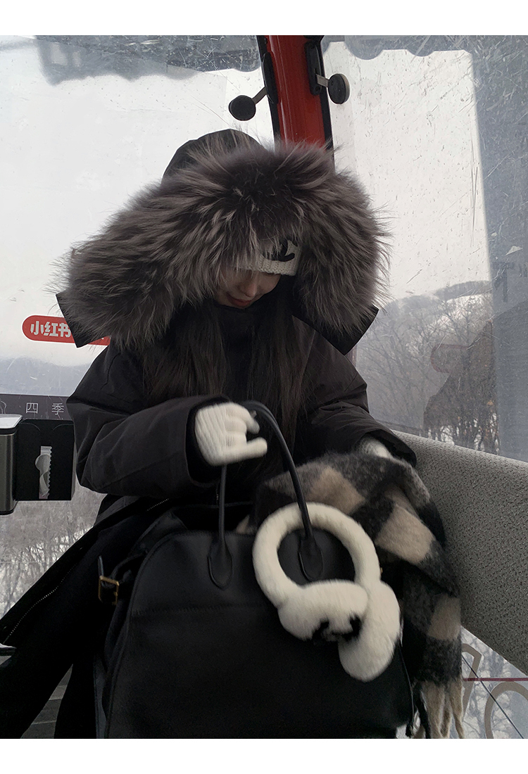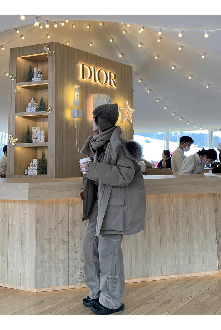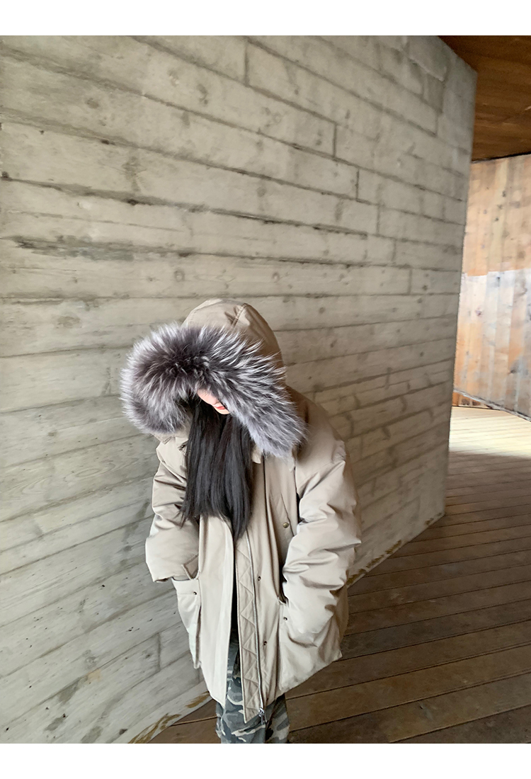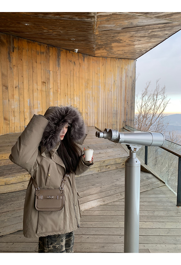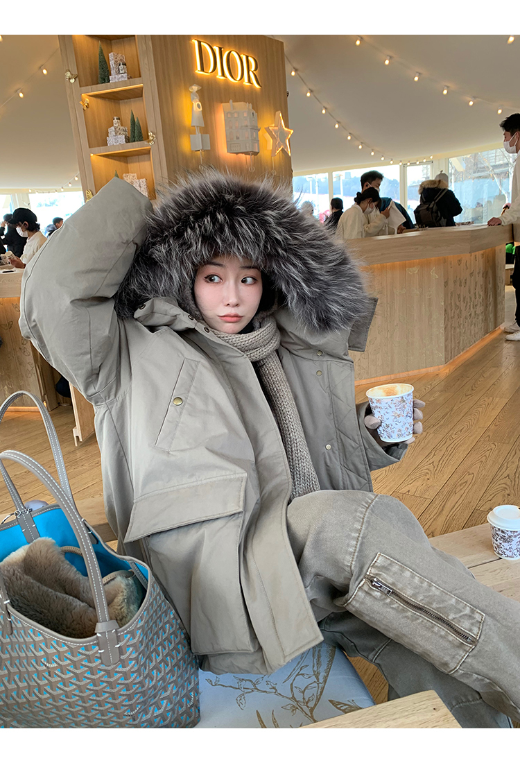 领型设计可拆卸帽子+可拆卸定染貉子毛领,工装感和可爱版型上身不显臃肿