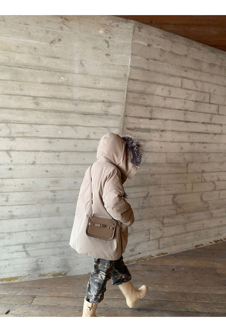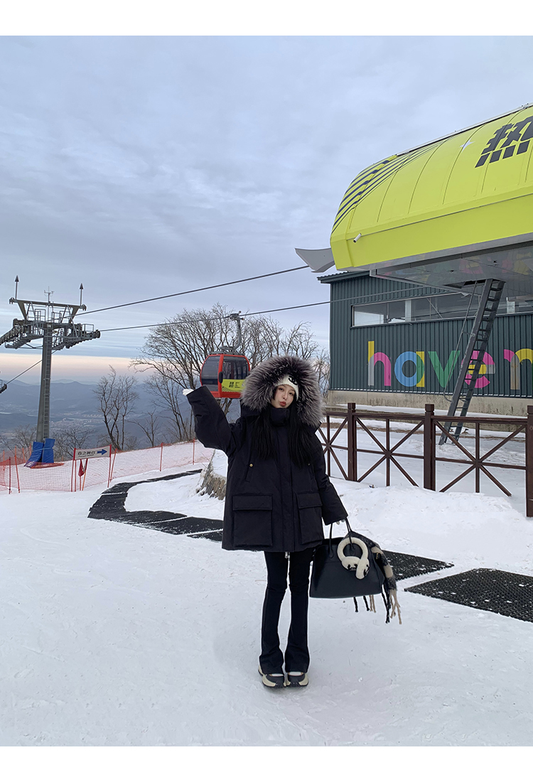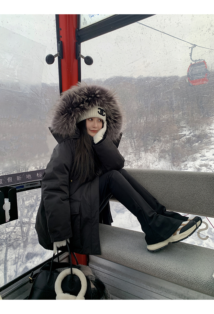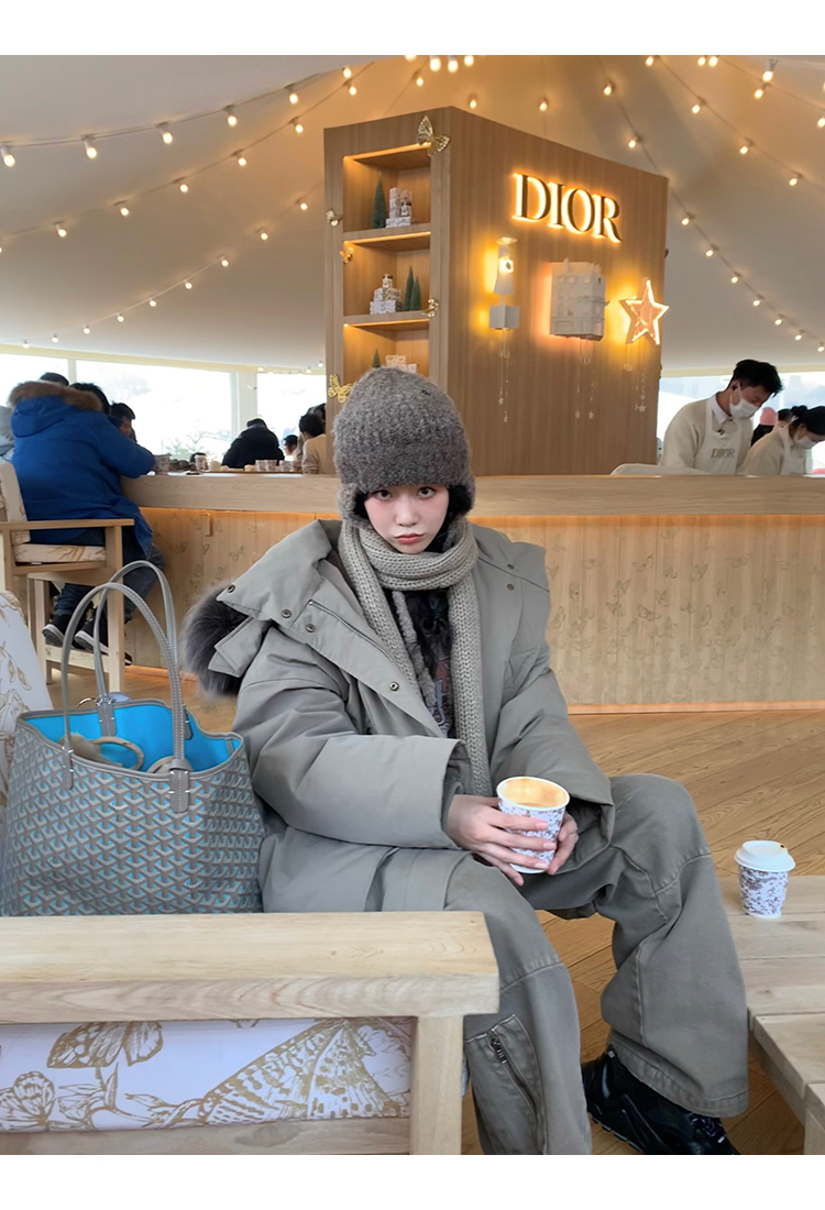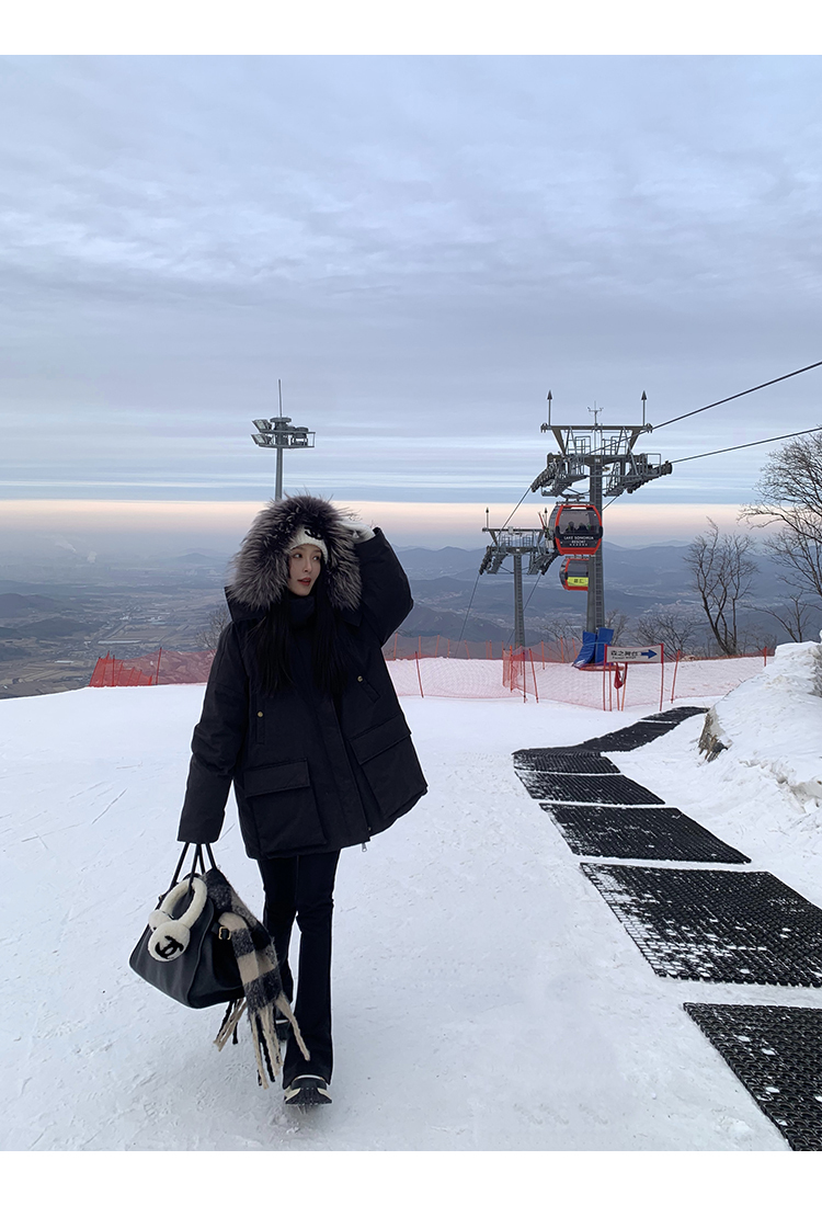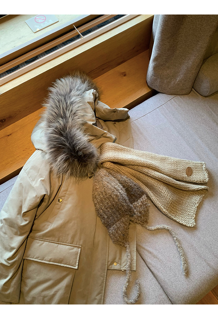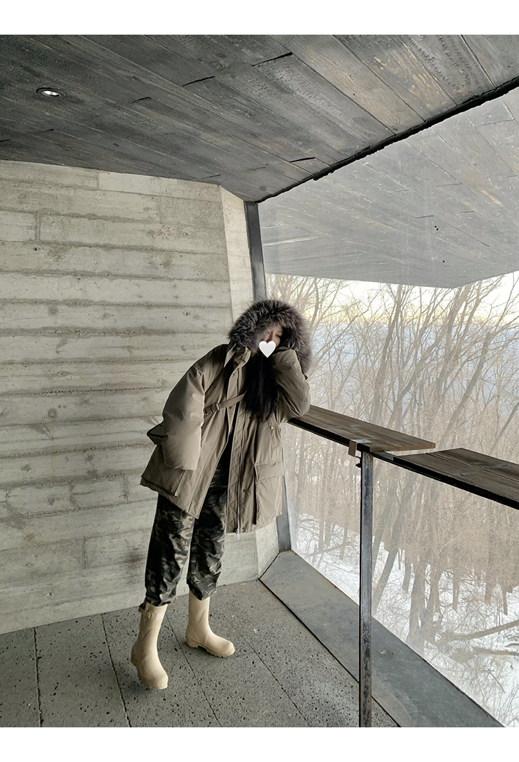 领型设计可拆卸帽子+可拆卸定染貉子毛领,工装感和可爱版型上身不显臃肿