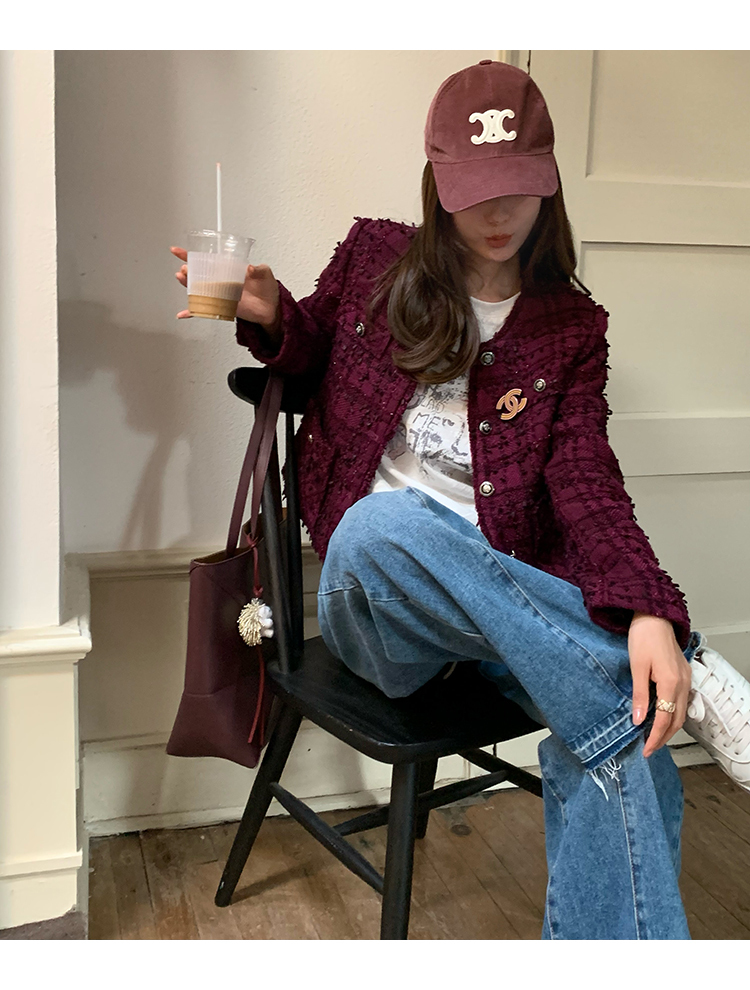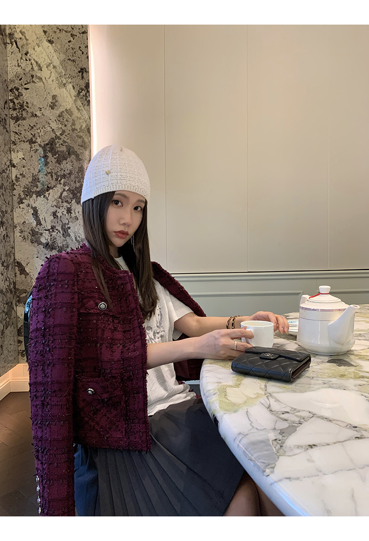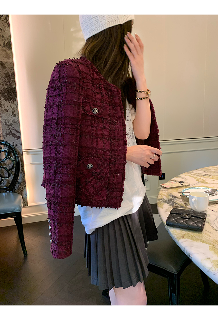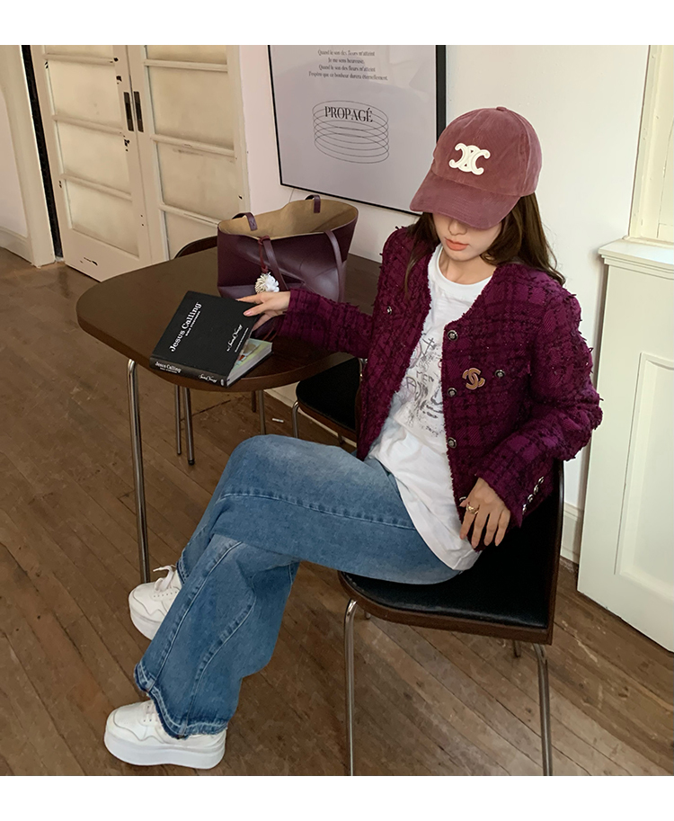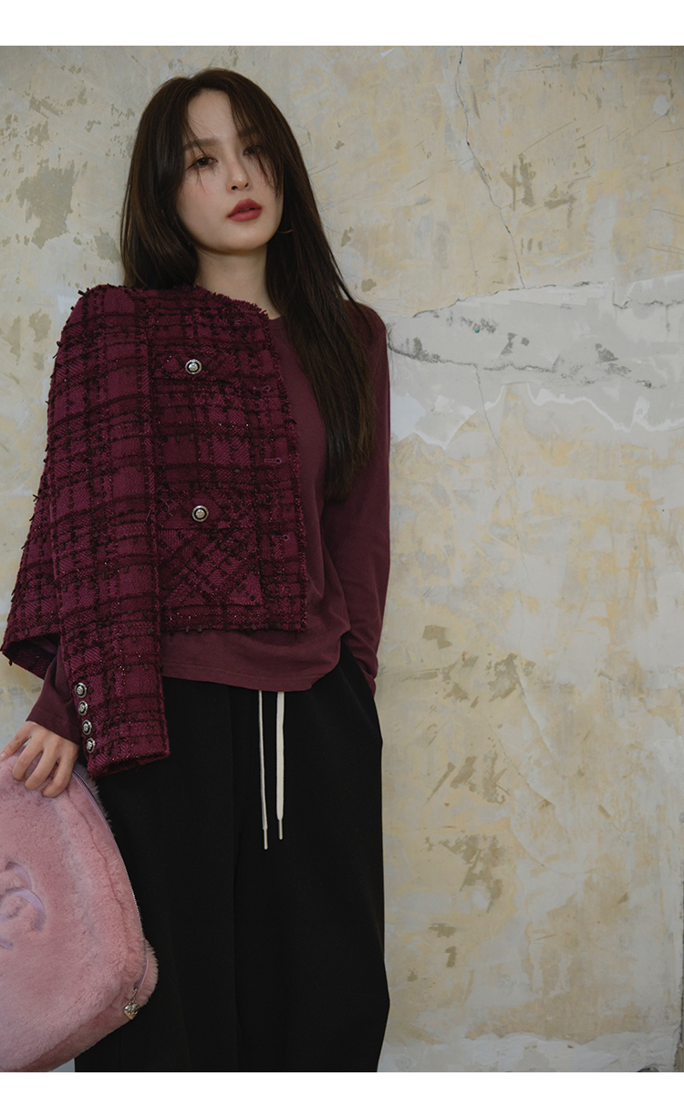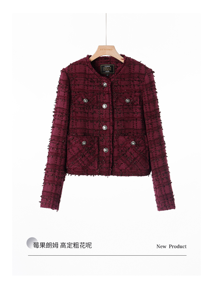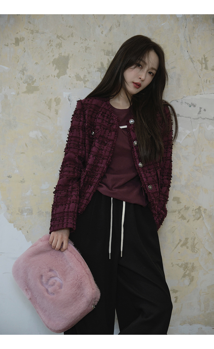 這款粗花呢短外套高芨顯質感,休閒的拉毛邊設計細節滿滿,