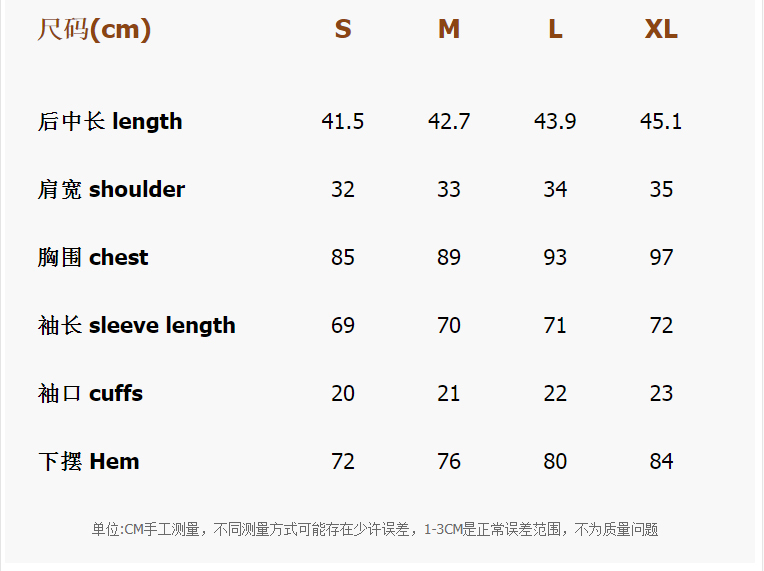 衣長/肩寬/袖長為平量,其他為一圈(單位:公分)