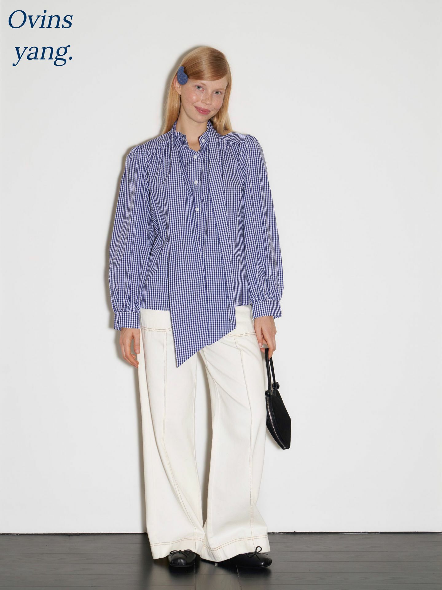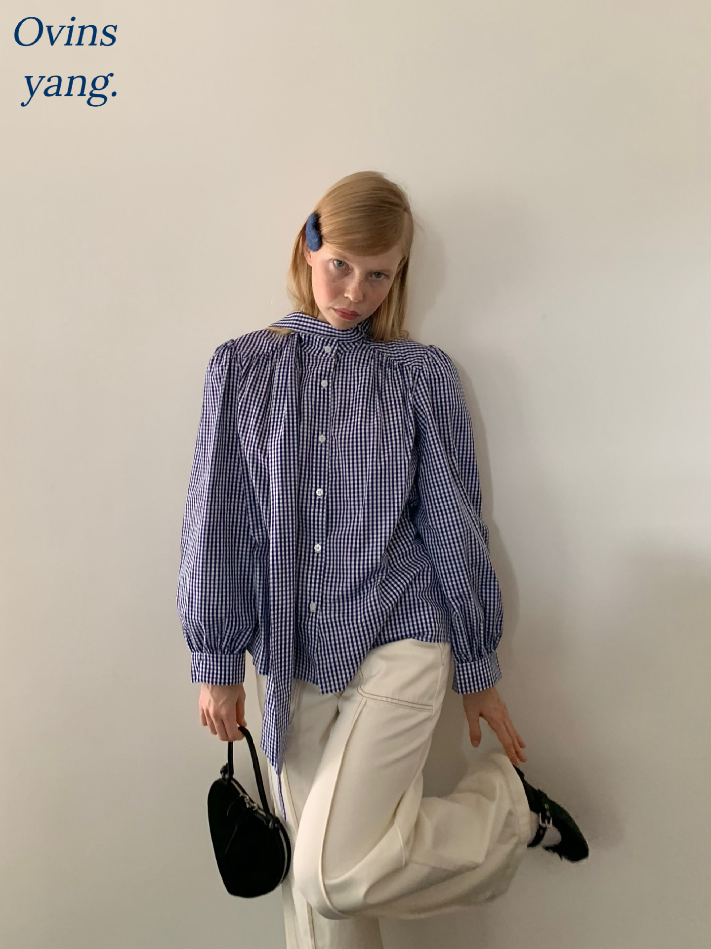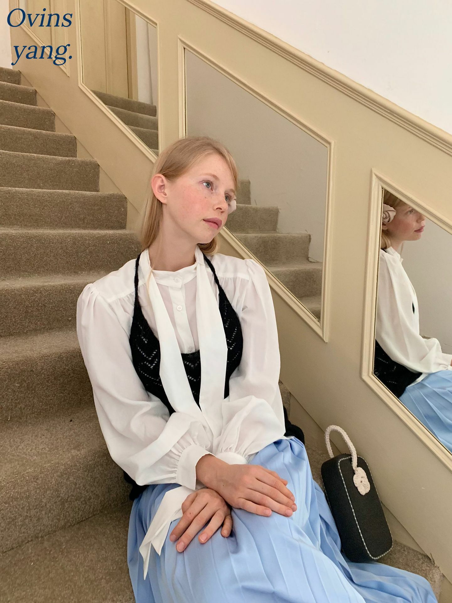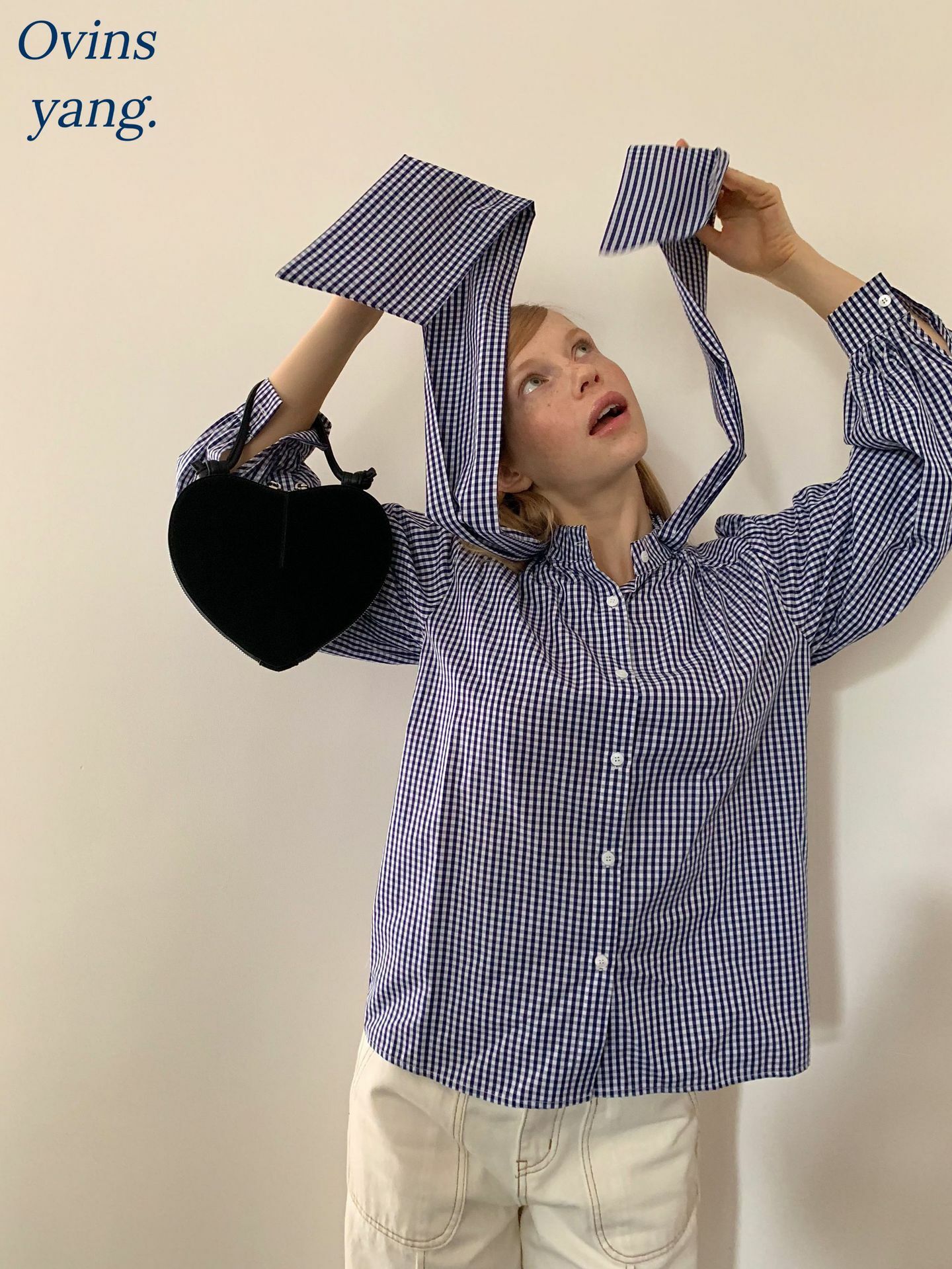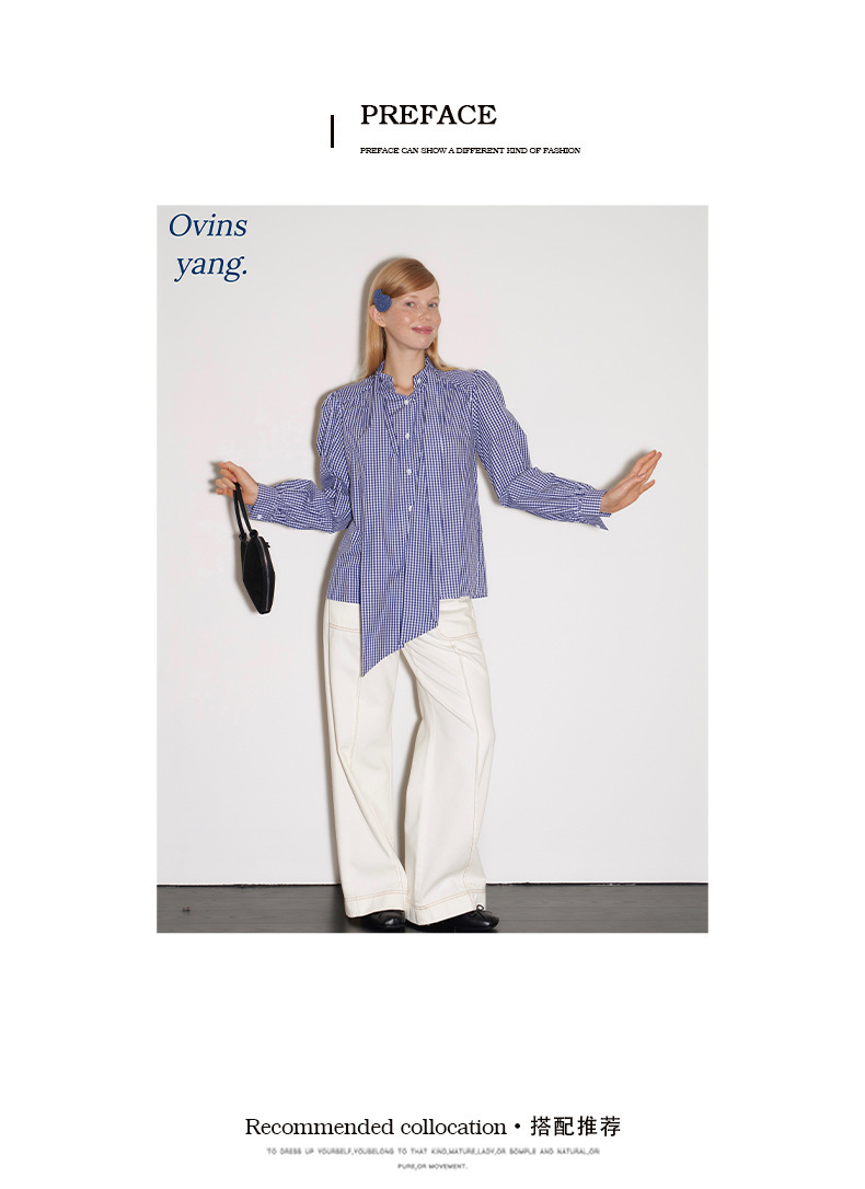 *o-ha-you*【FOY100159】繫帶白色格紋襯衫上衣設計感小眾甜美休閒長袖襯衫-2色-如有需要請先諮詢
