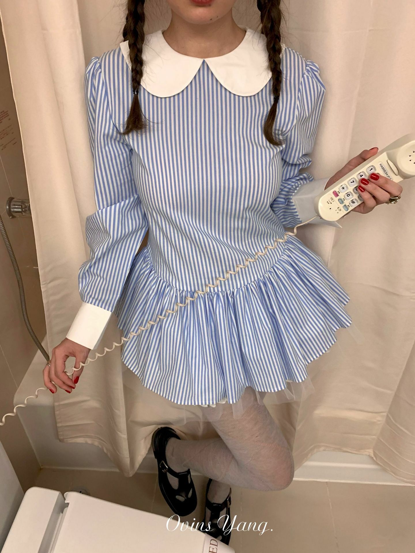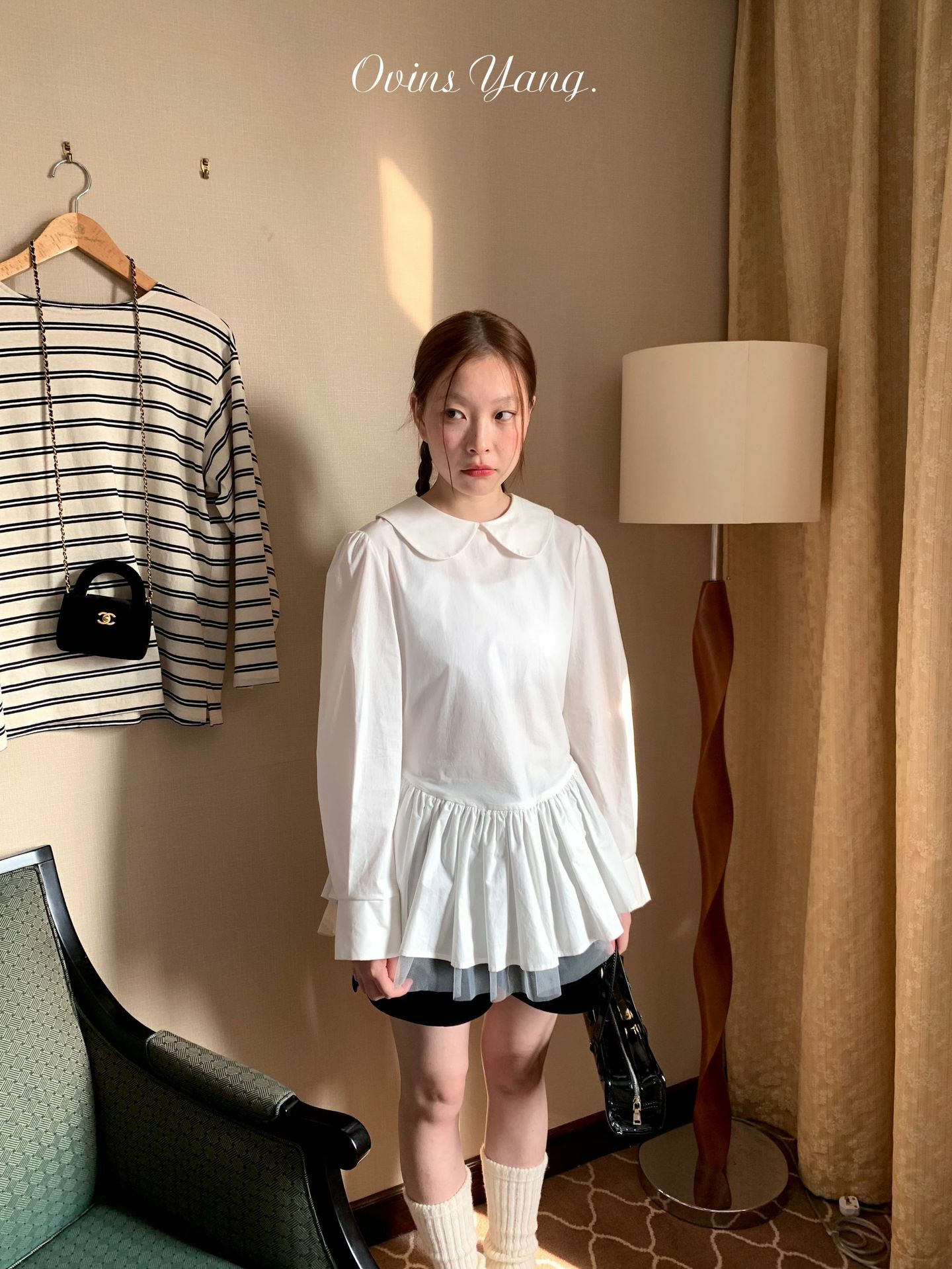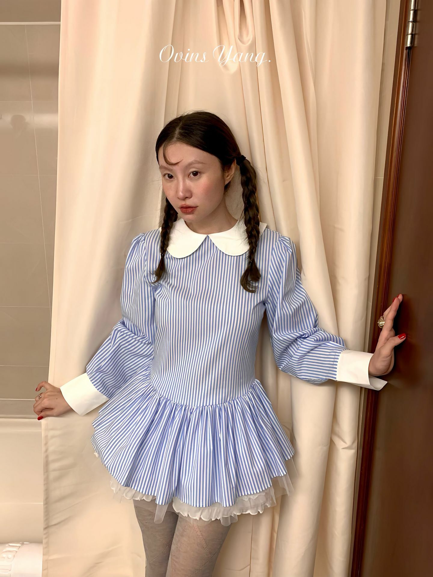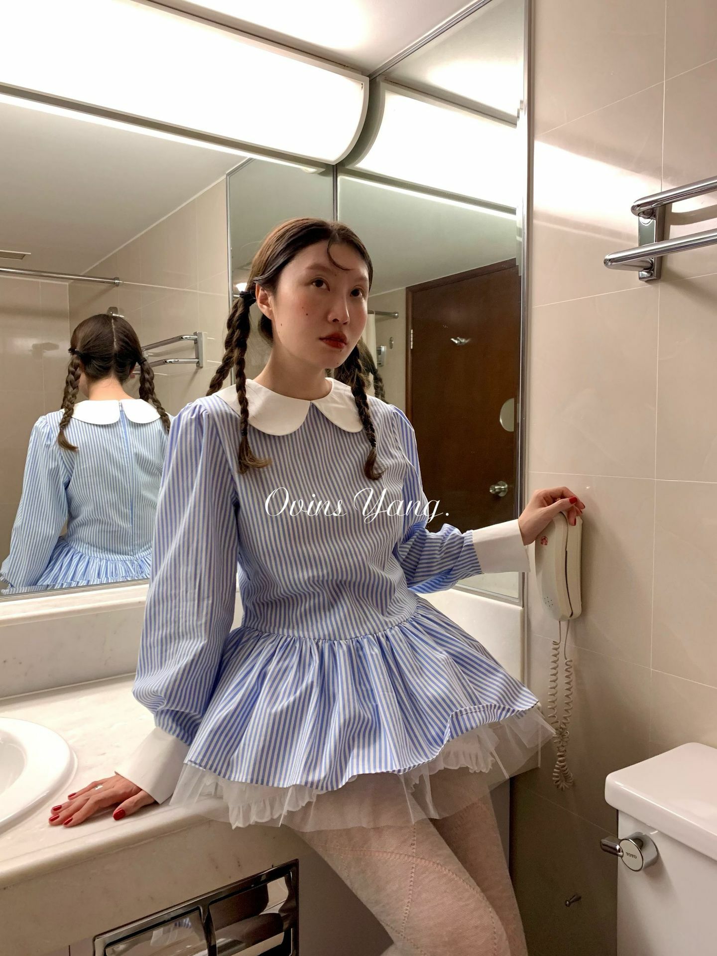 *o-ha-you*【FOY100169】條紋白襯衫秋冬設計感小眾甜美穿搭減齡娃娃領上衣-2色-如有需要請先諮詢