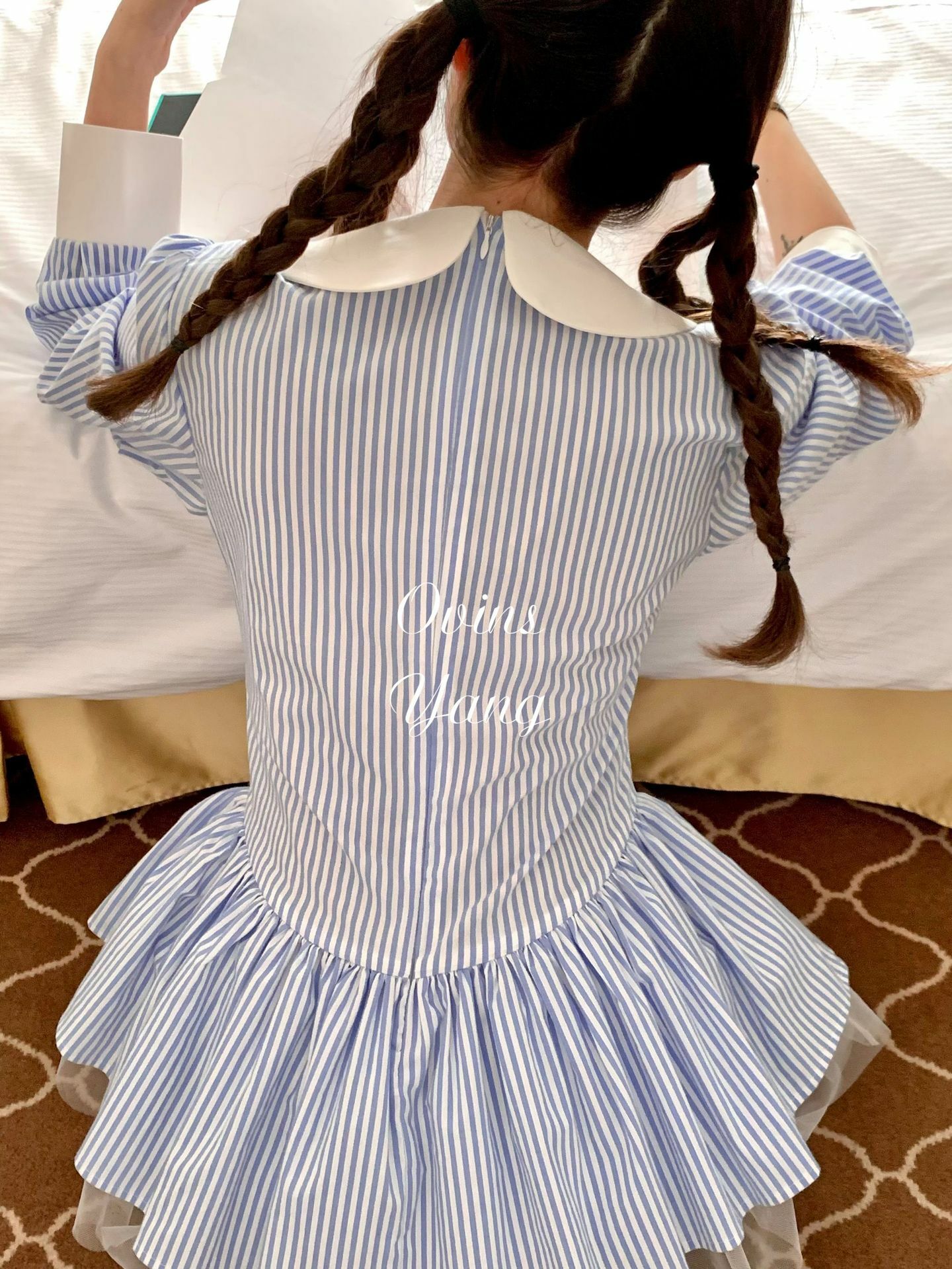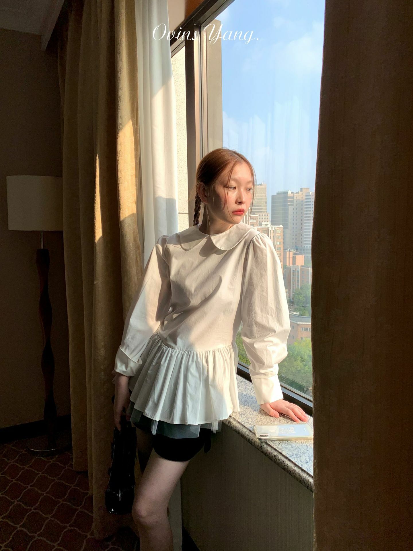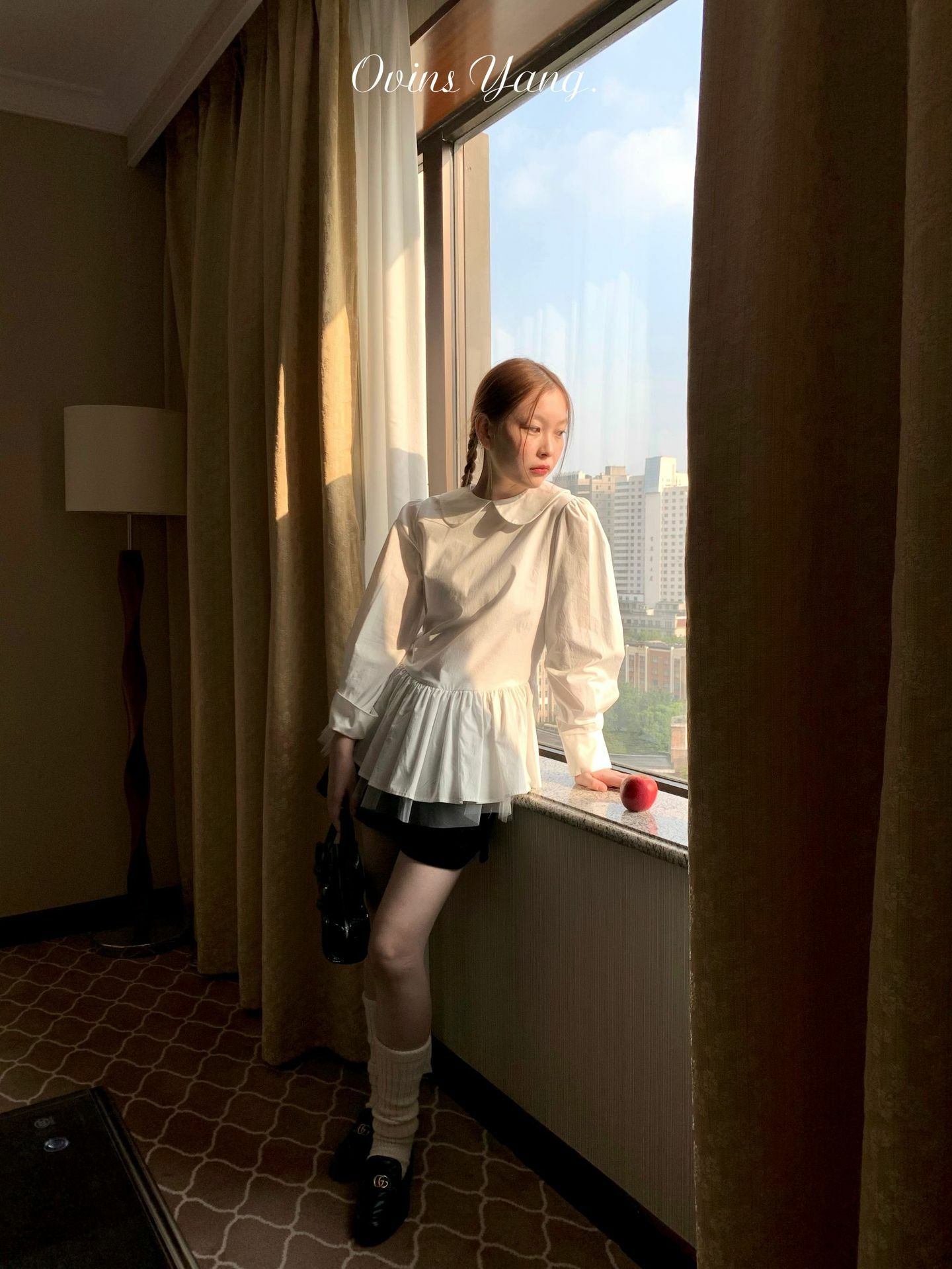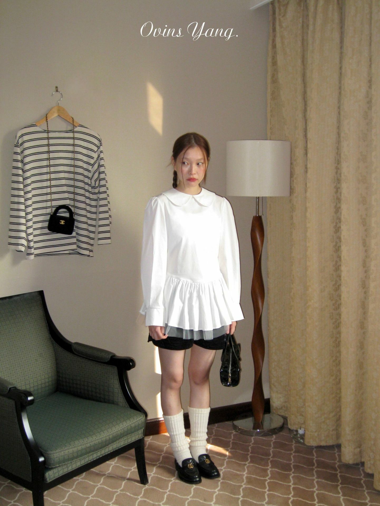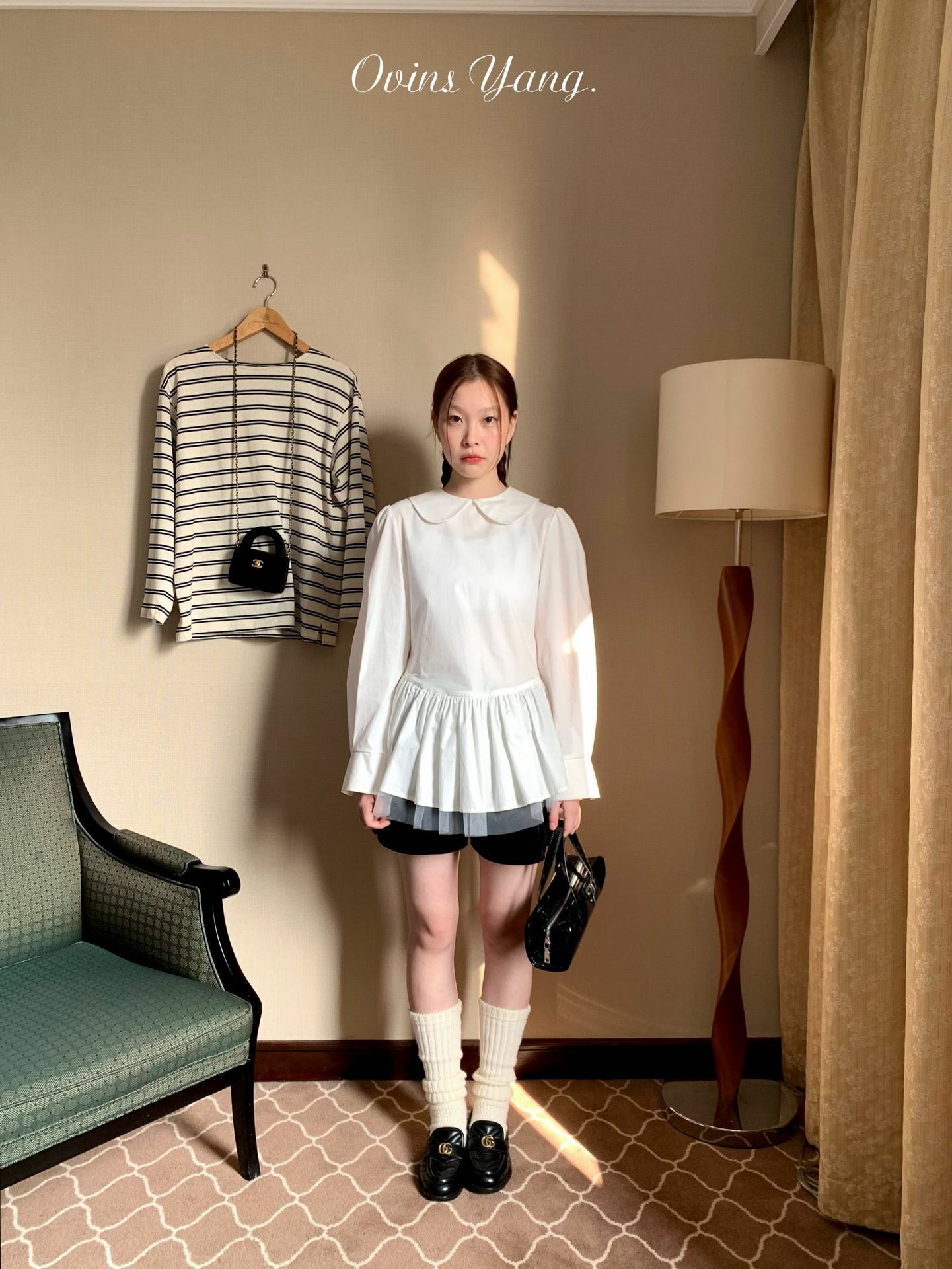 *o-ha-you*【FOY100169】條紋白襯衫秋冬設計感小眾甜美穿搭減齡娃娃領上衣-2色-如有需要請先諮詢
