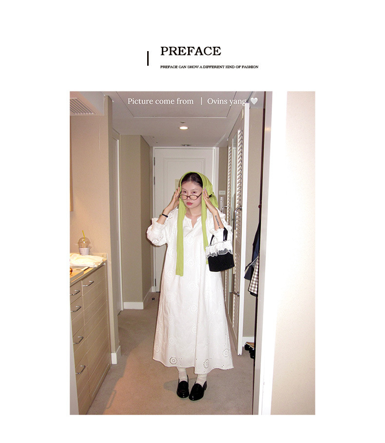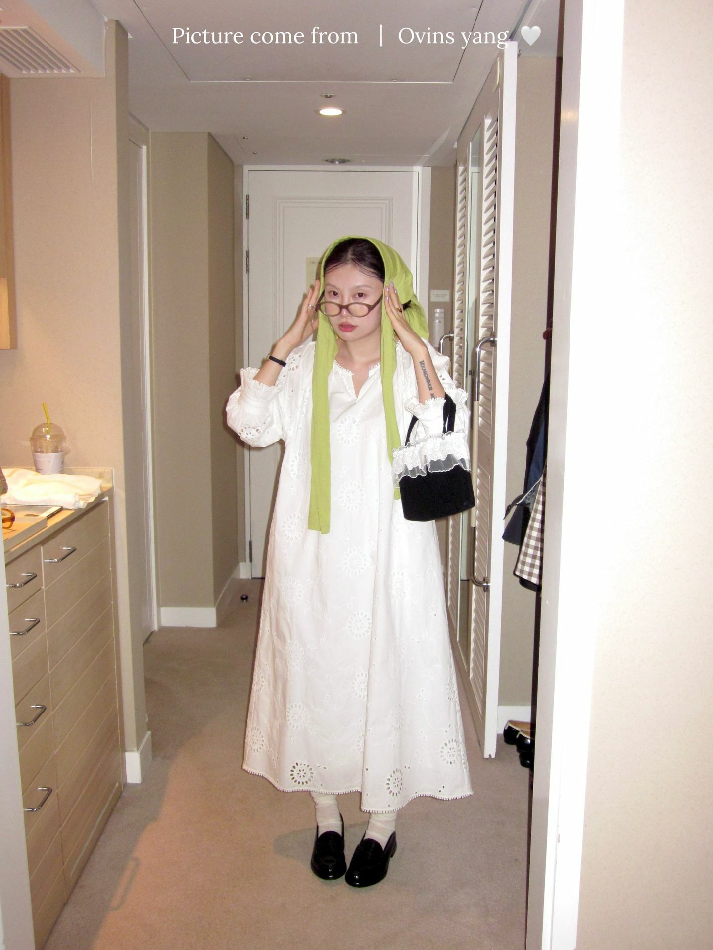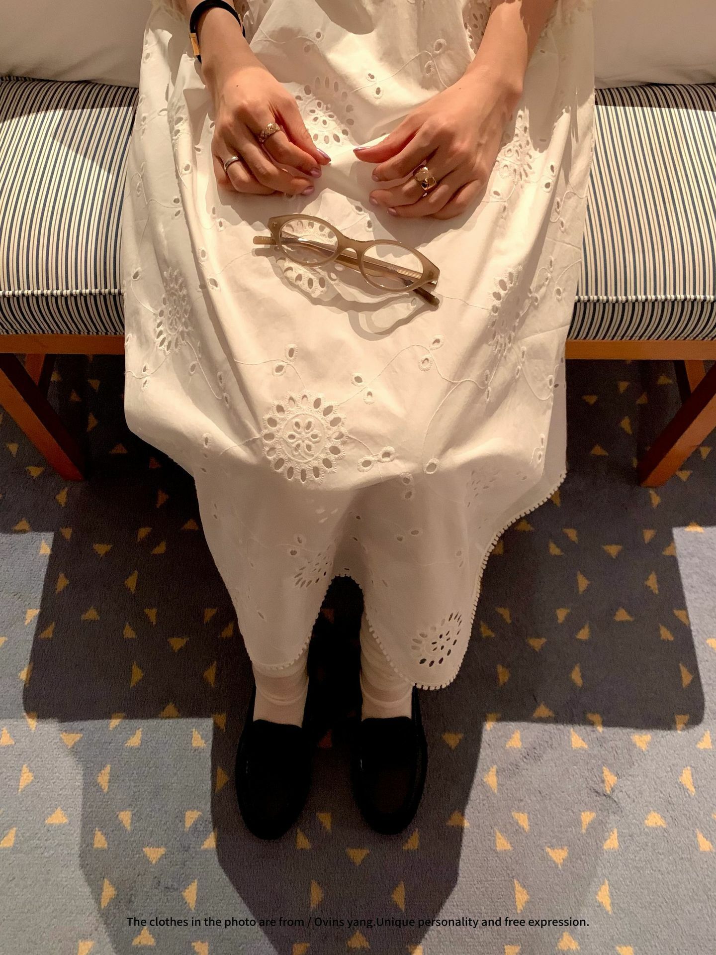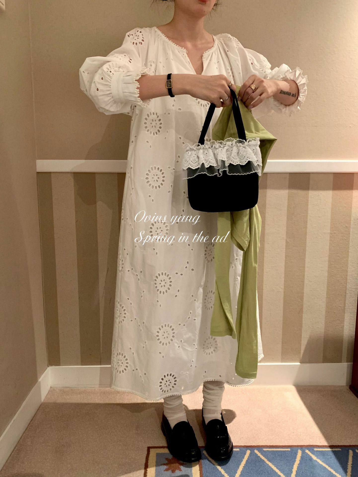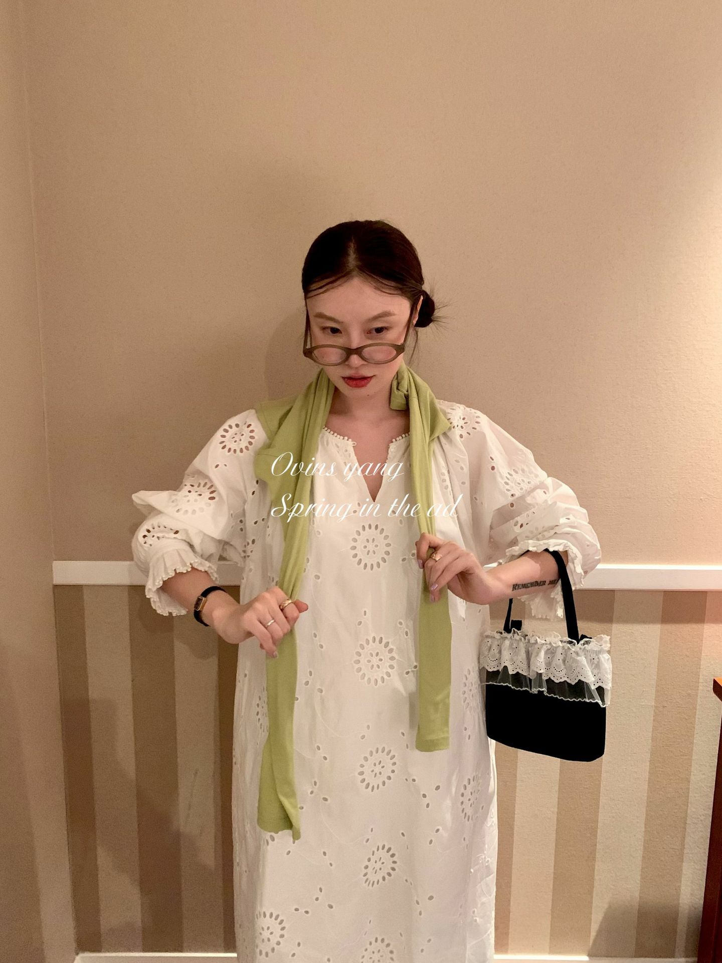 *o-ha-you*【FOY100277】白色繡花連衣裙春秋設計感小眾高級感精緻穿搭中長裙洋裝-如有需要請先諮詢
