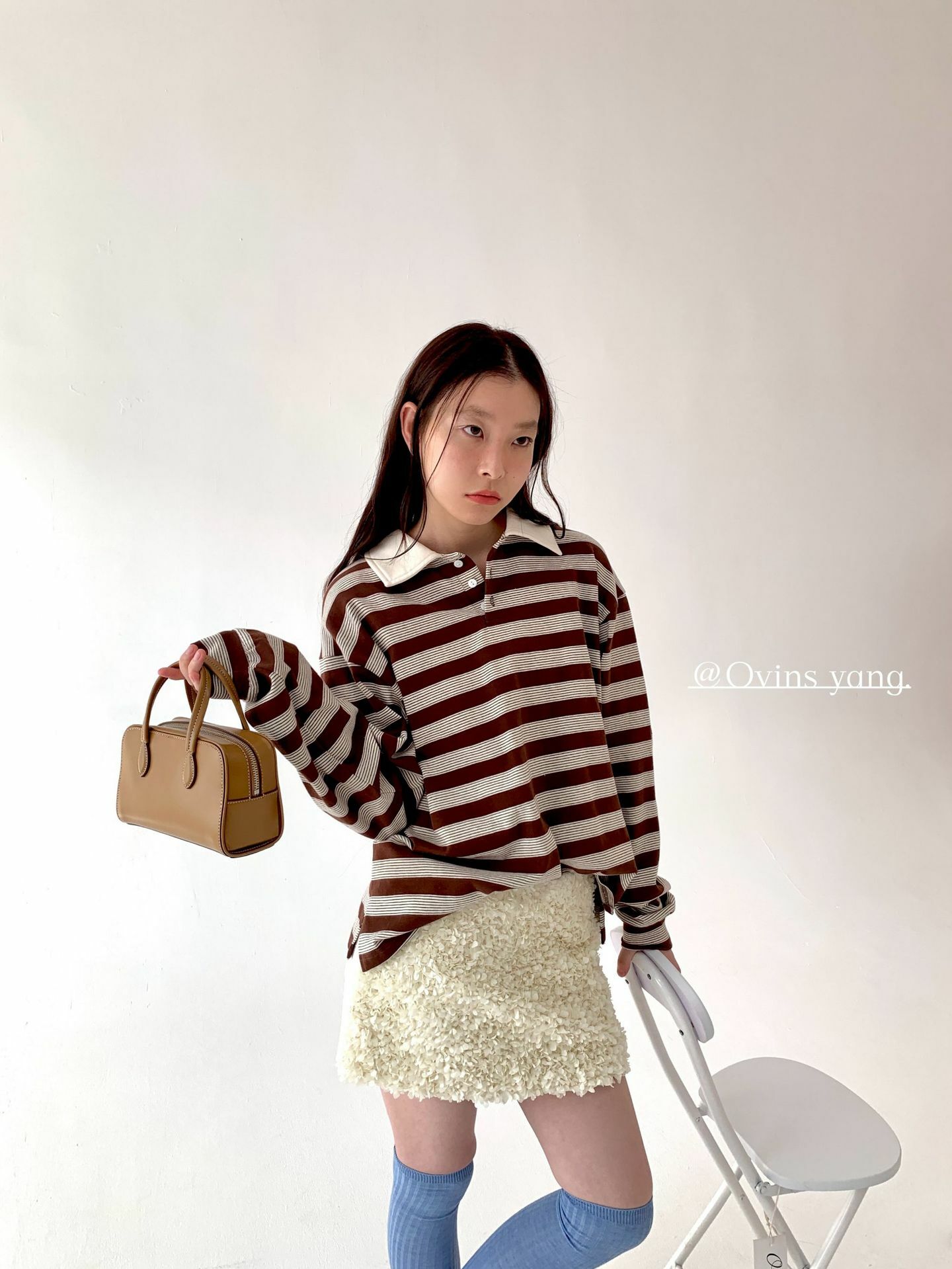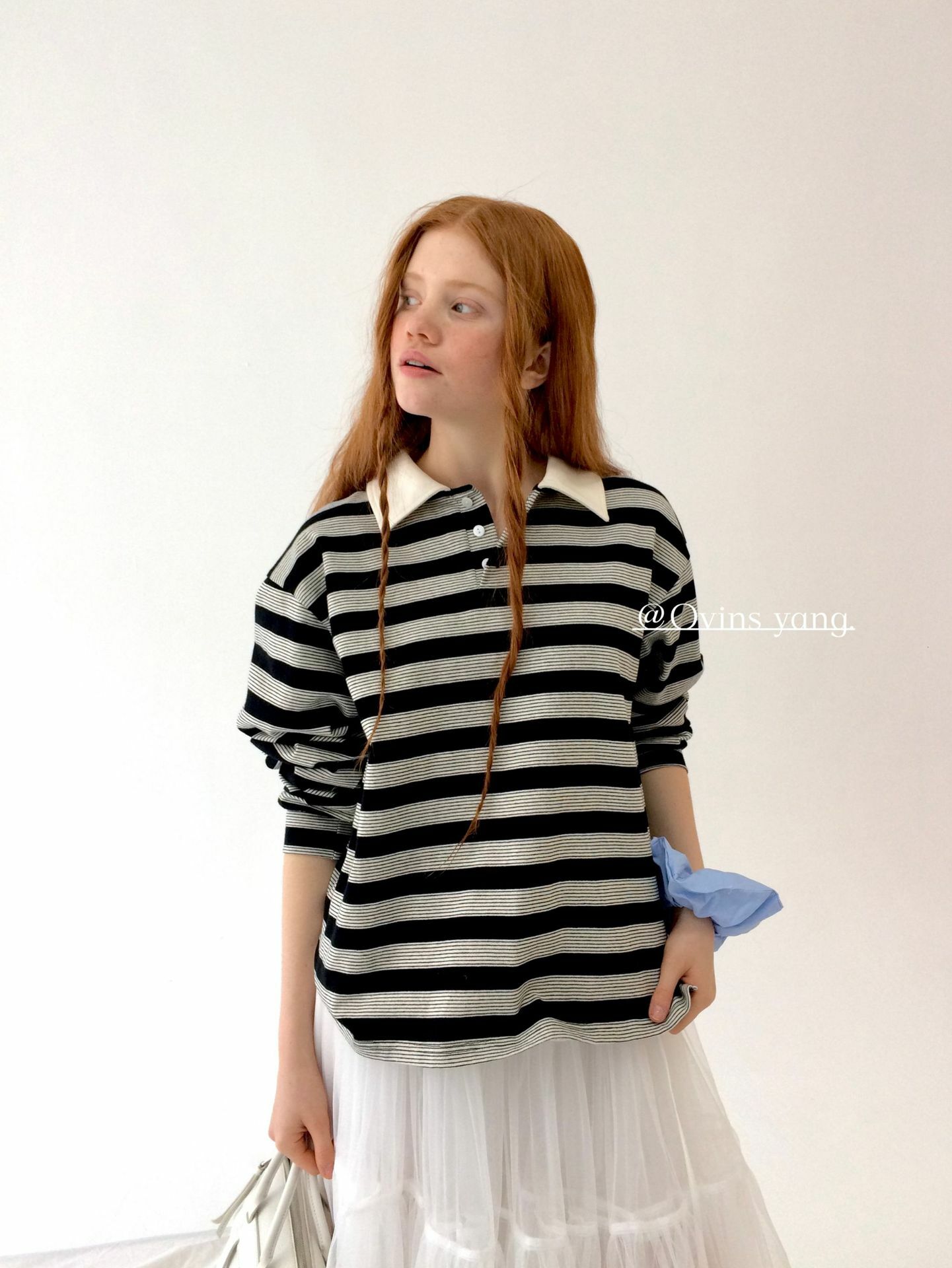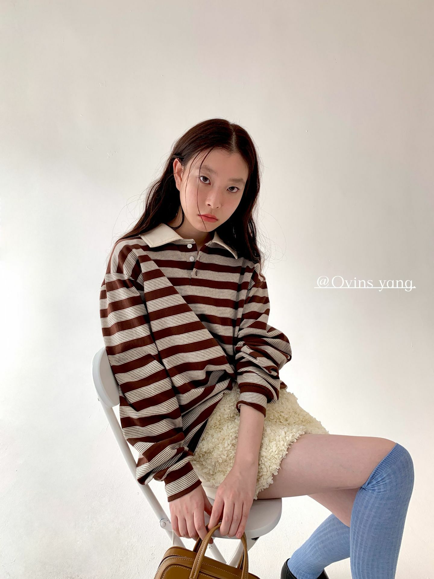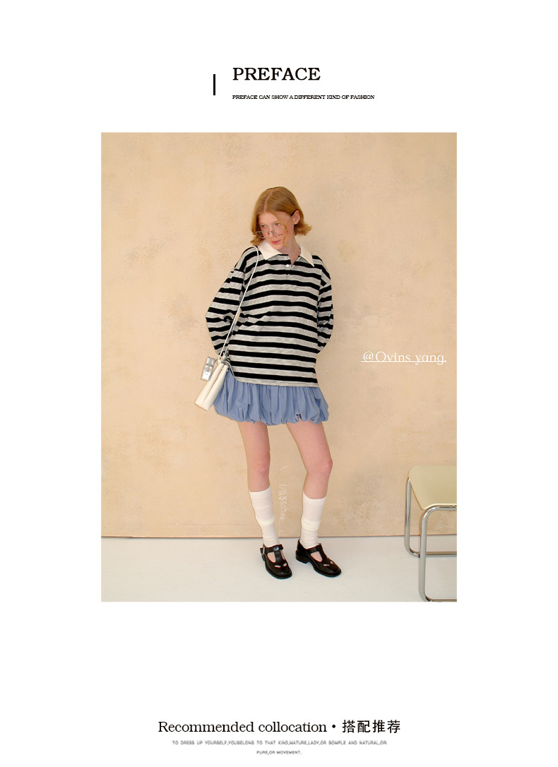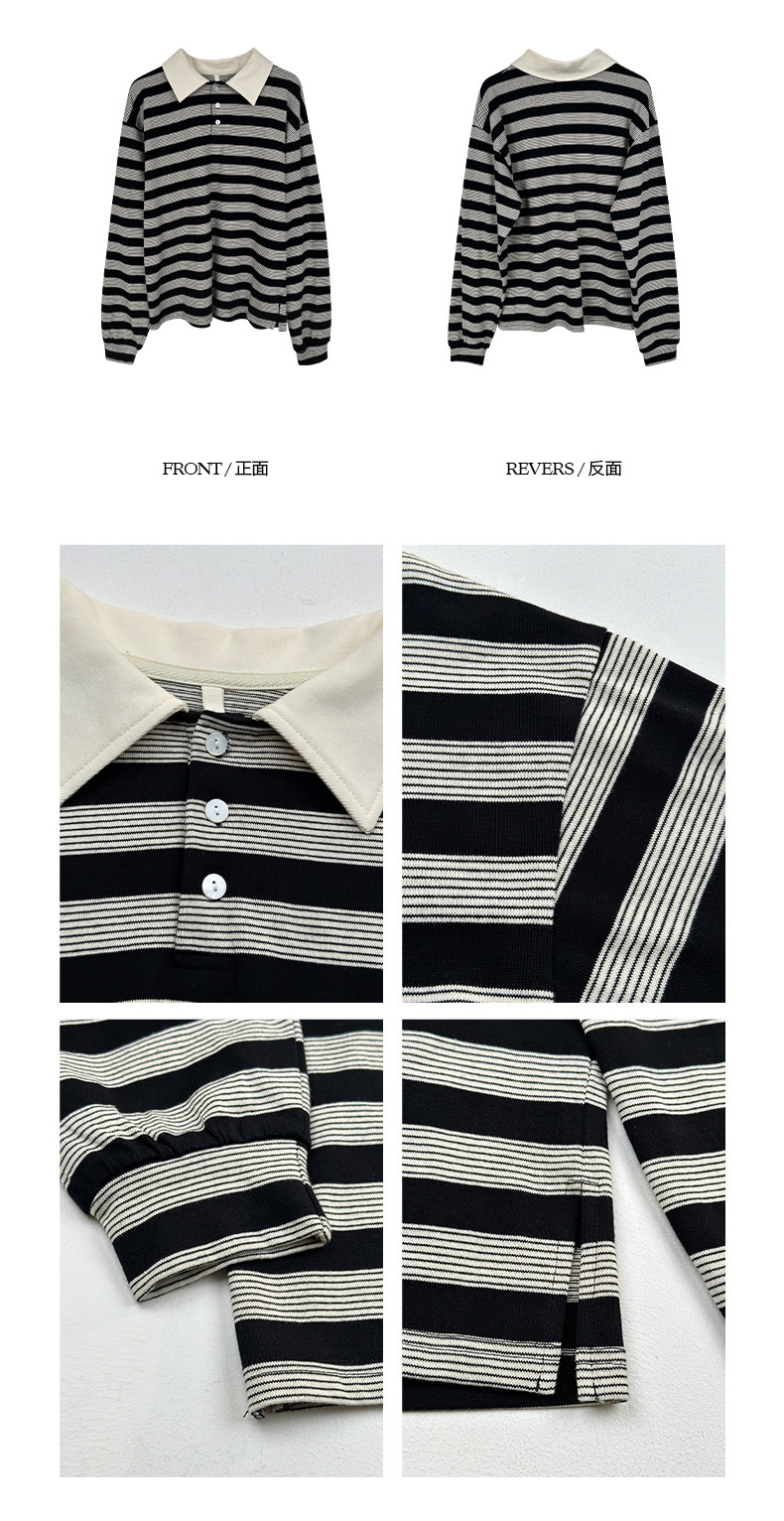 *o-ha-you*【FOY100350】條紋polo衫純棉休閒復古寬鬆慵懶風打底衫長袖上衣-2色-如有需要請先諮詢