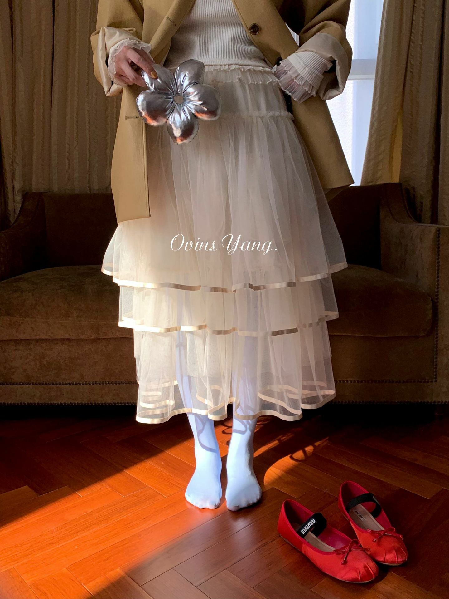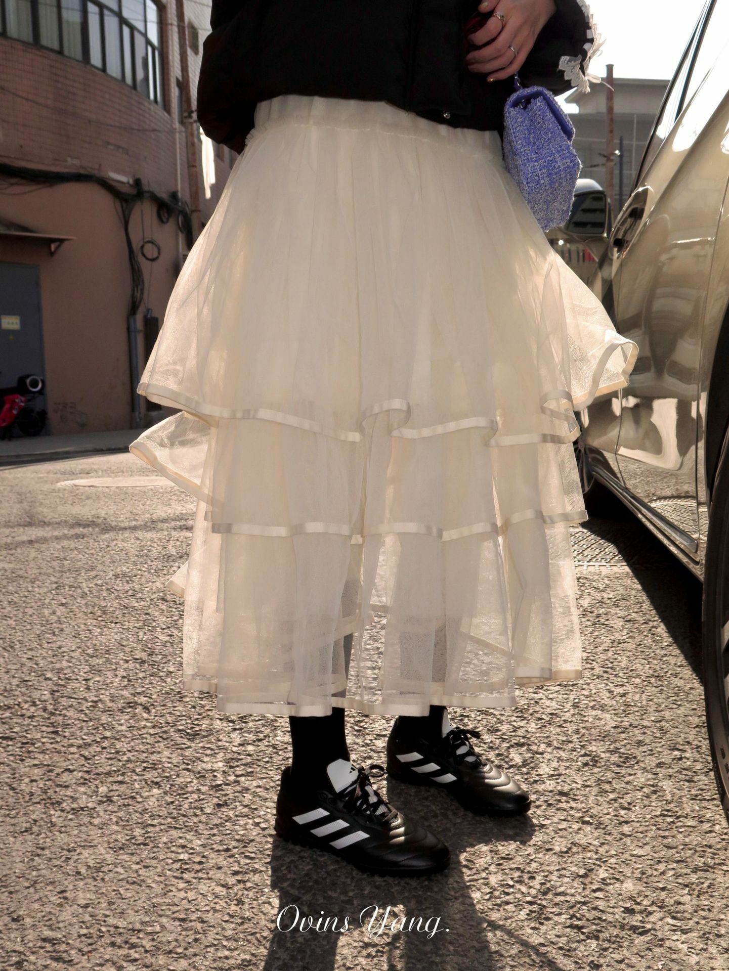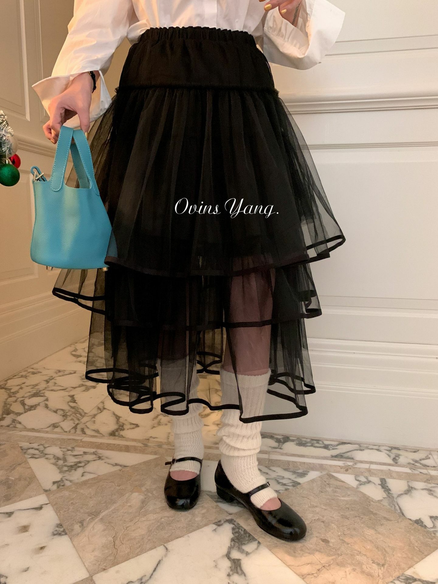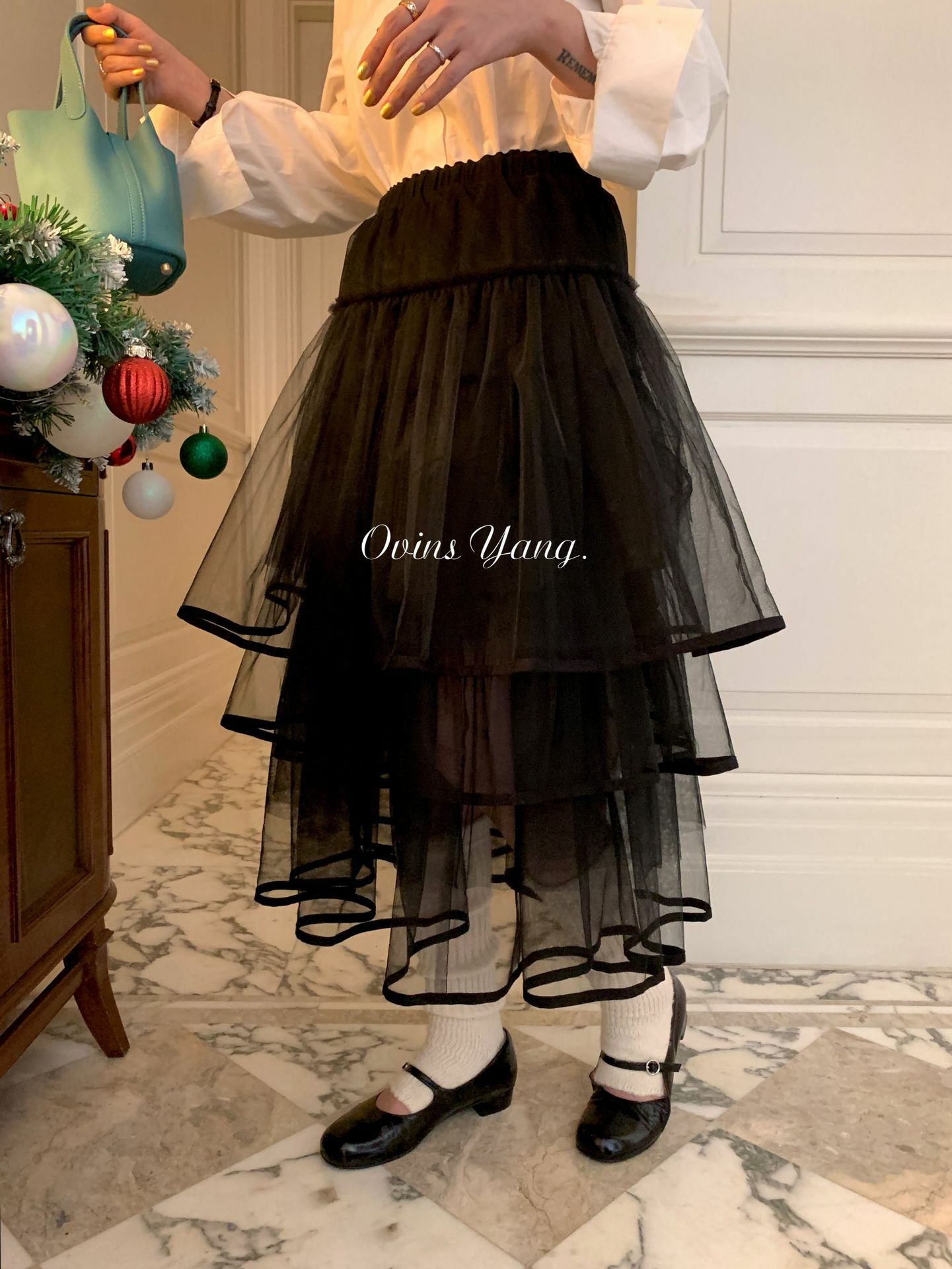 *o-ha-you*【FOY100521】網紗黑色半身裙2024新款秋冬款減齡穿搭百褶裙蛋糕裙-2色-杏色有現貨