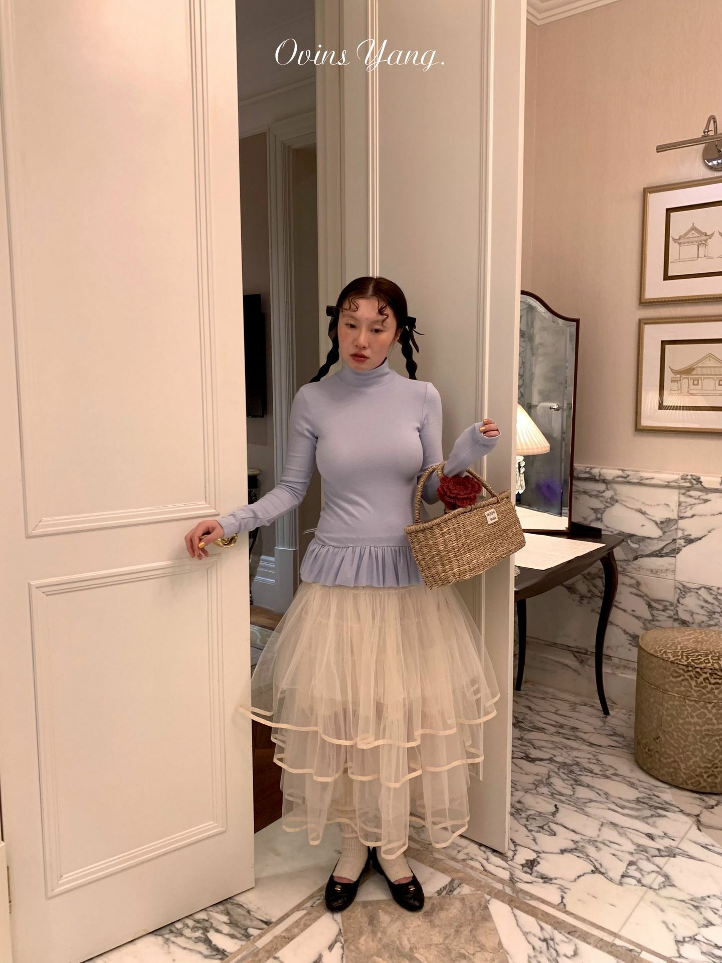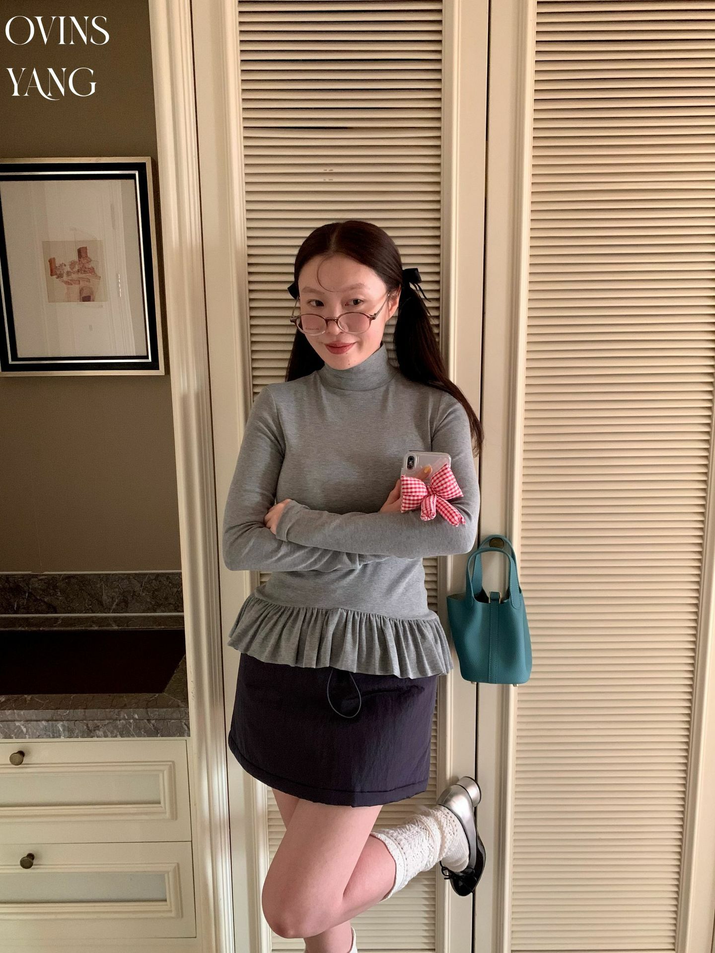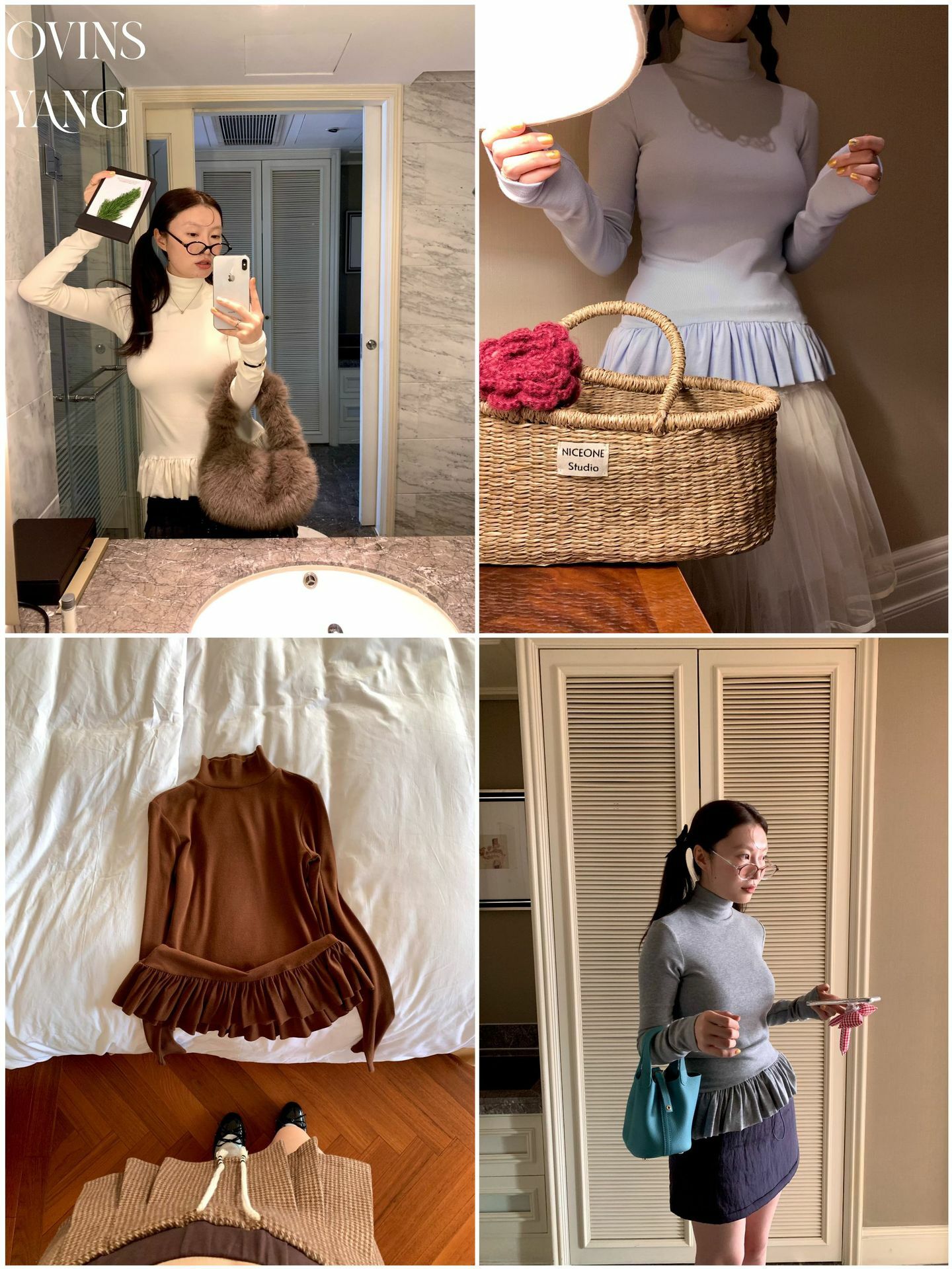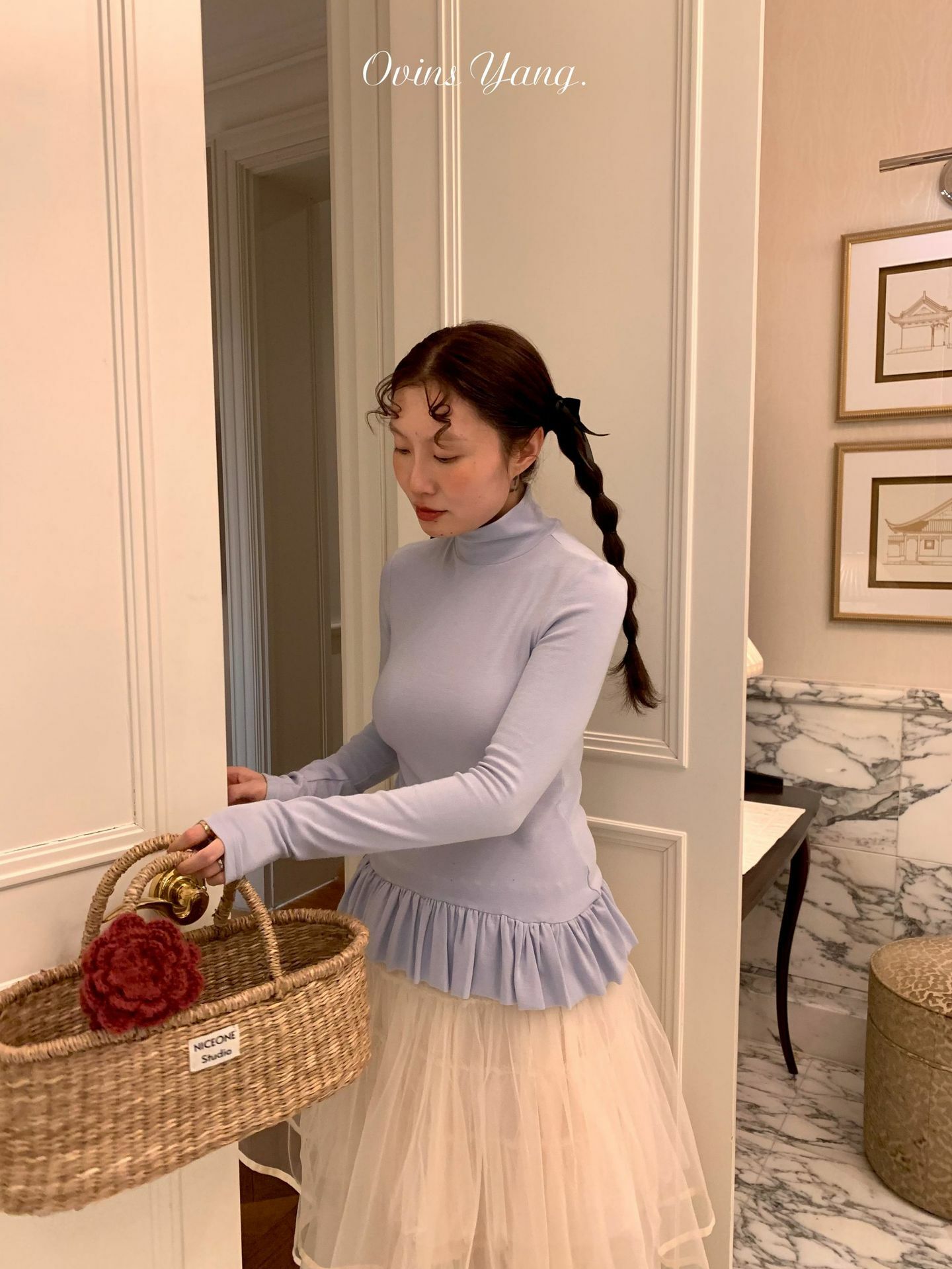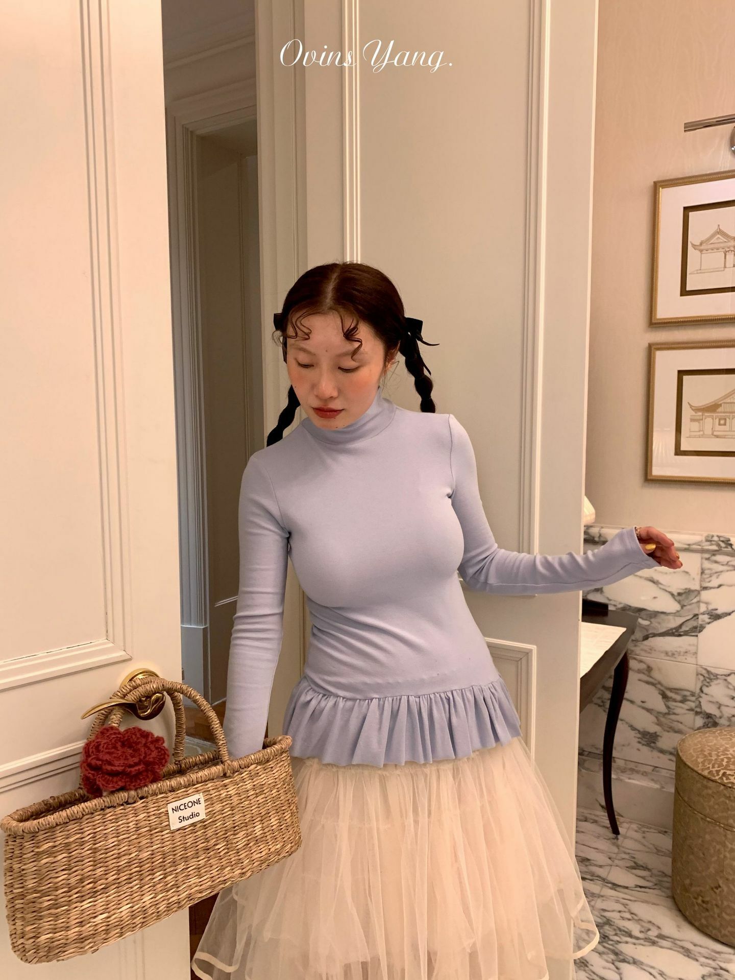 *o-ha-you*【FOY100595】花邊下擺半高領打底衫女秋冬長袖T恤內搭修身疊穿上衣-4色-如有需要請先諮詢