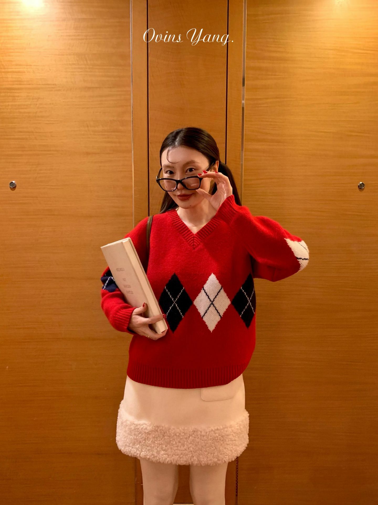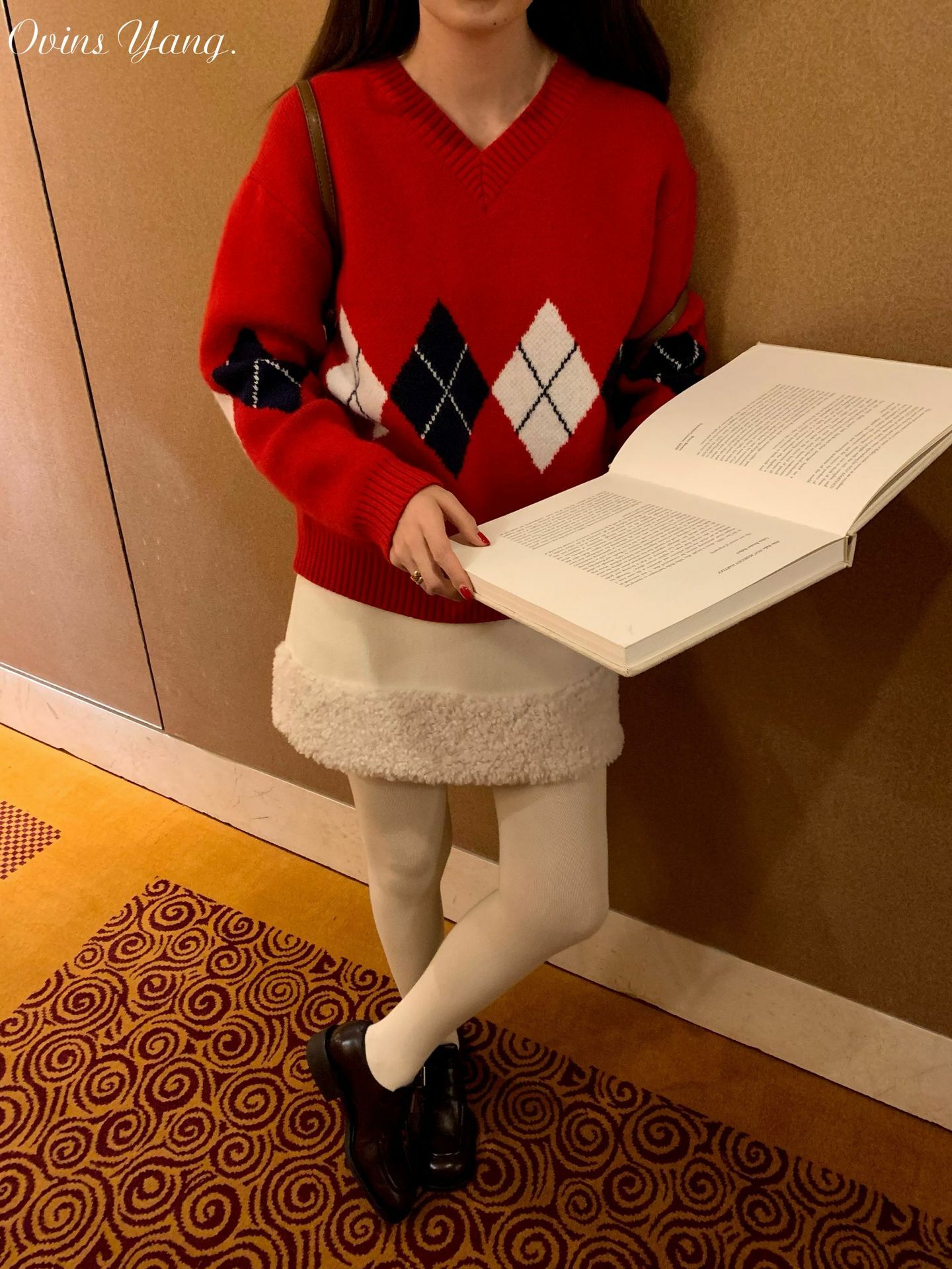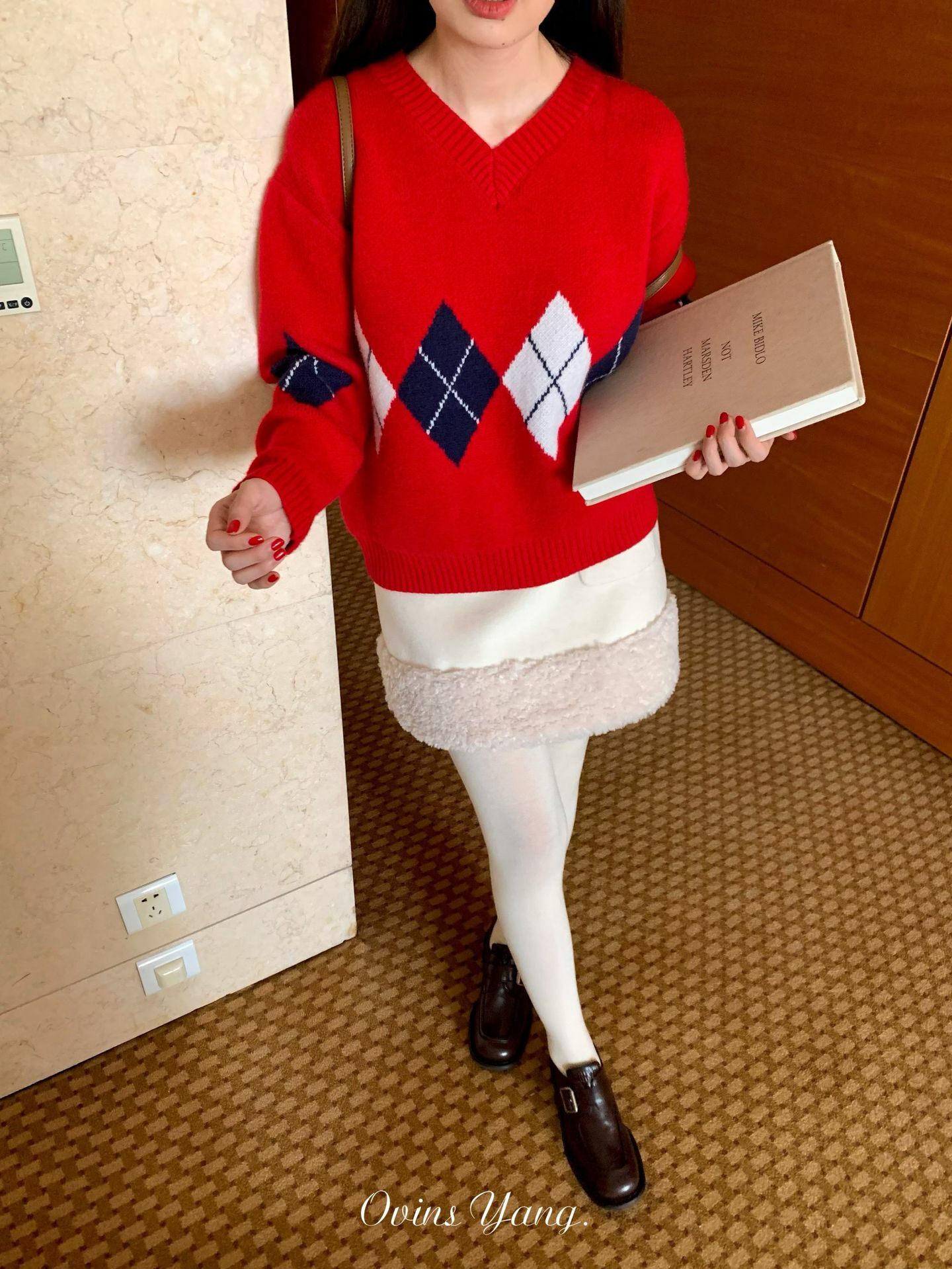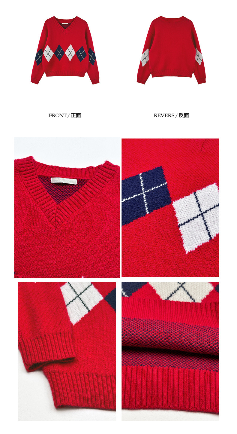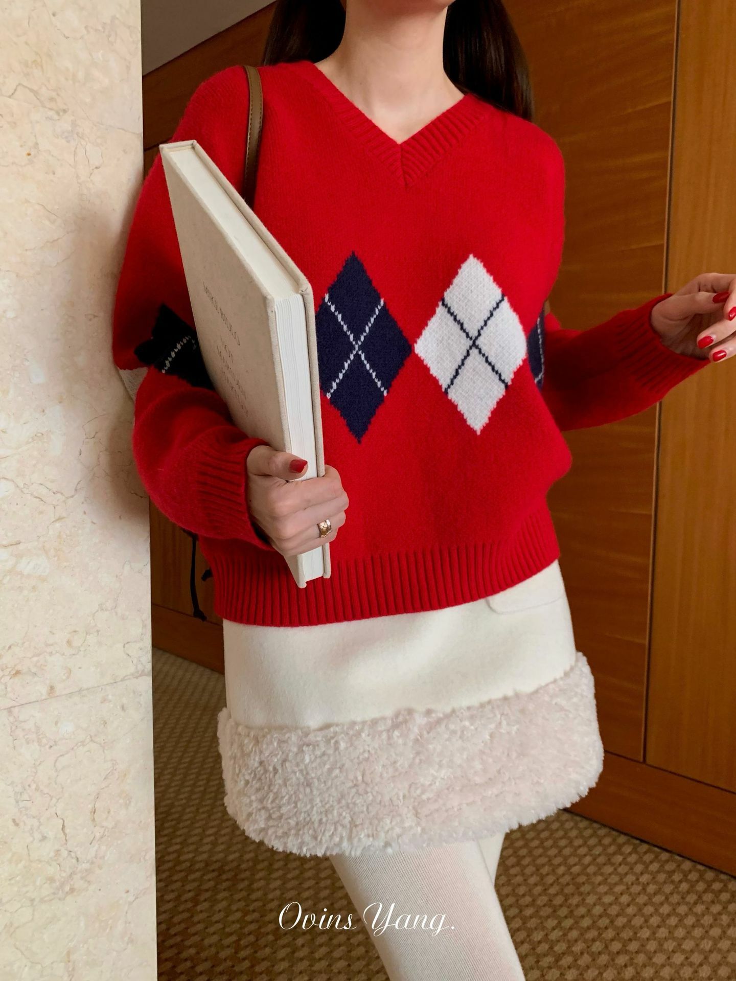 *o-ha-you*【FOY100635】費爾島聖誕紅毛衣秋冬穿搭甜美慵懶風寬鬆V領上衣-2色-如有需要請先諮詢