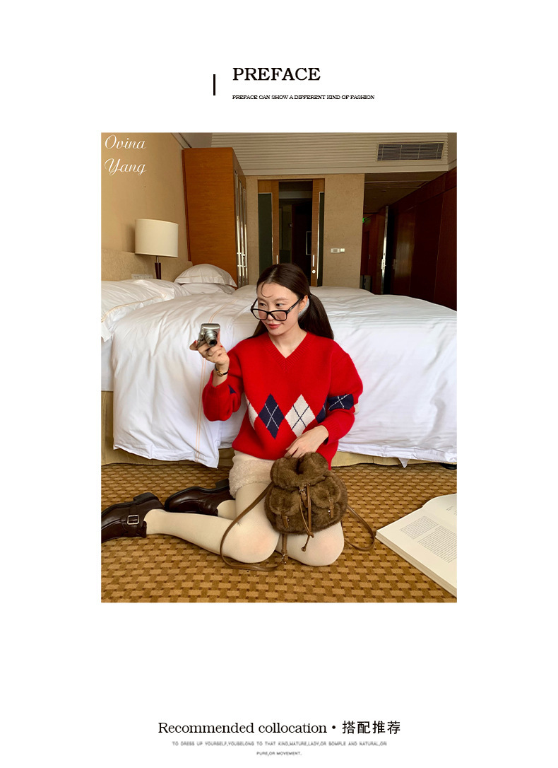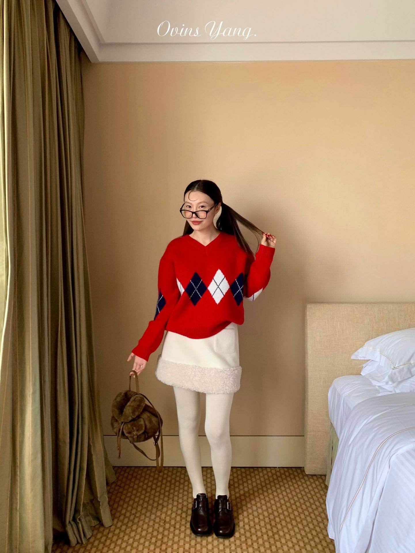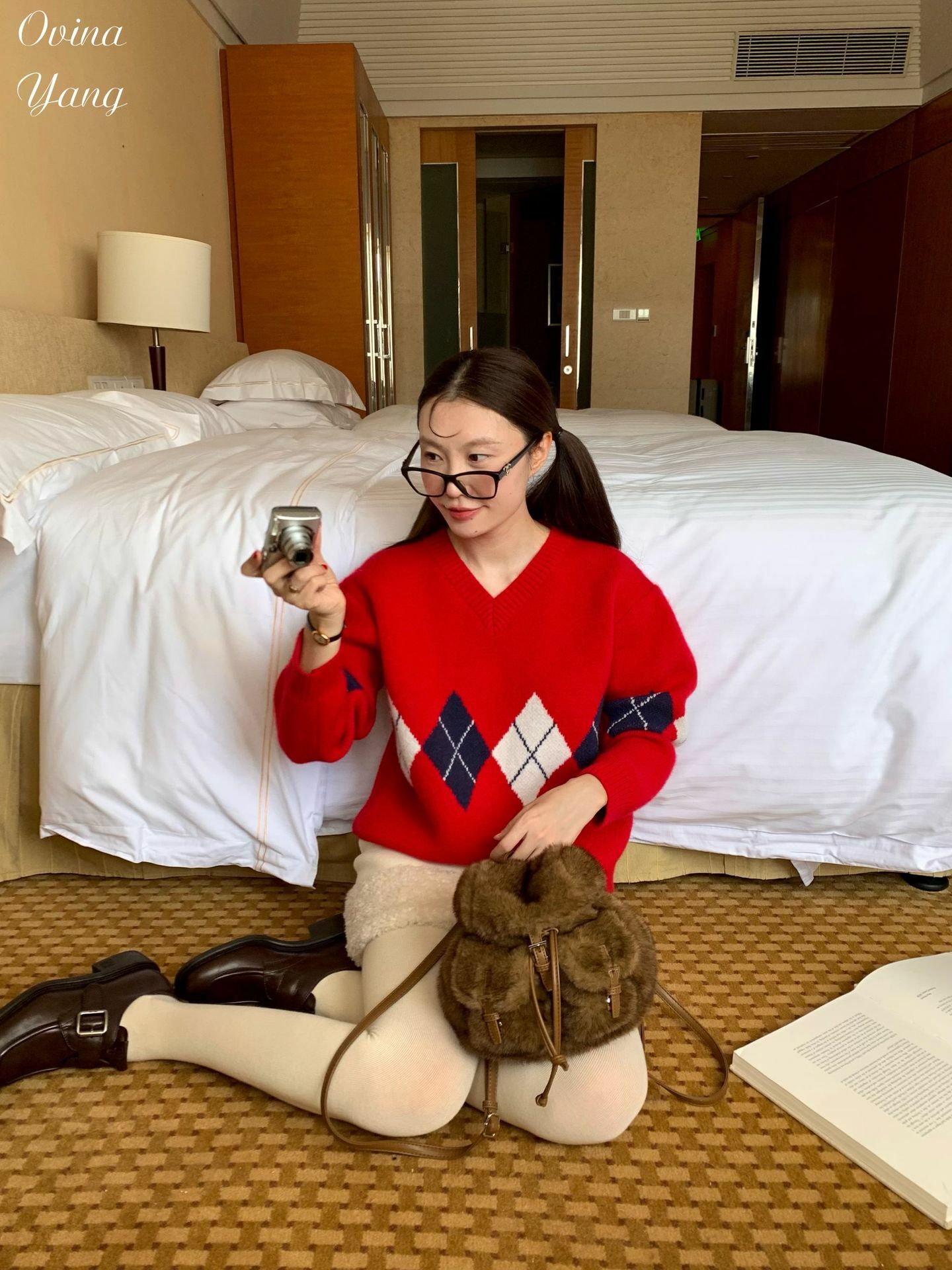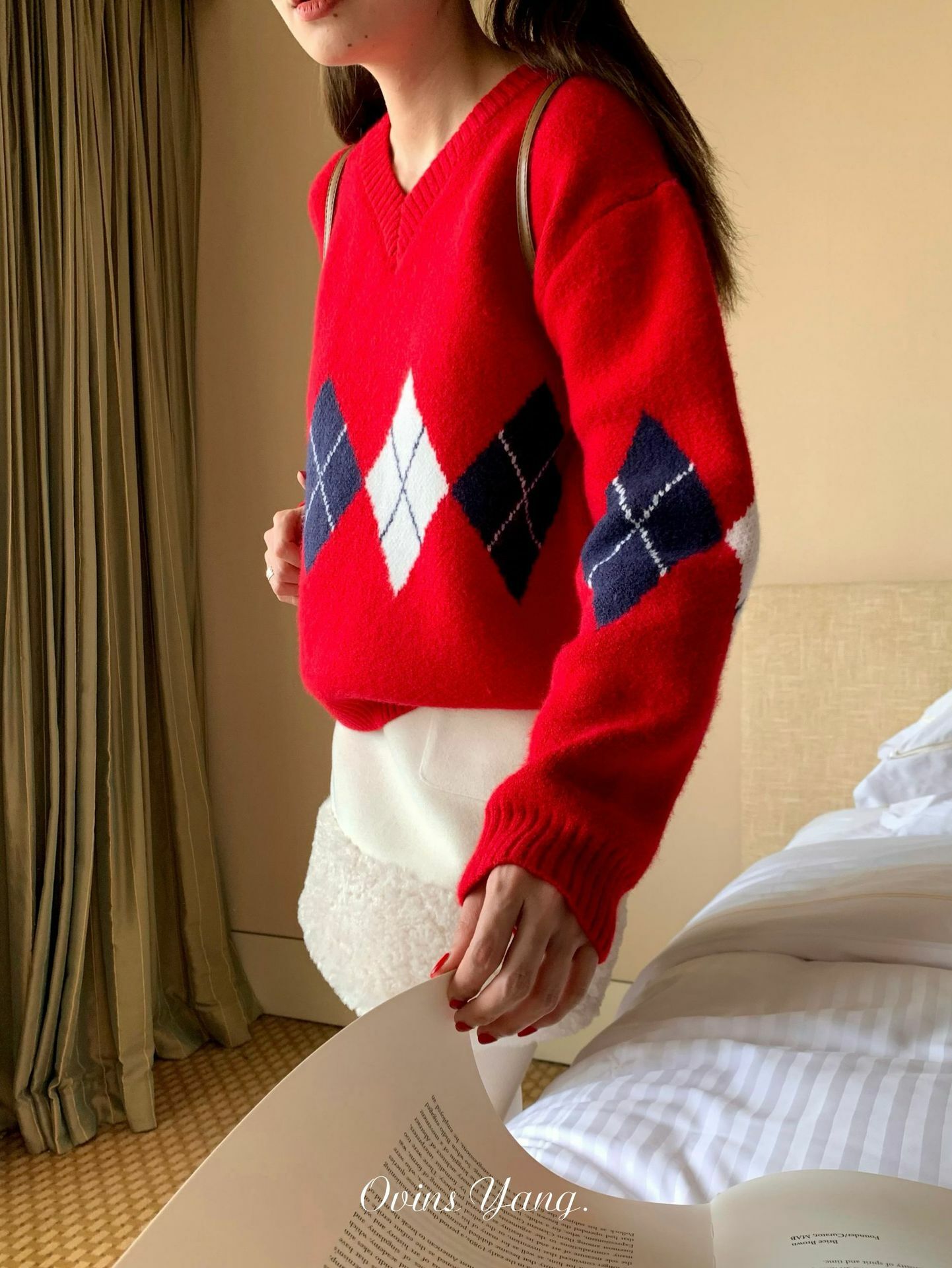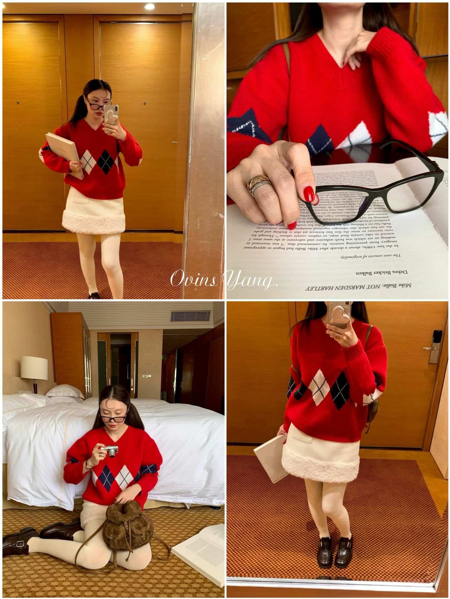 *o-ha-you*【FOY100635】費爾島聖誕紅毛衣秋冬穿搭甜美慵懶風寬鬆V領上衣-2色-如有需要請先諮詢