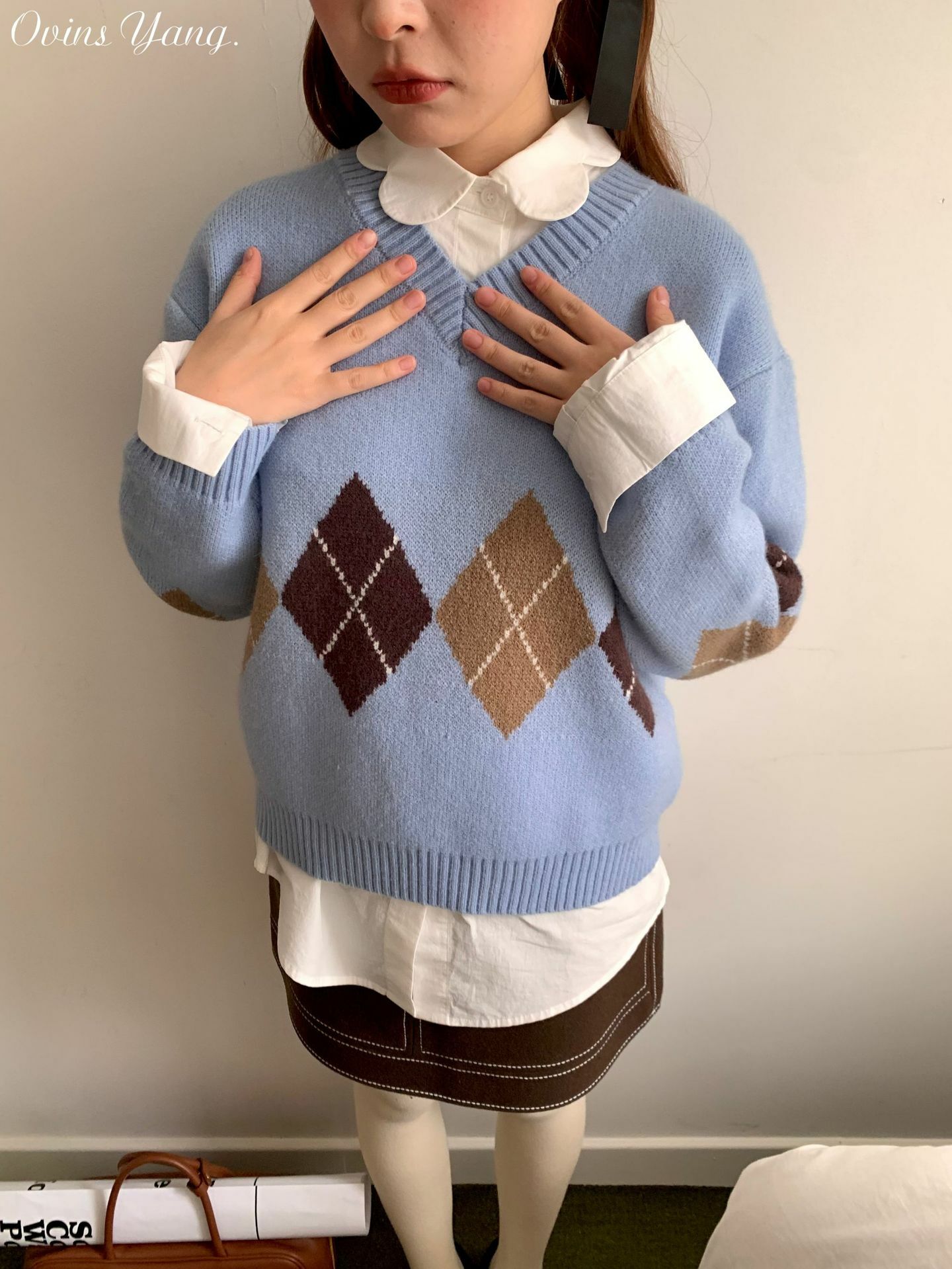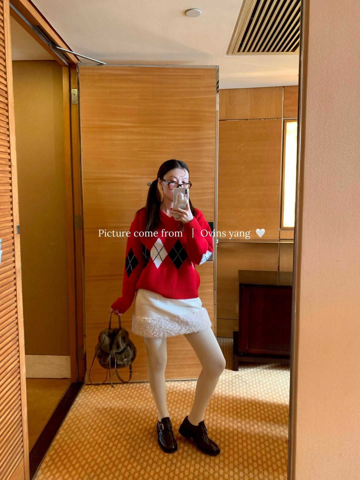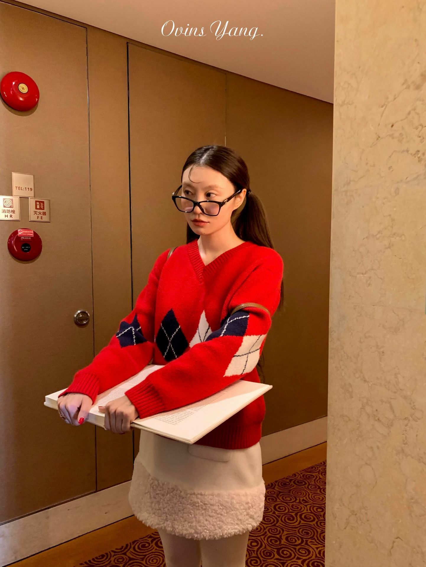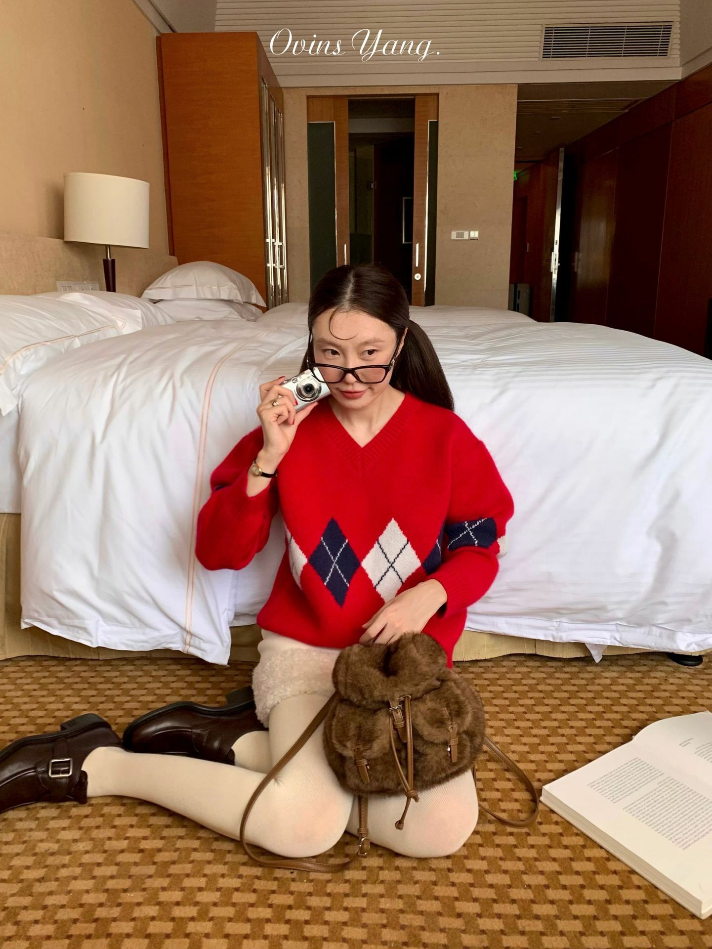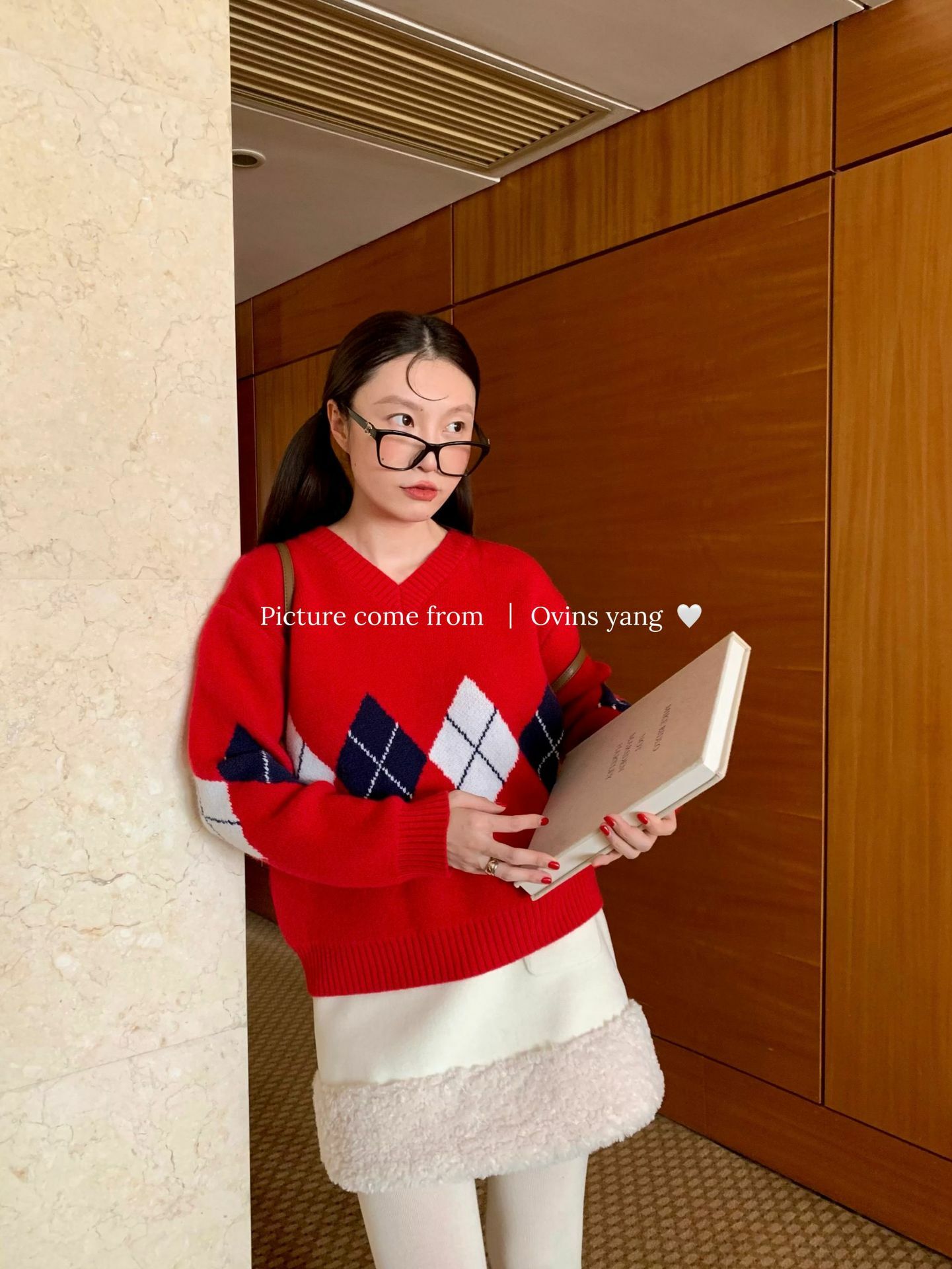 *o-ha-you*【FOY100635】費爾島聖誕紅毛衣秋冬穿搭甜美慵懶風寬鬆V領上衣-2色-如有需要請先諮詢