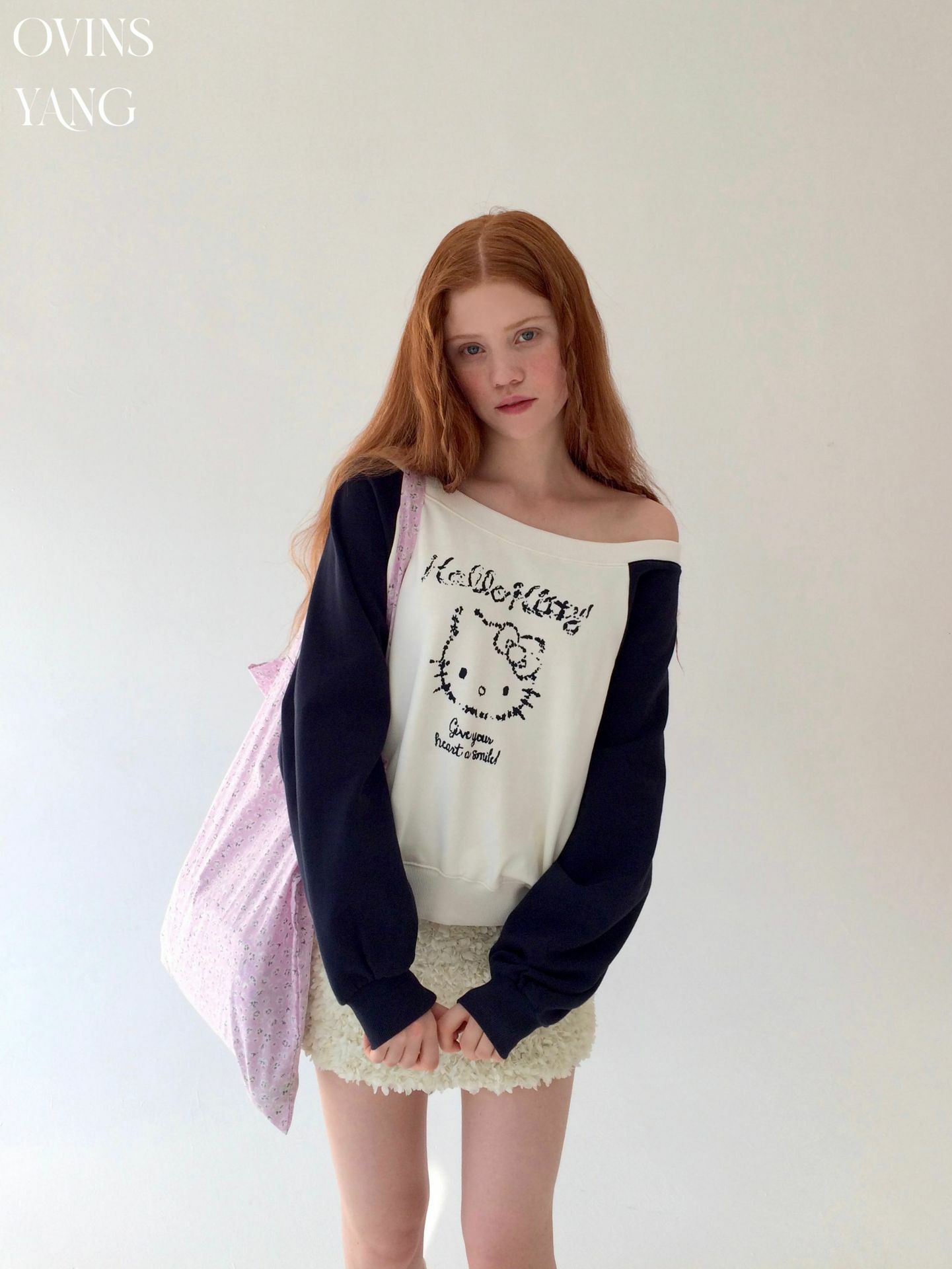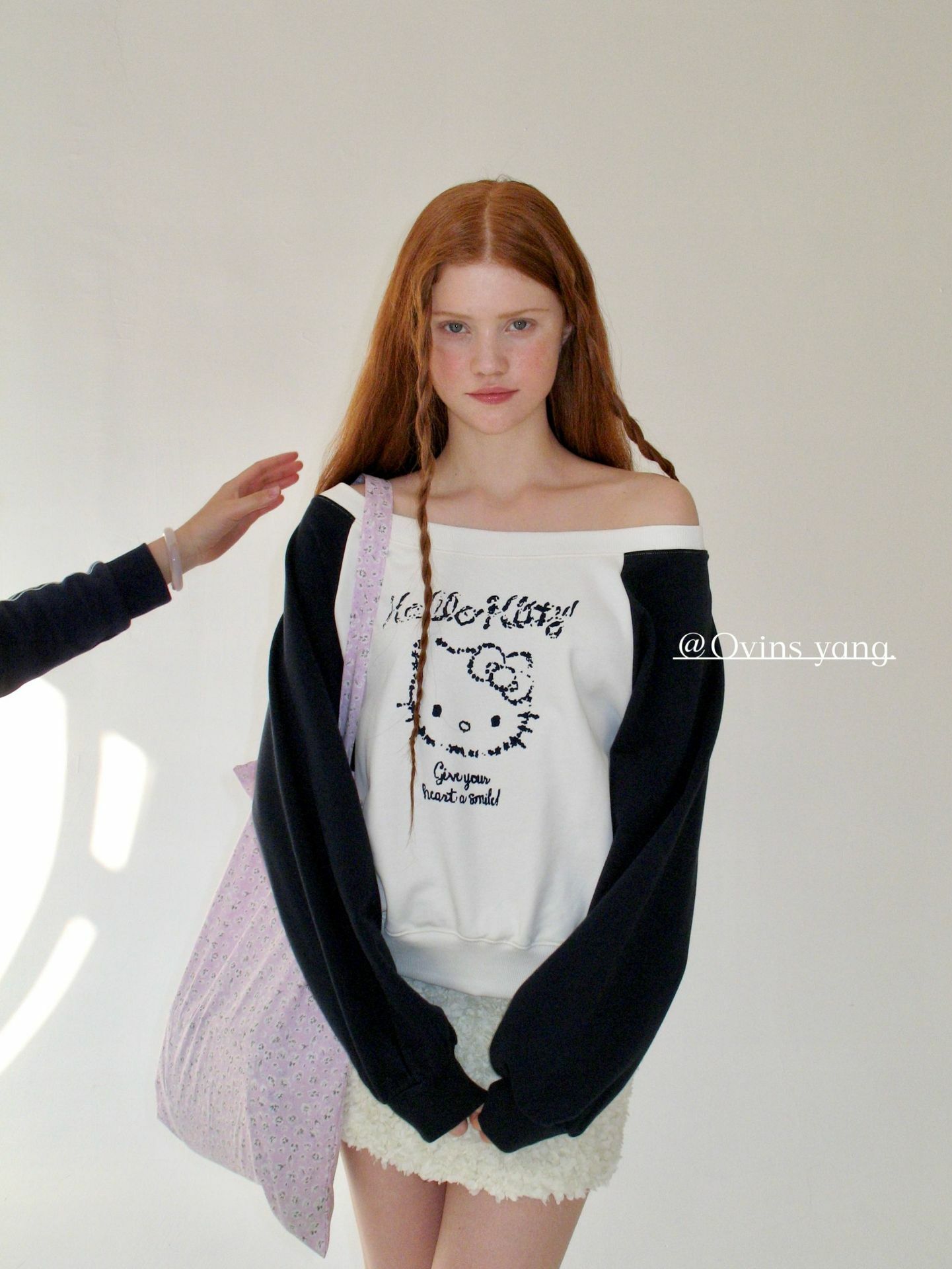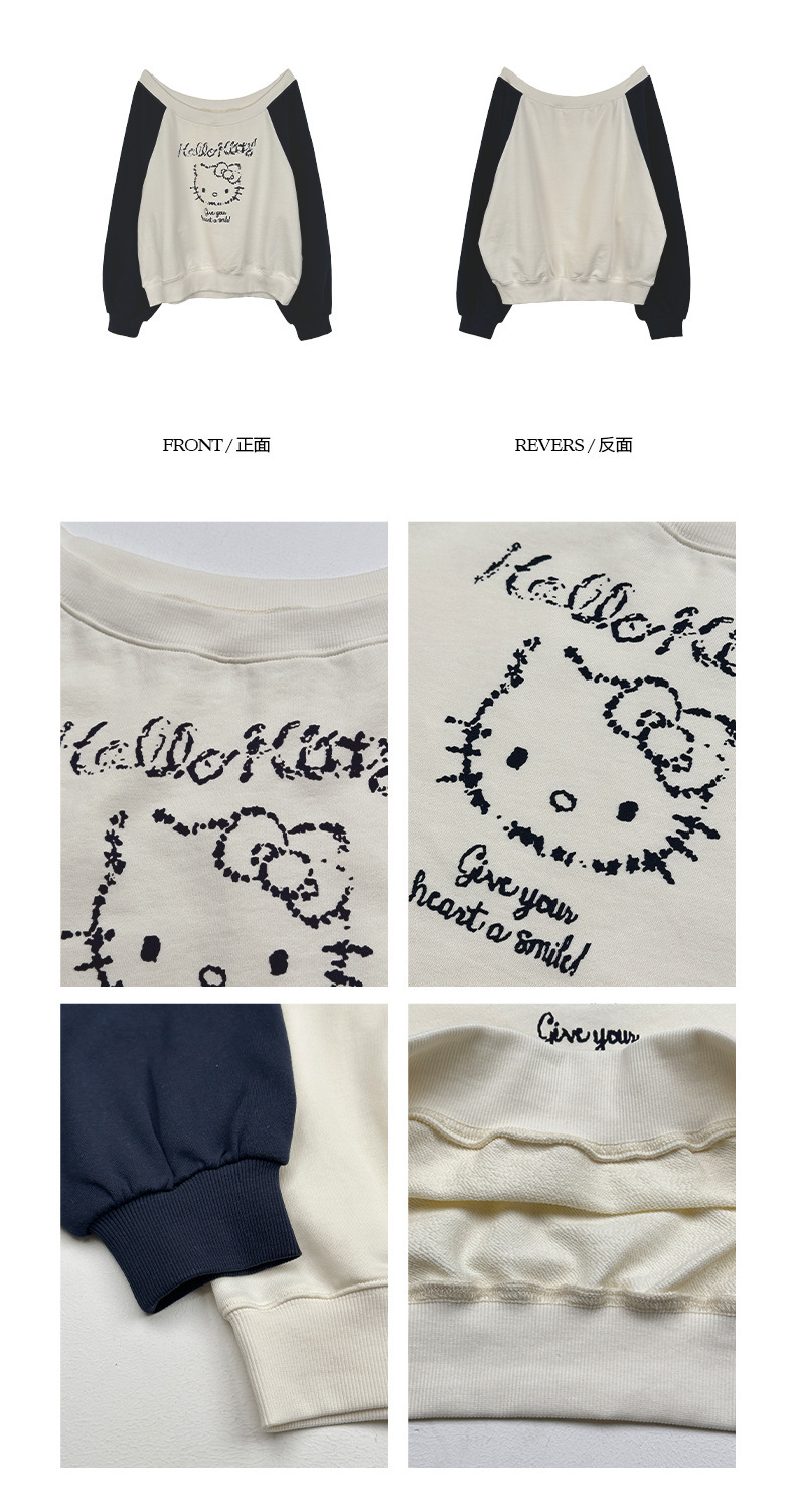 *o-ha-you*【FOY100703】KT貓無帽圓領衛衣女款2025新款春秋韓系慵懶風露肩上衣-如有需要請先諮詢