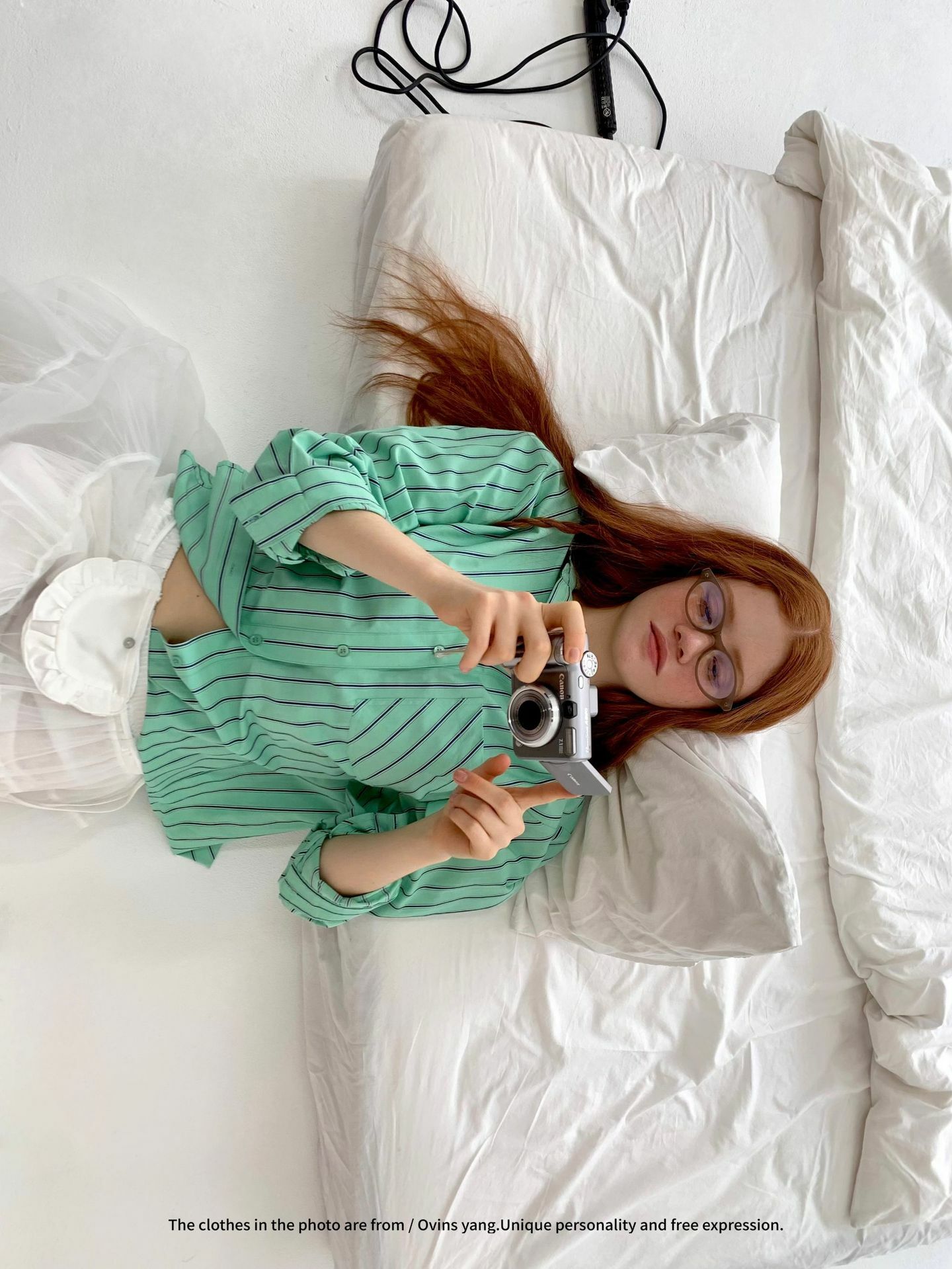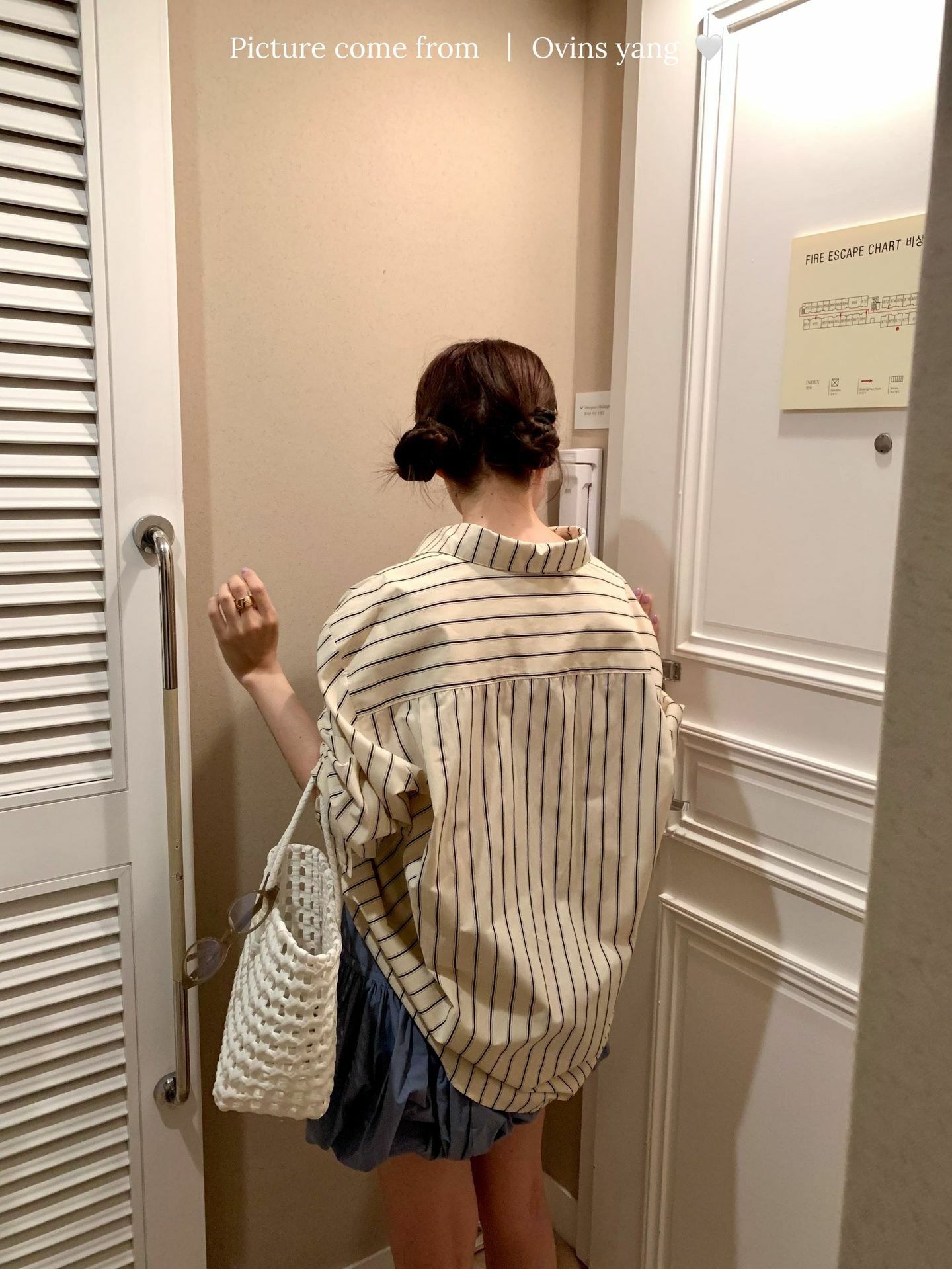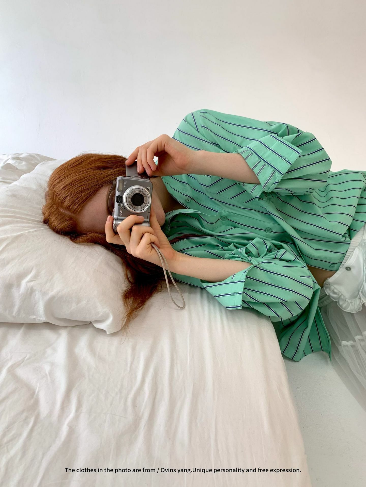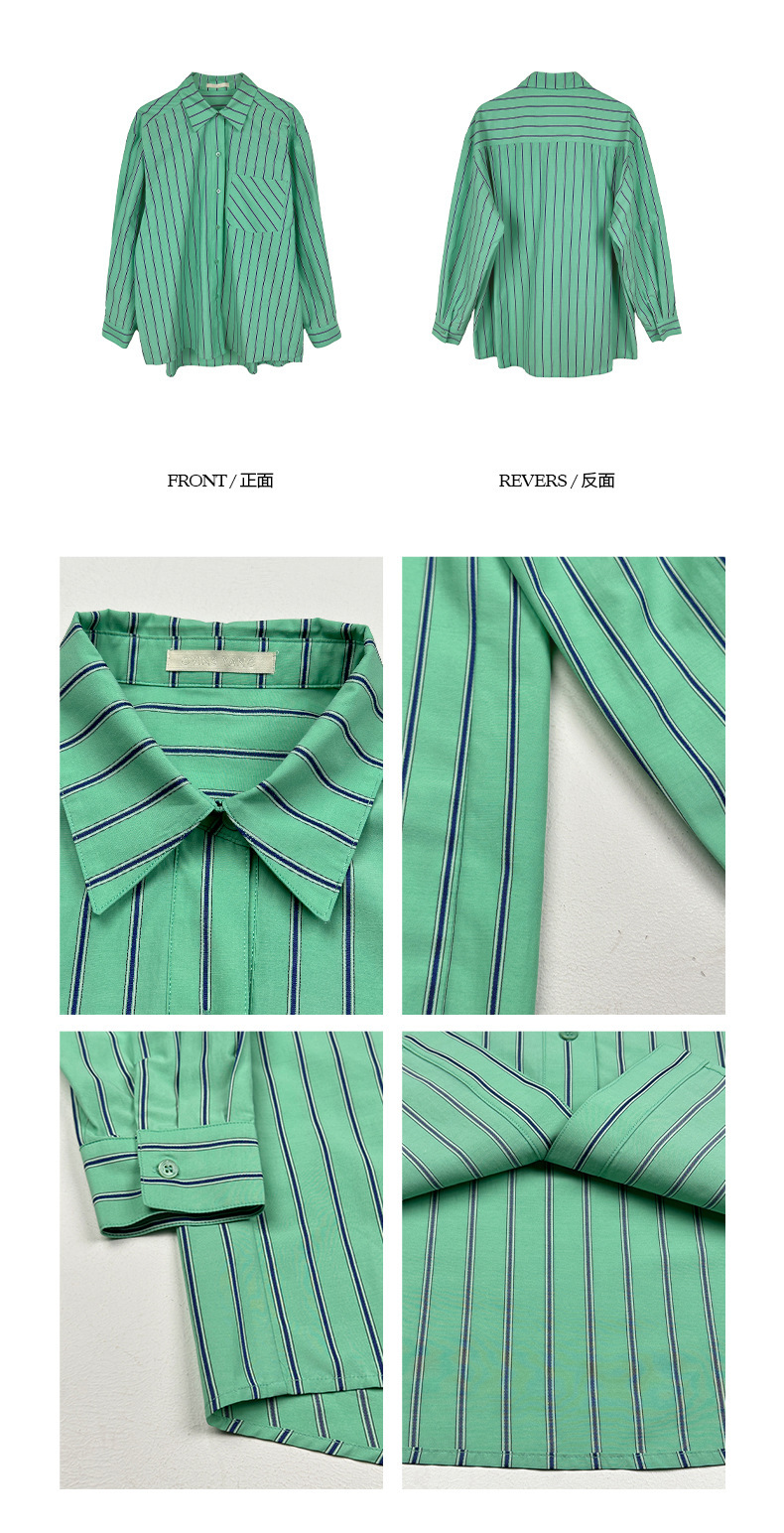 *o-ha-you*【FOY100756】綠色直條紋襯衫長袖設計感高級感輕奢學院風甜美上衣-2色-如有需要請先諮詢