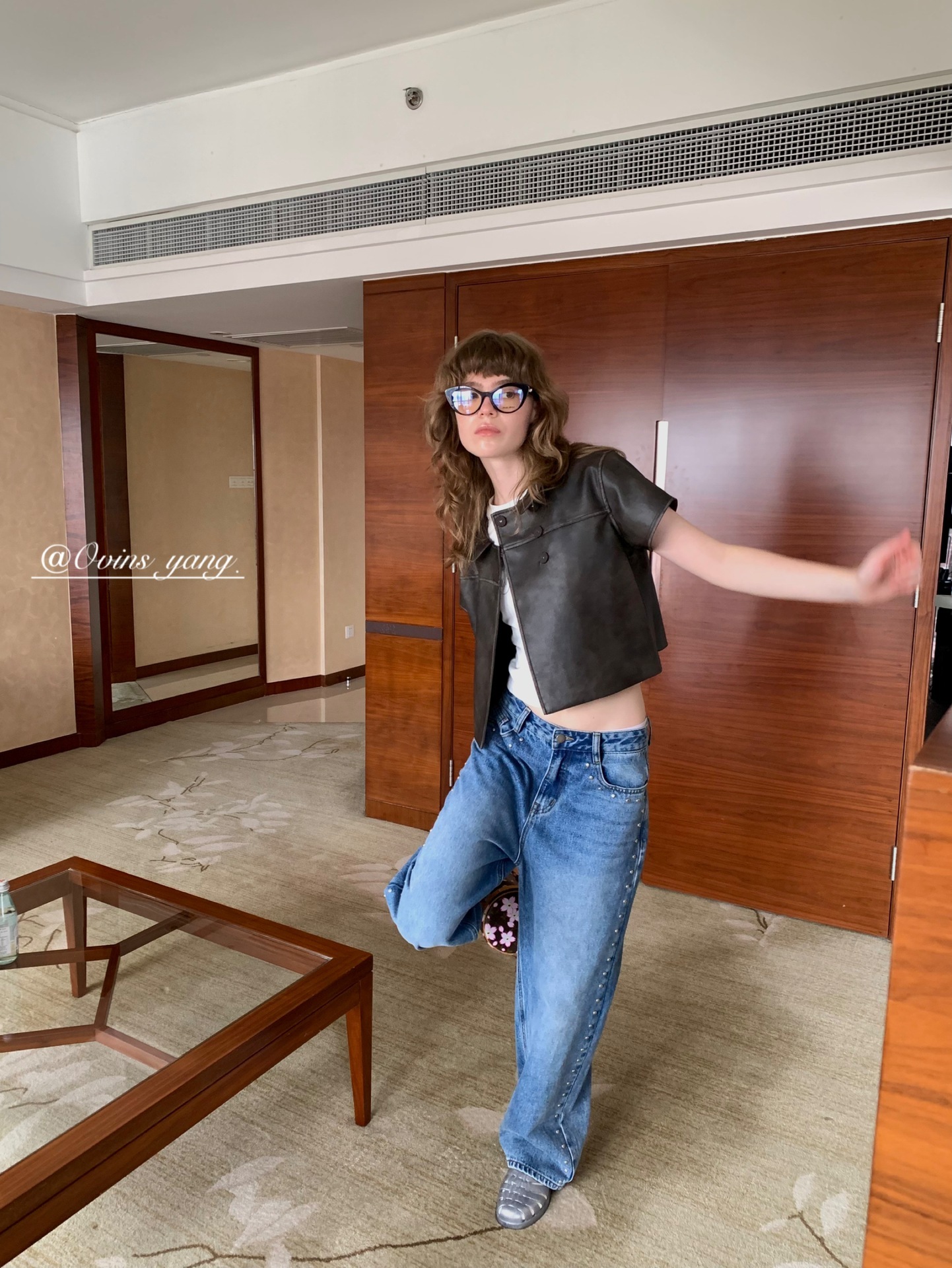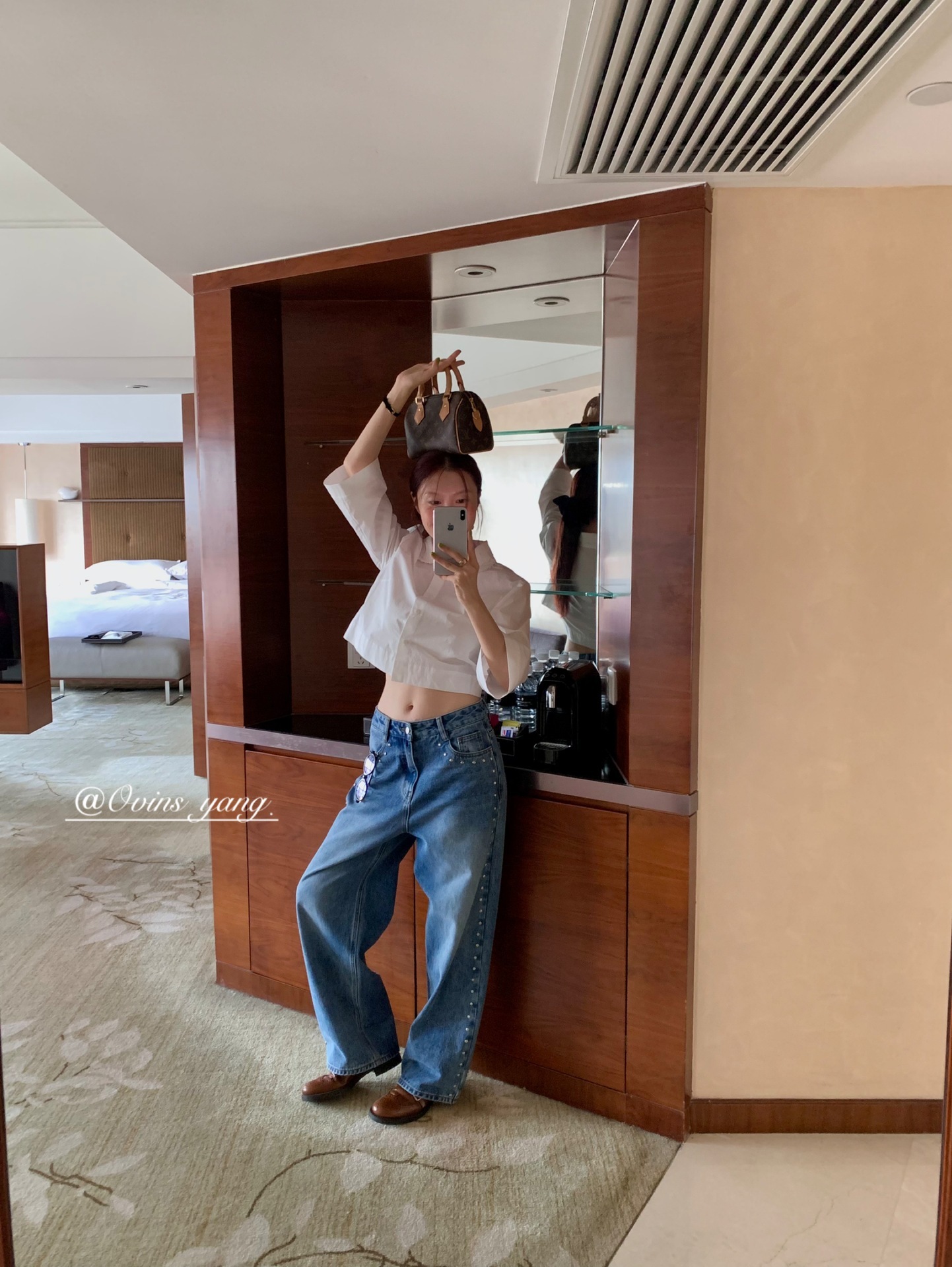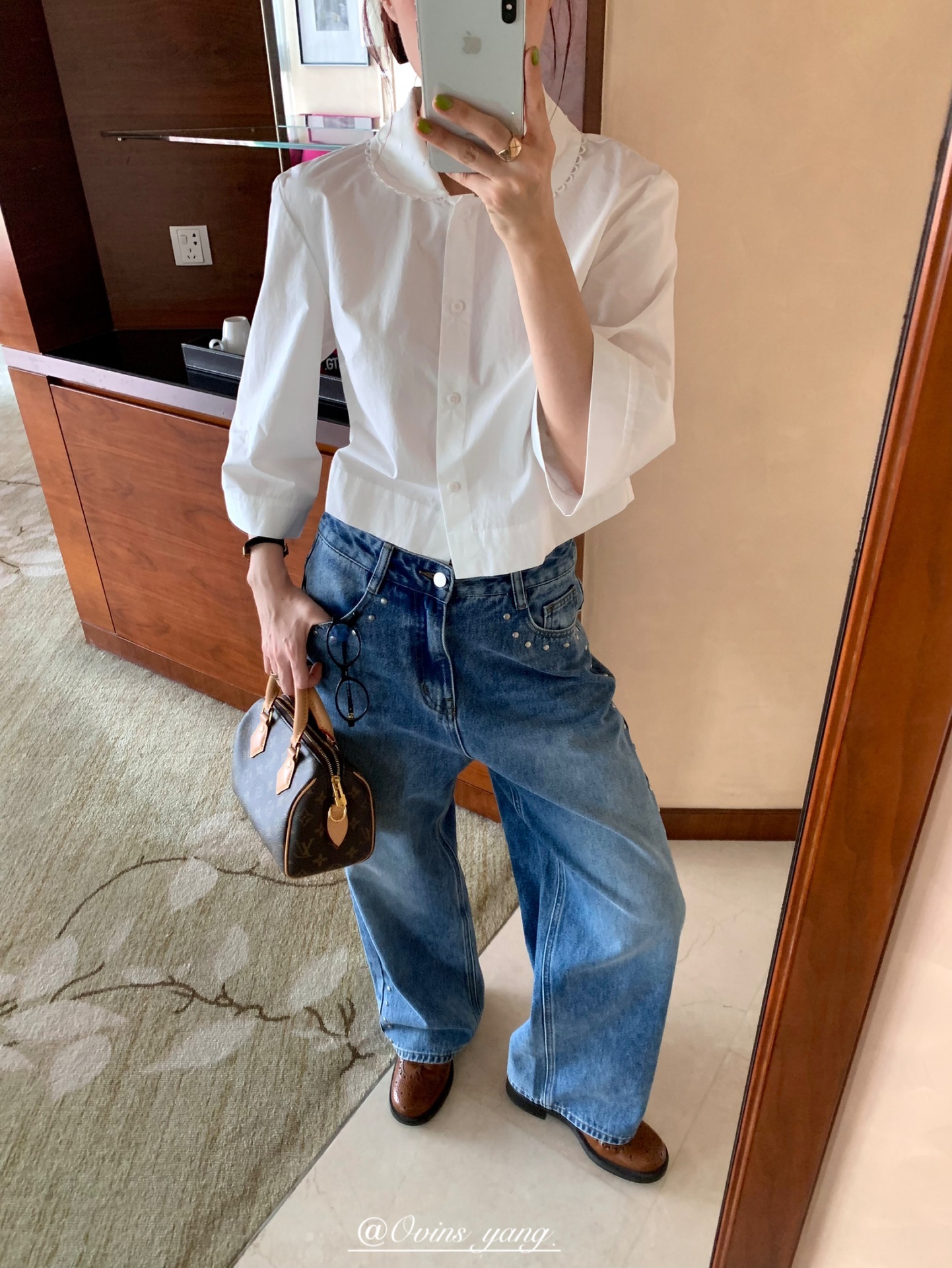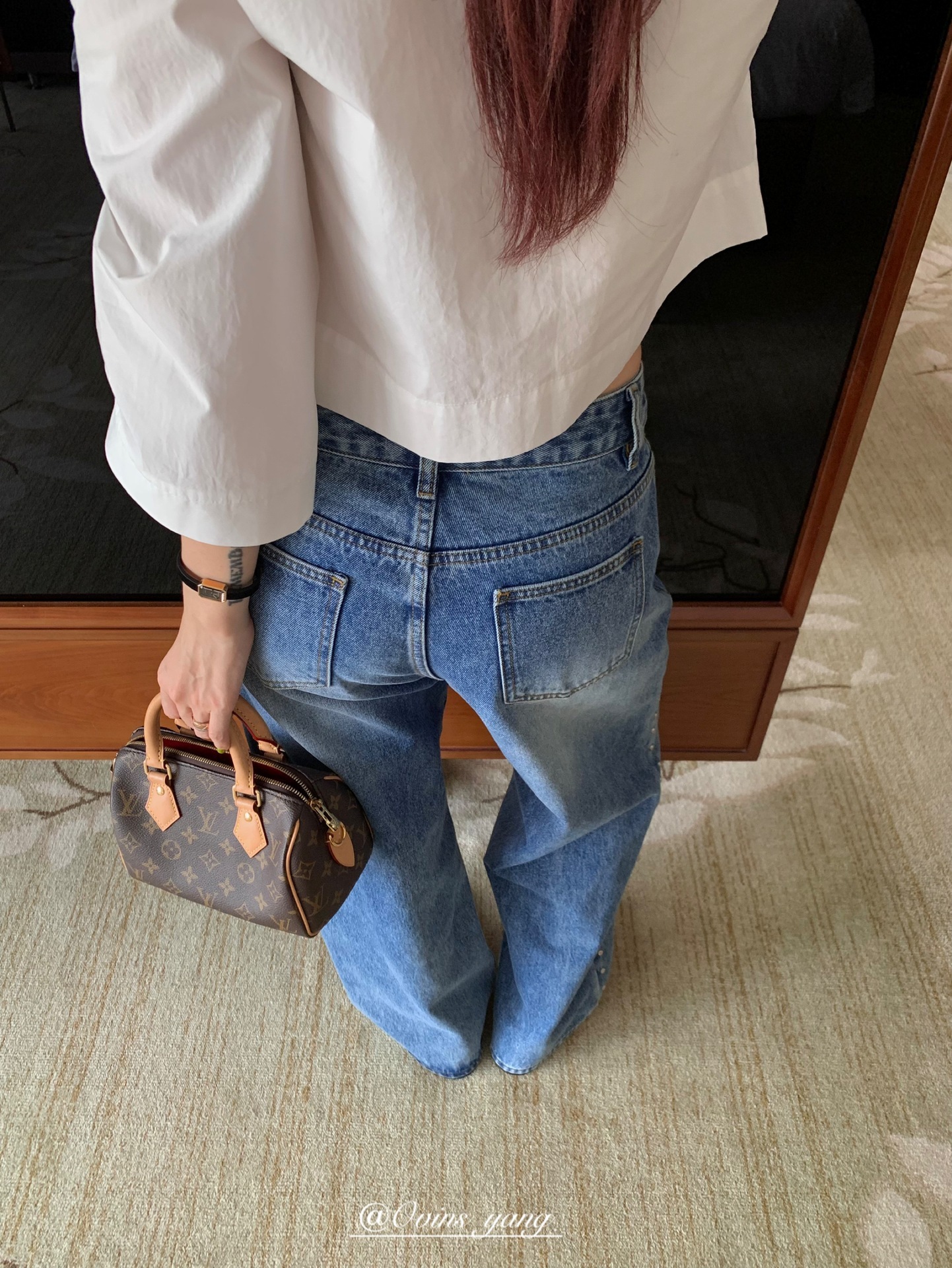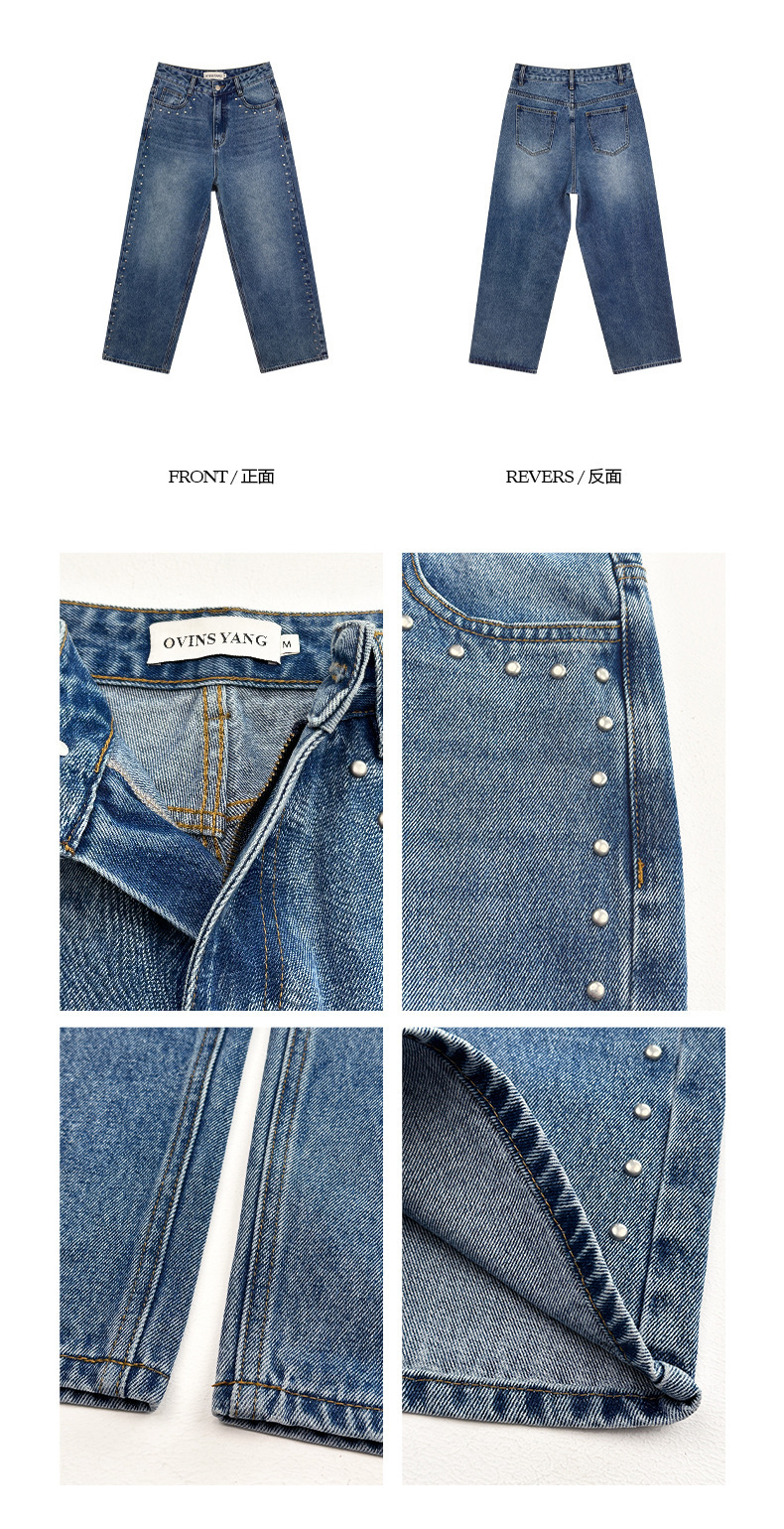 *o-ha-you*【FOY101118】藍色牛仔褲女2025秋季新款顯瘦鉚釘設計感直筒褲子