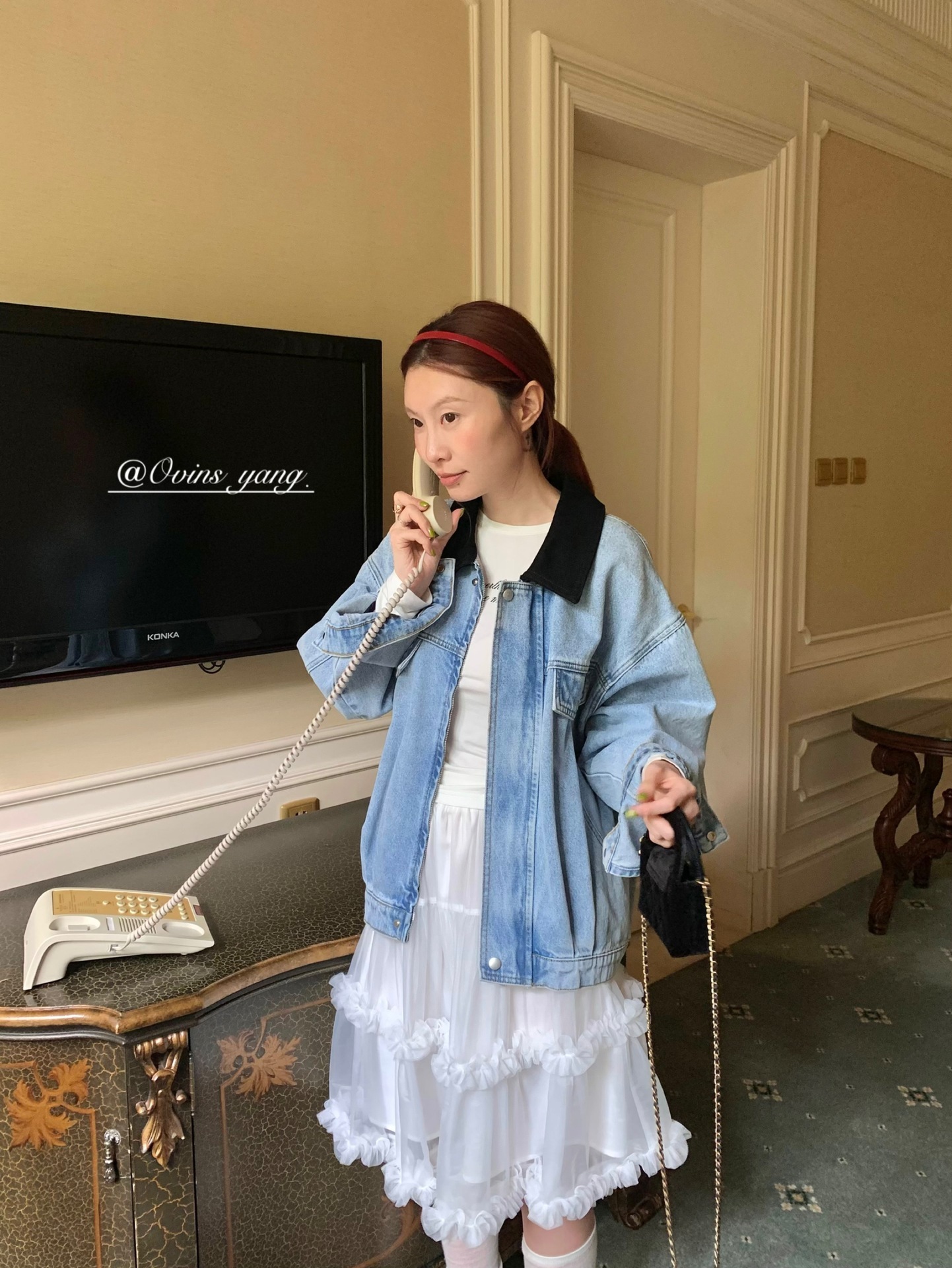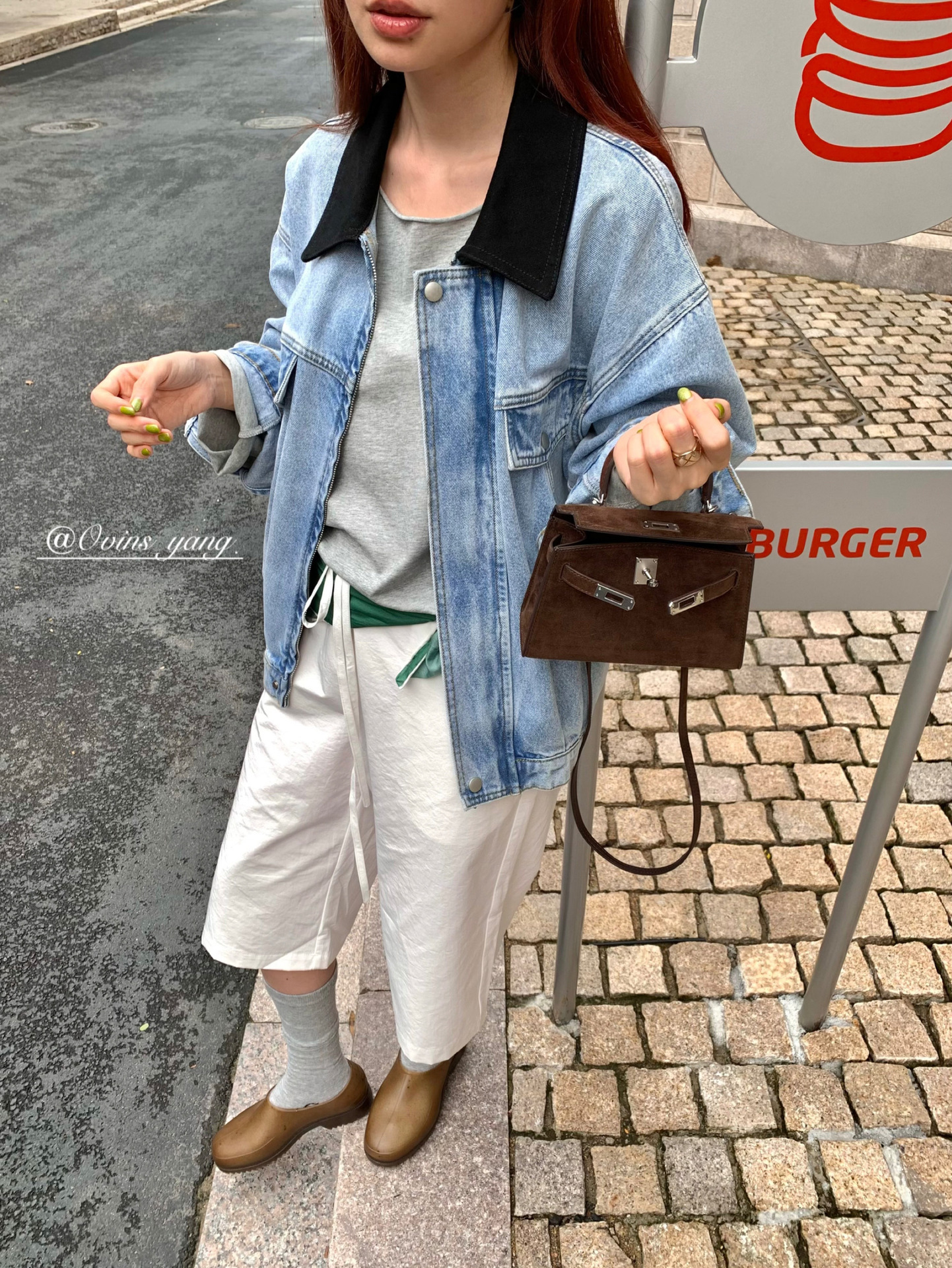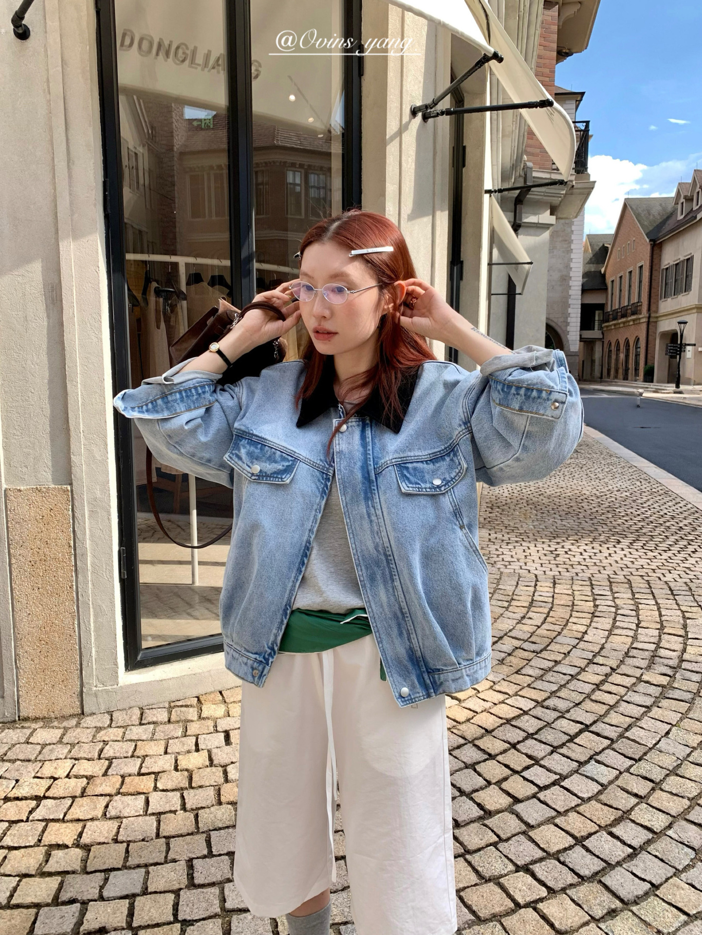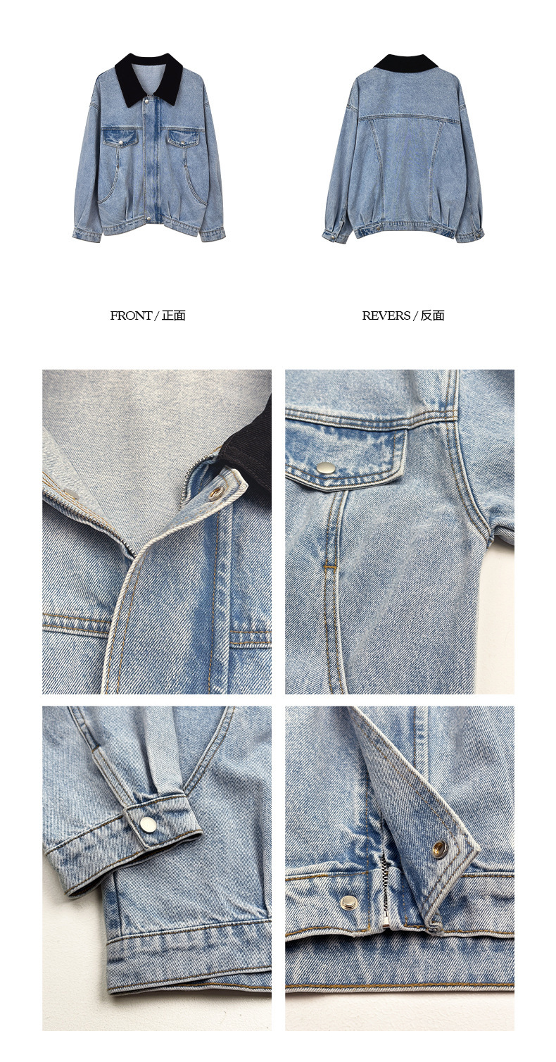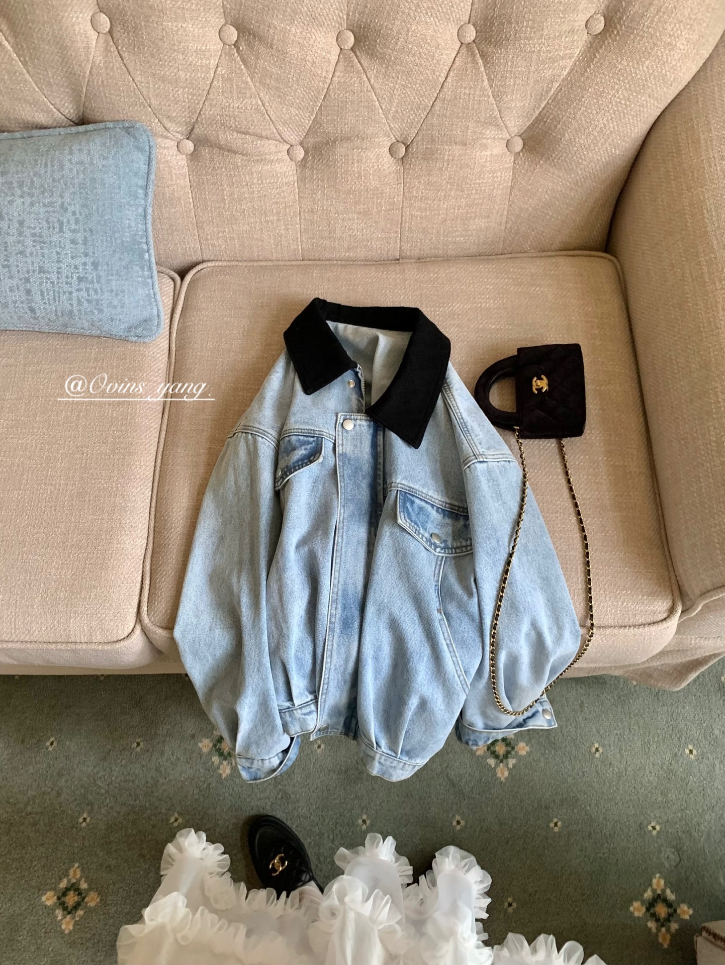 *o-ha-you*【FOY101121】秋季撞色翻領牛仔外套韓系寬鬆百搭休閒工裝夾克上衣