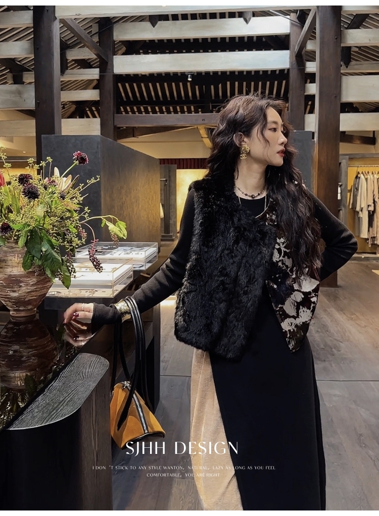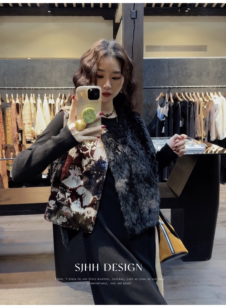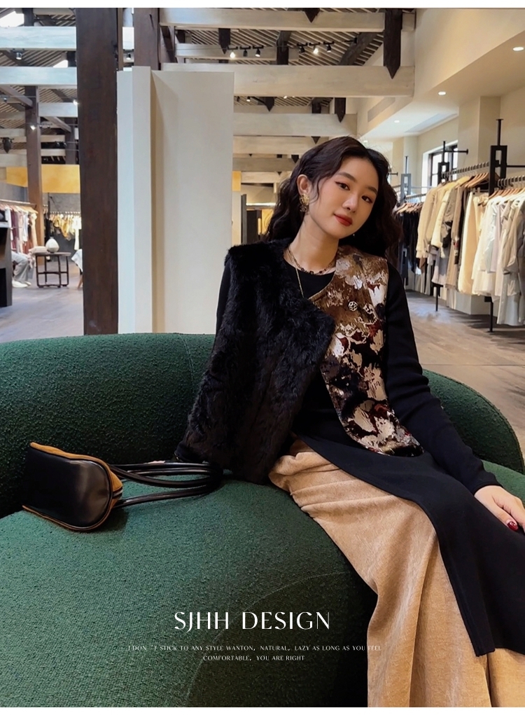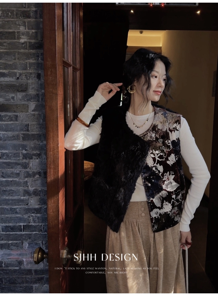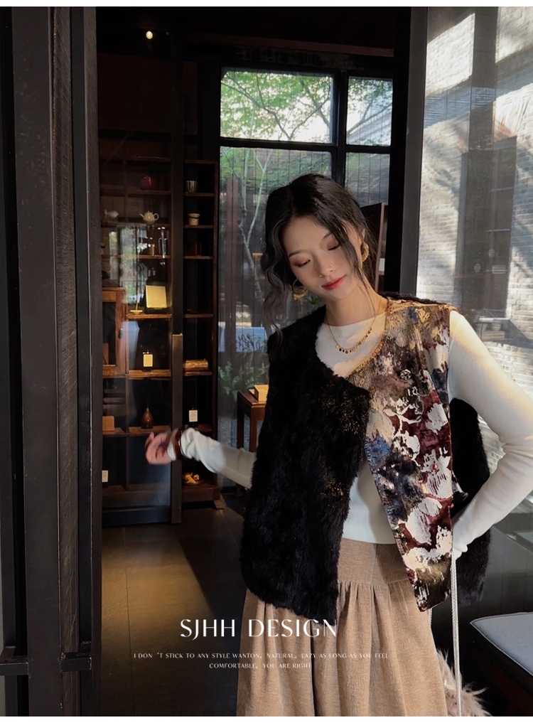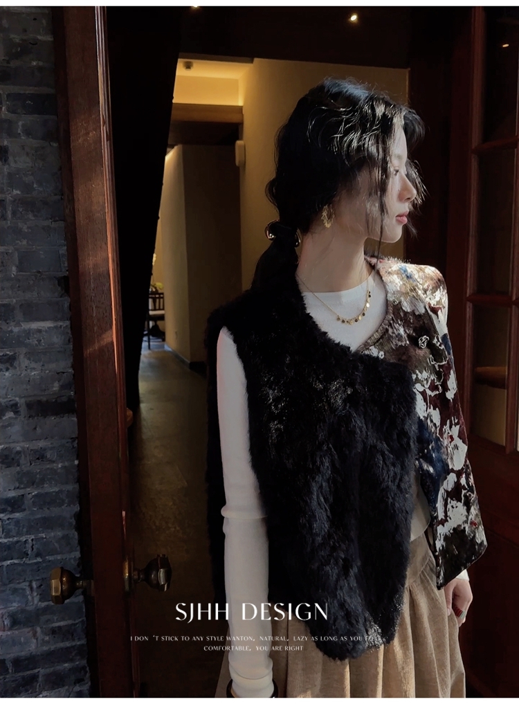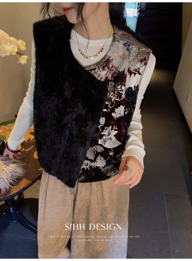 *o-ha-you*【FSJ0148】【彩雲歸】新中式中國風拼接皮草背心無袖外套