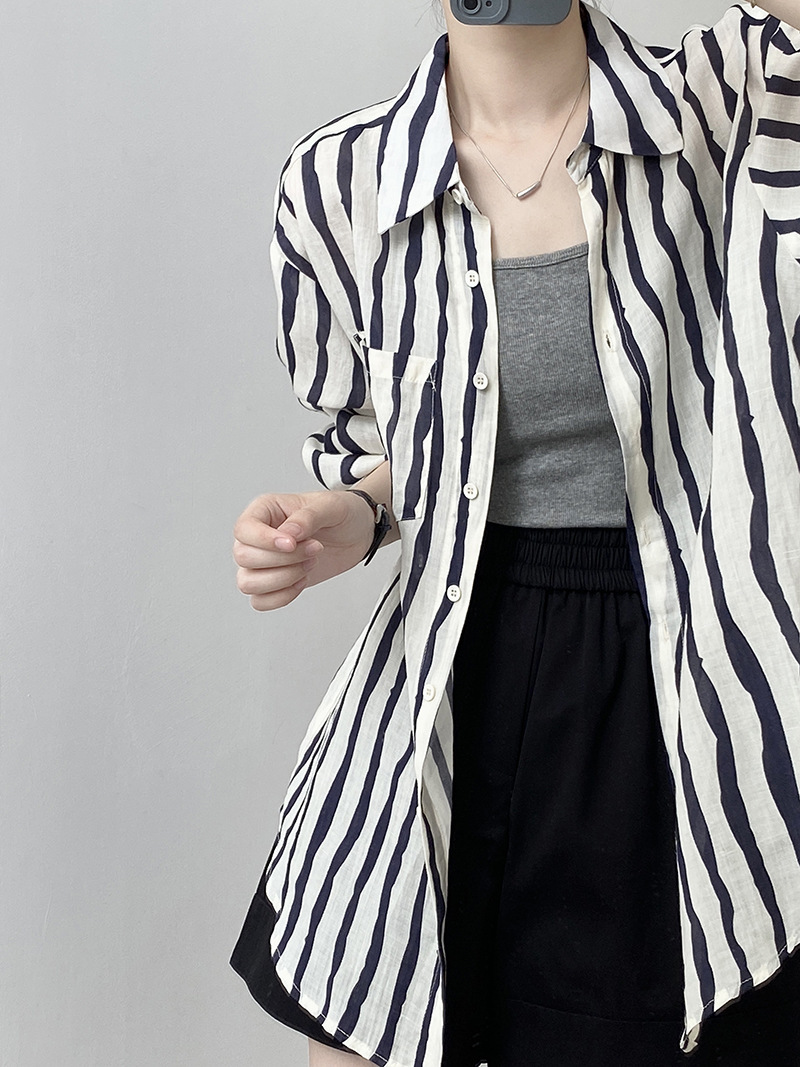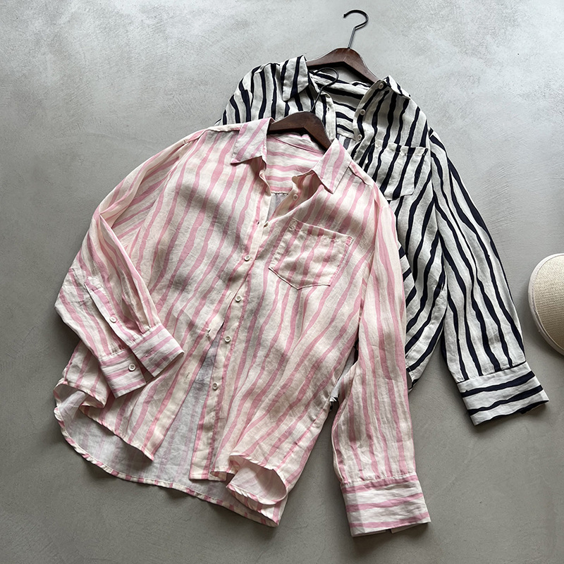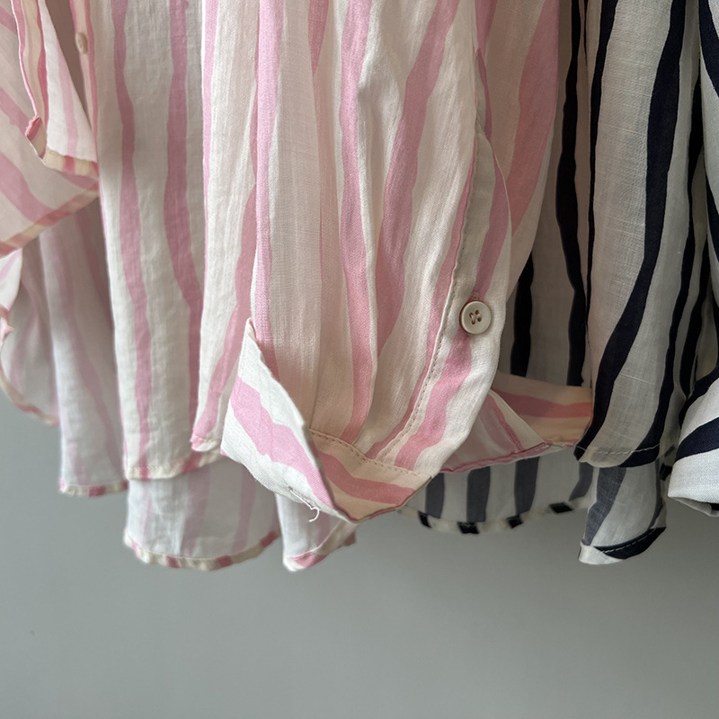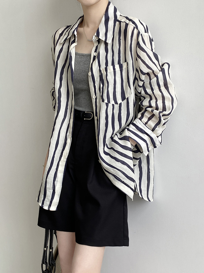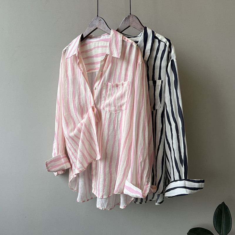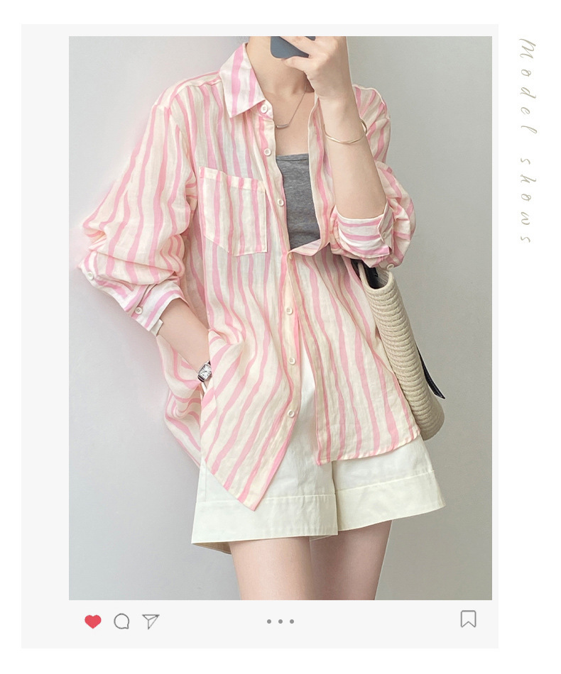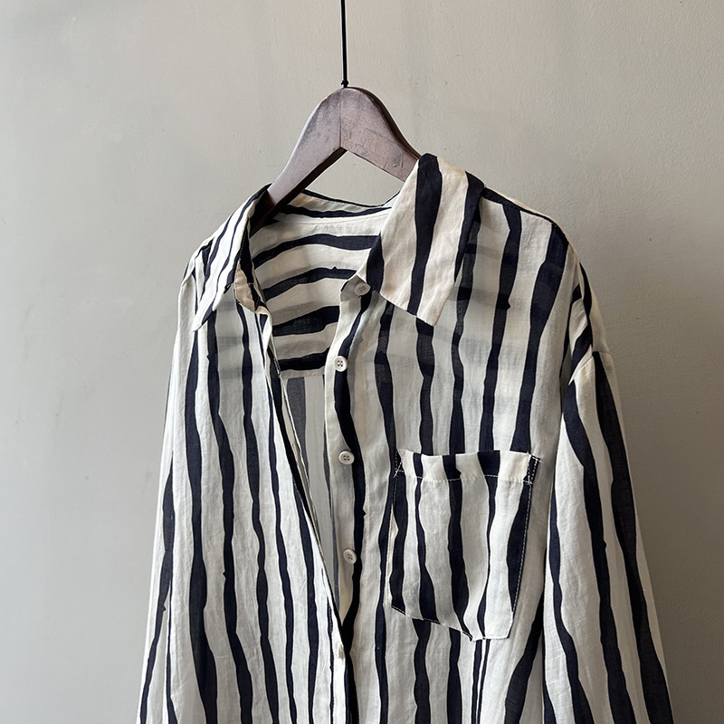 *o-ha-you*【FYS800823】麻料港味豎條紋長袖襯衫2024夏季新款輕薄襯衣防曬上衣-2色