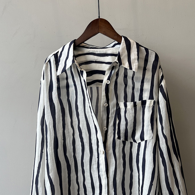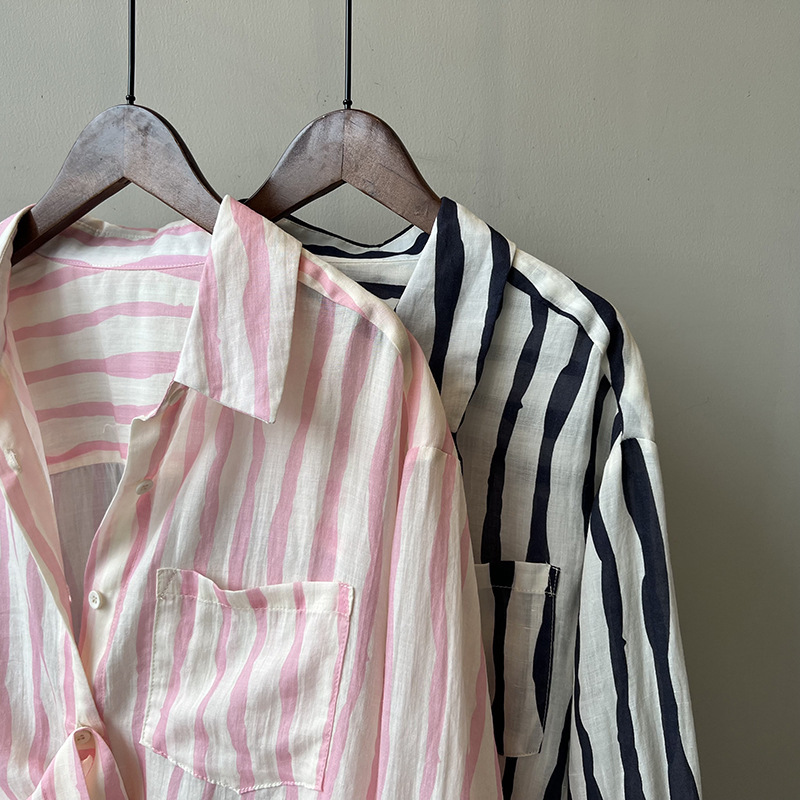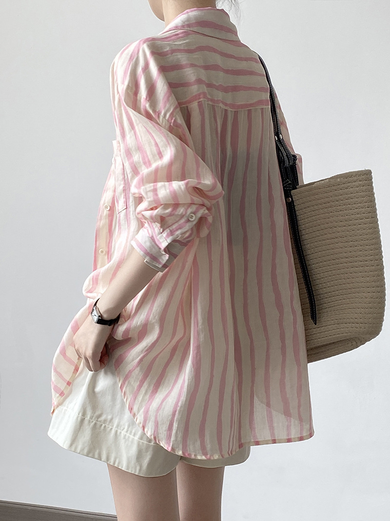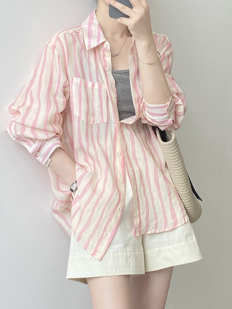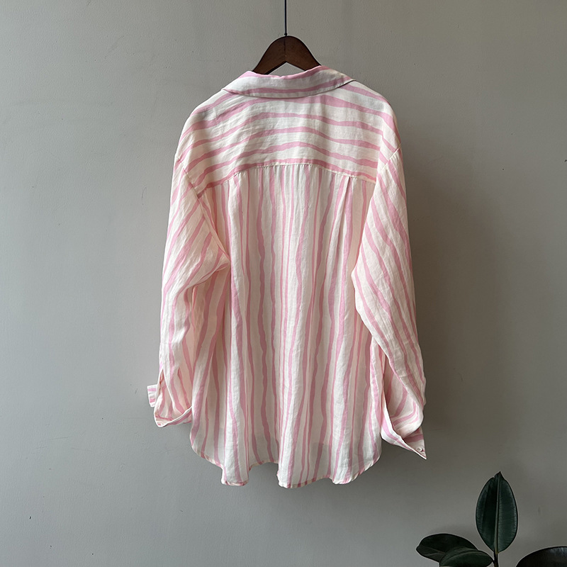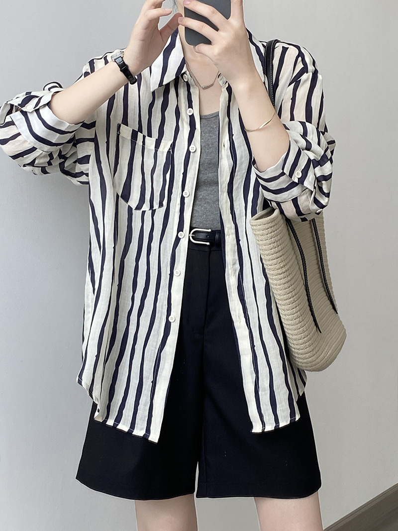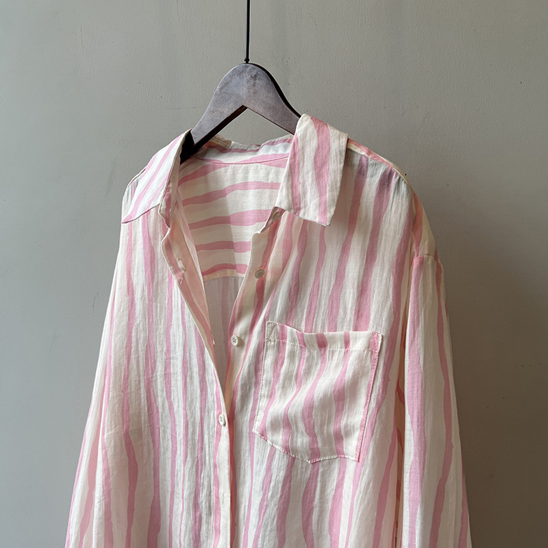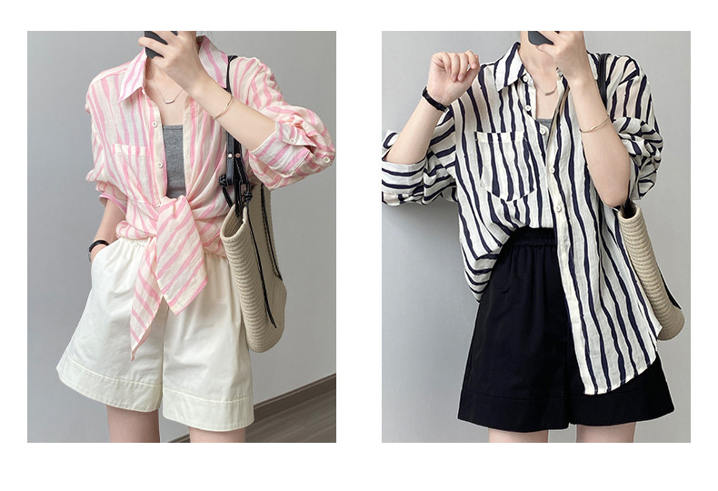*o-ha-you*【FYS800823】麻料港味豎條紋長袖襯衫2024夏季新款輕薄襯衣防曬上衣-2色