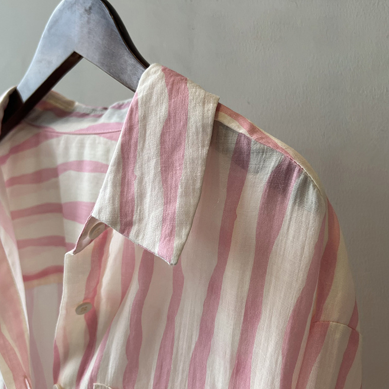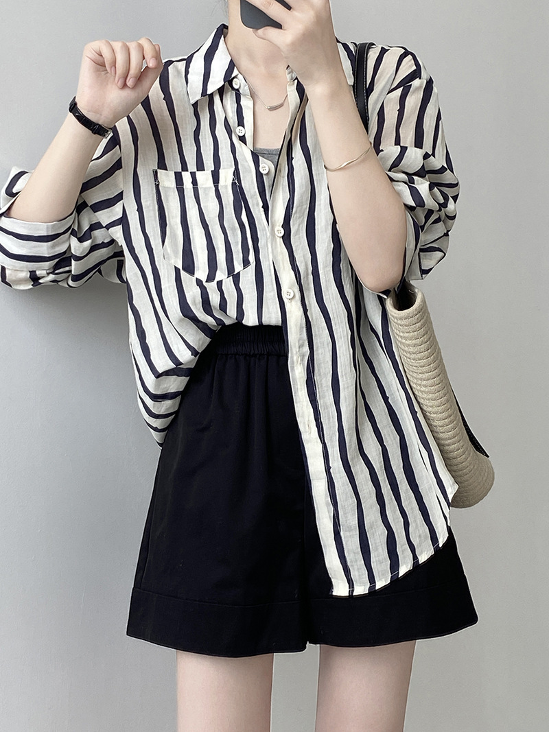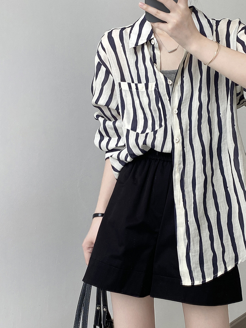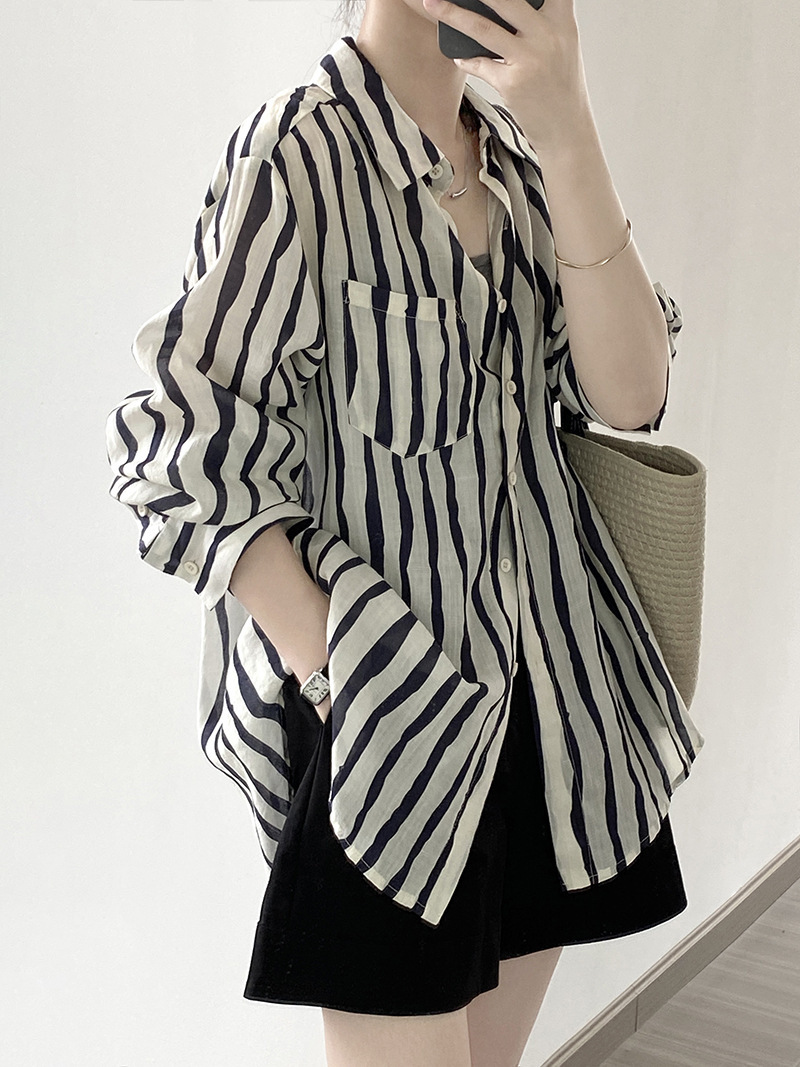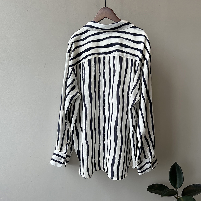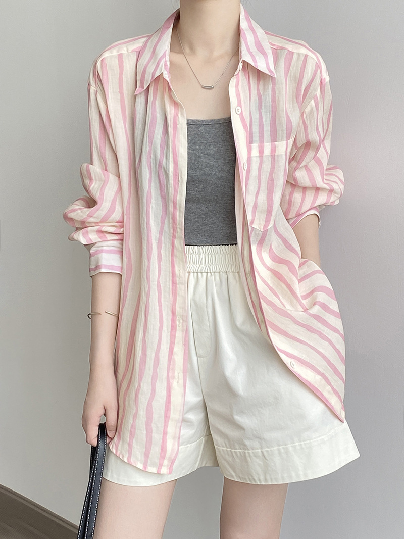 *o-ha-you*【FYS800823】麻料港味豎條紋長袖襯衫2024夏季新款輕薄襯衣防曬上衣-2色