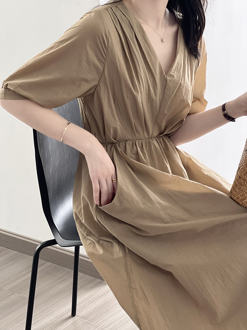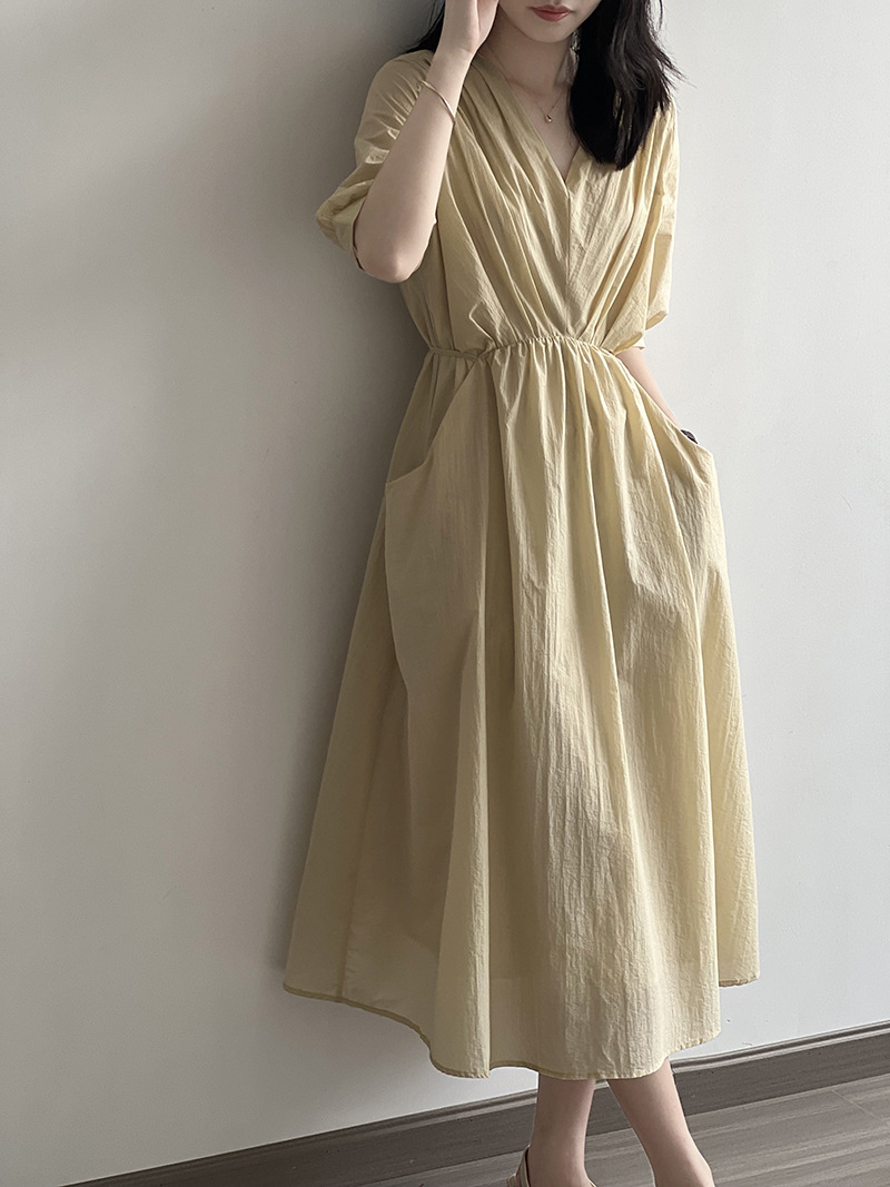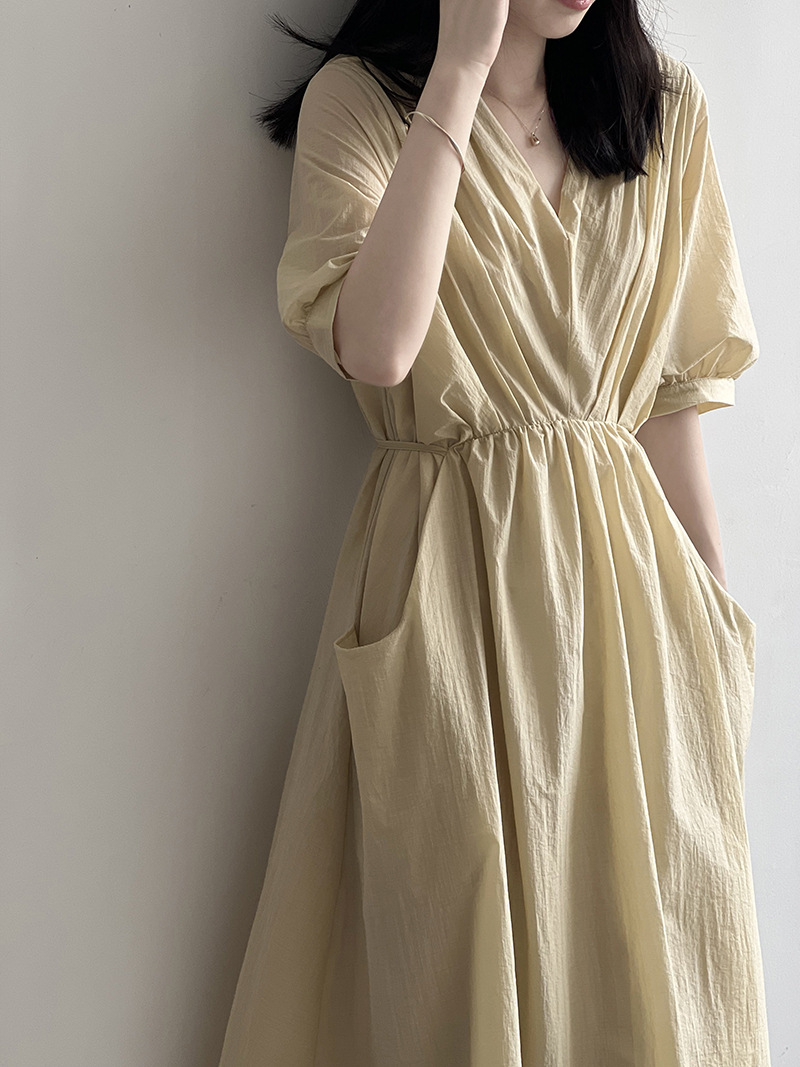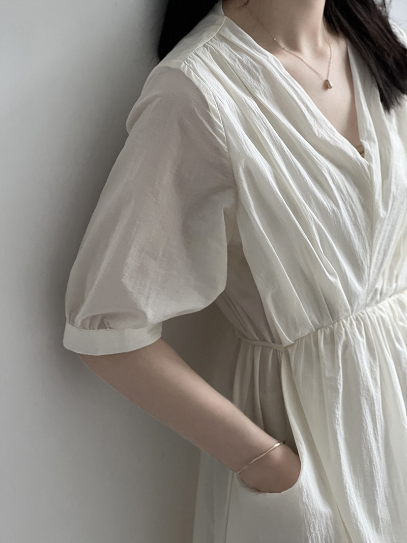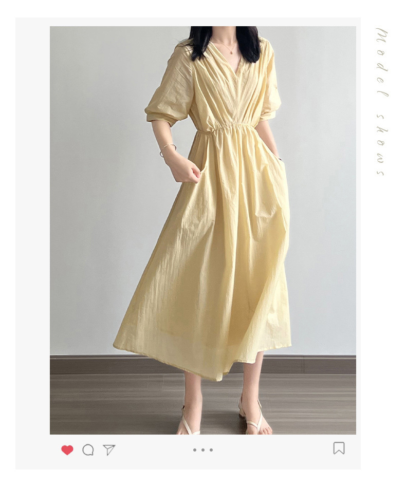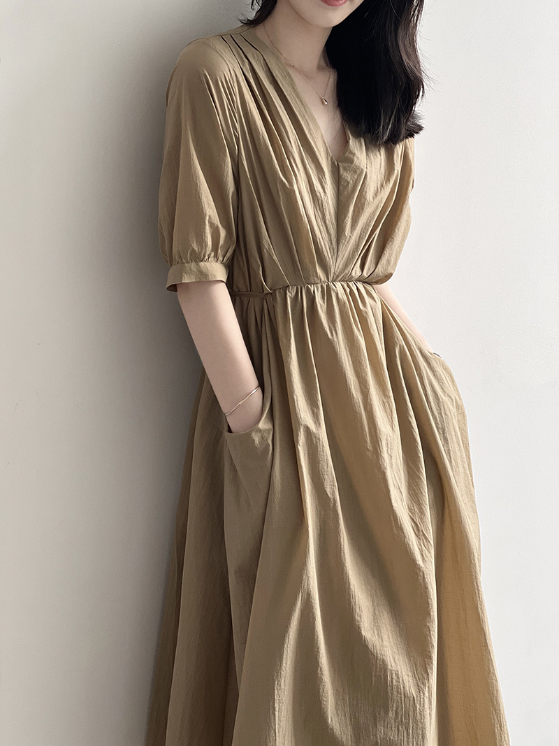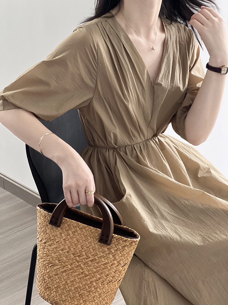 *o-ha-you*【FYS800829】復古V領褶皺連衣裙2024夏季新款氣質繫帶收腰中長裙洋裝-4色