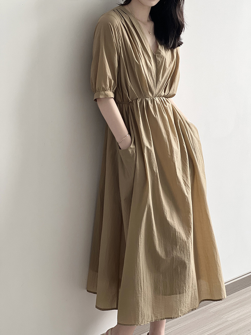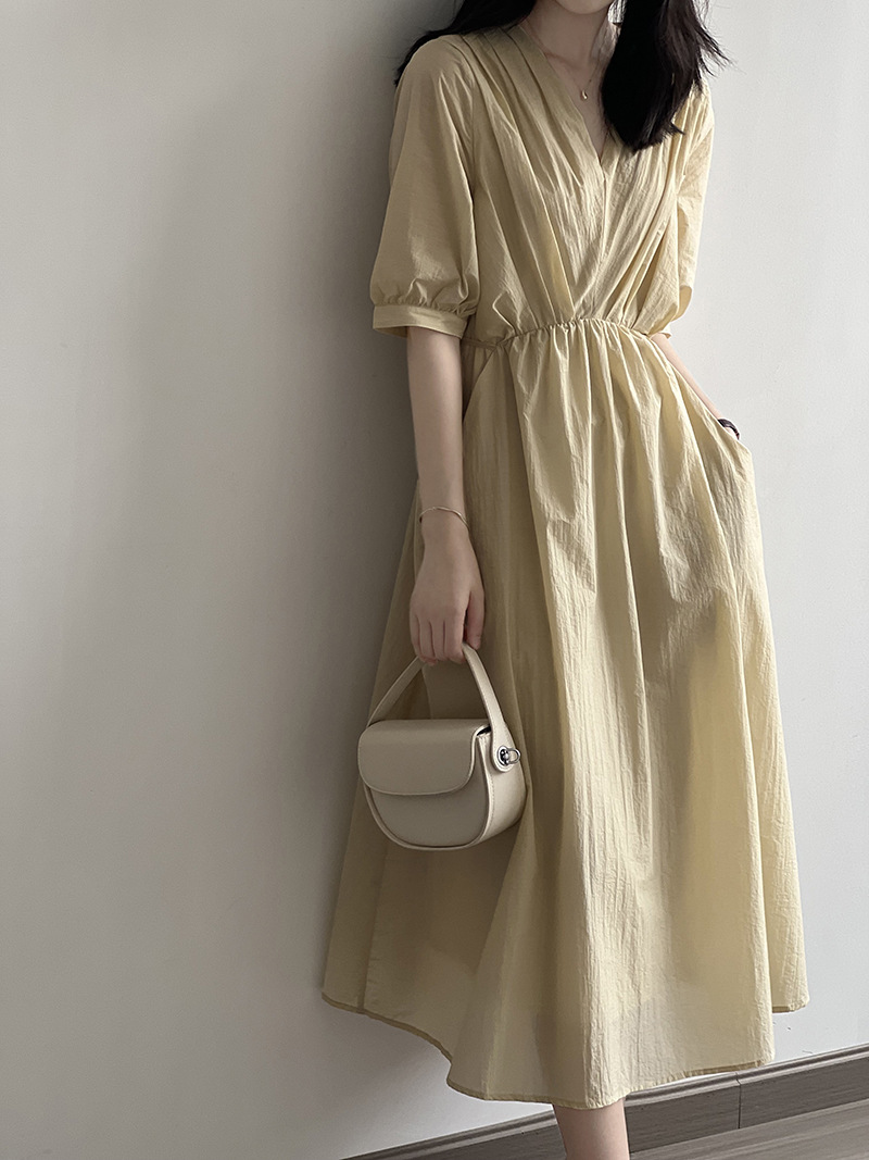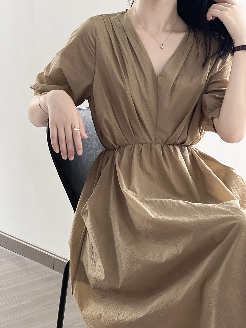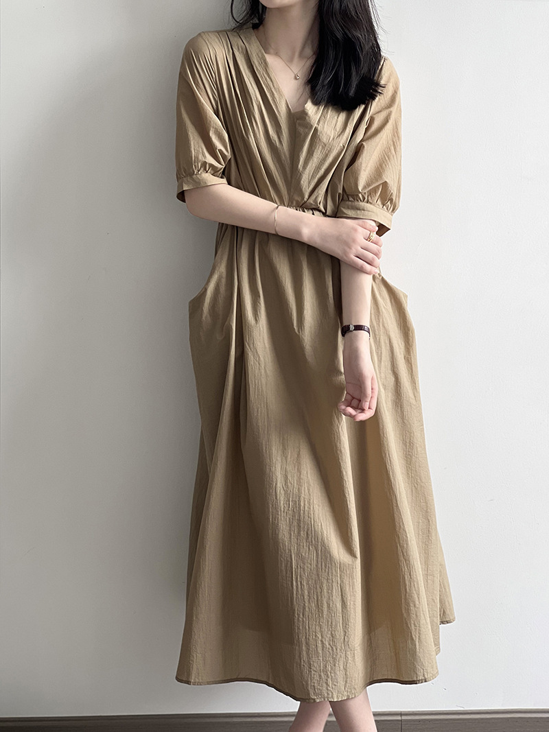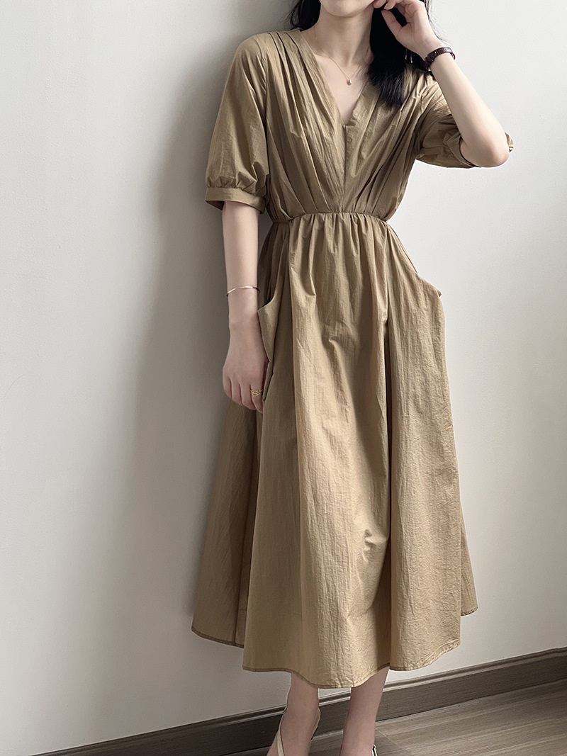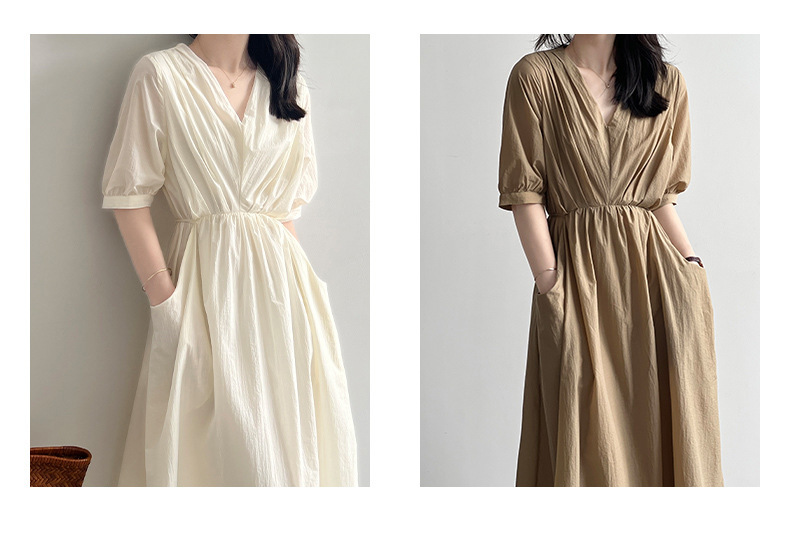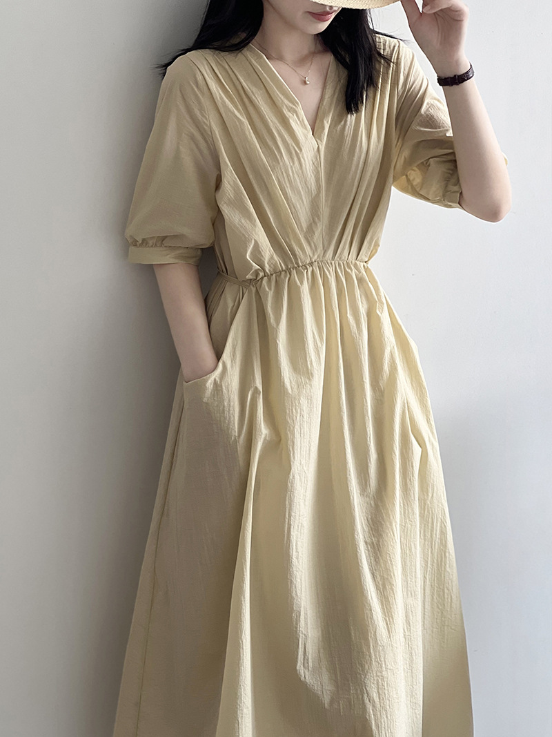 *o-ha-you*【FYS800829】復古V領褶皺連衣裙2024夏季新款氣質繫帶收腰中長裙洋裝-4色