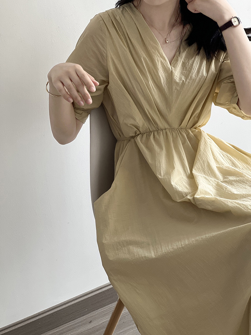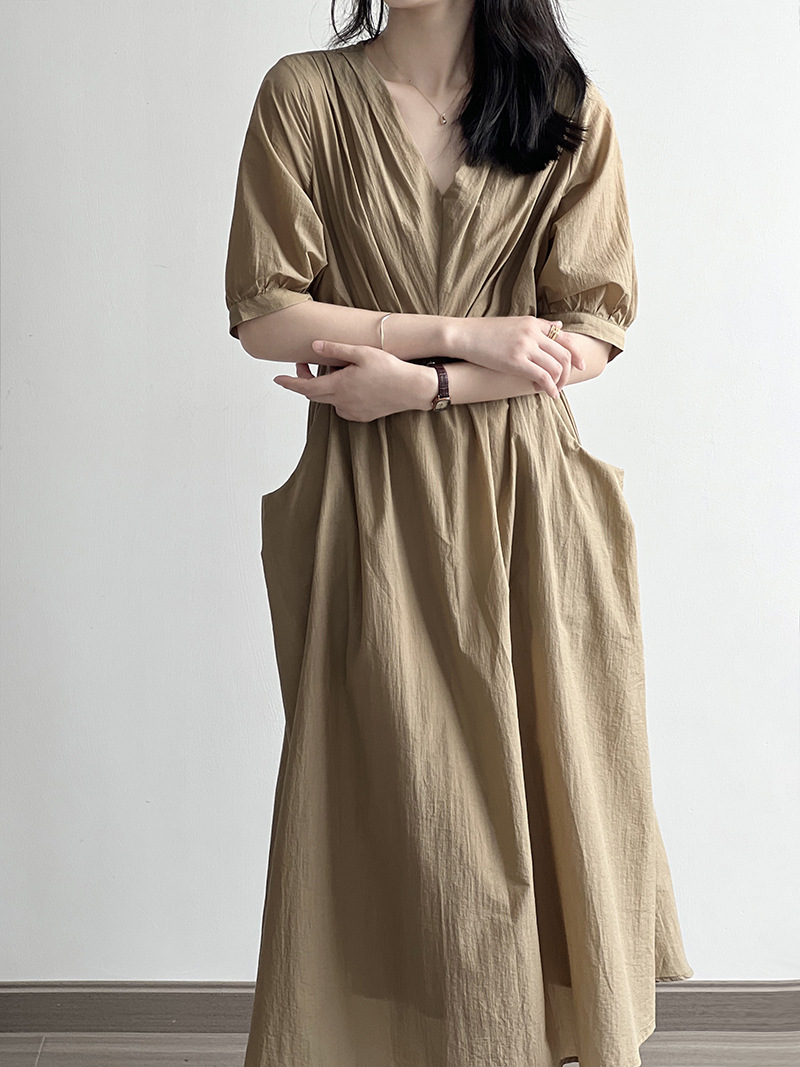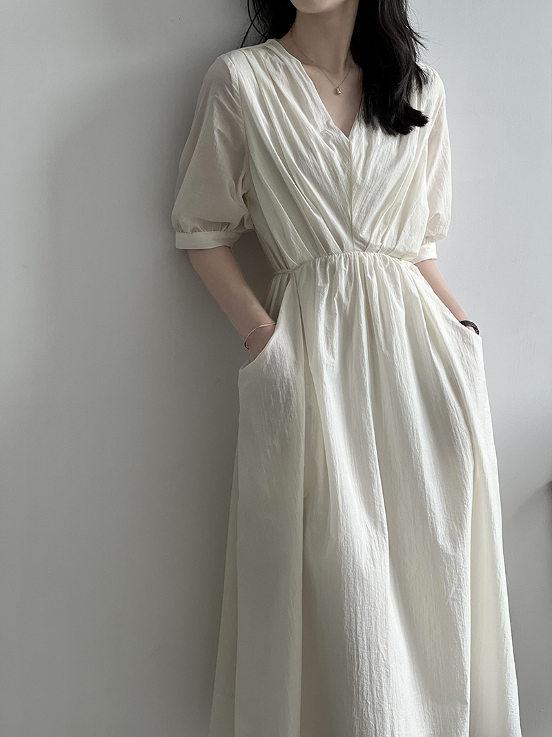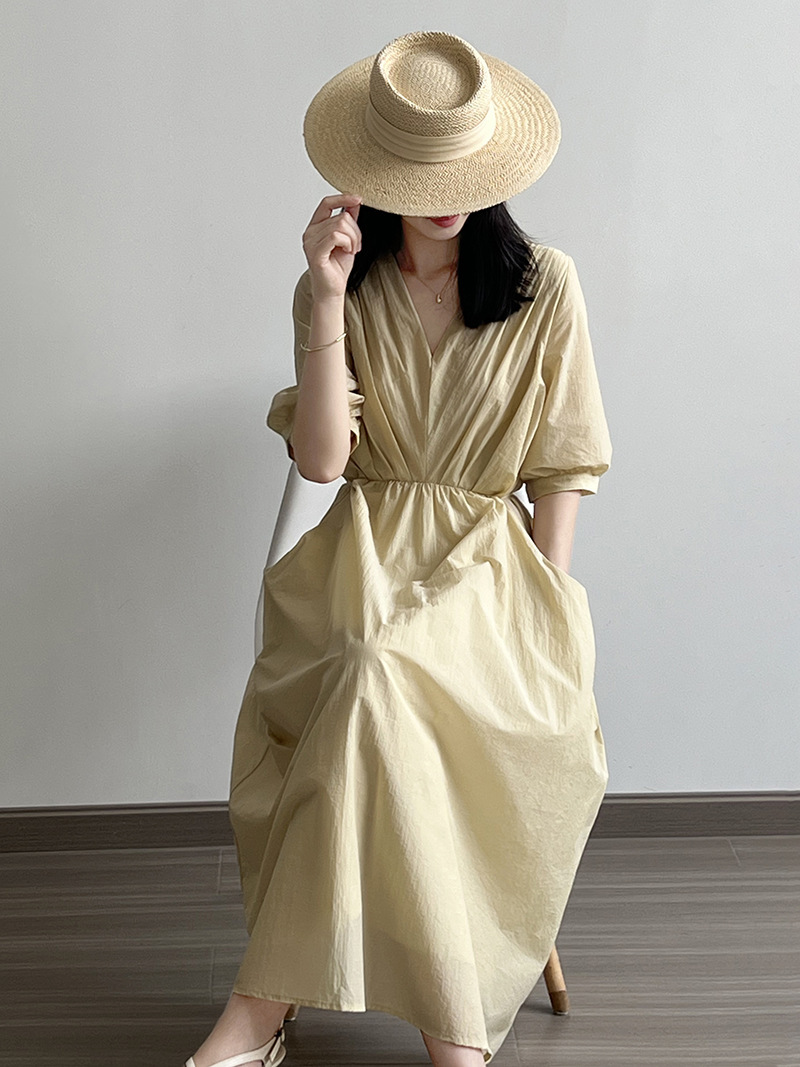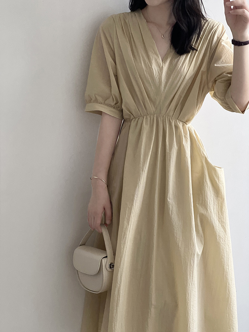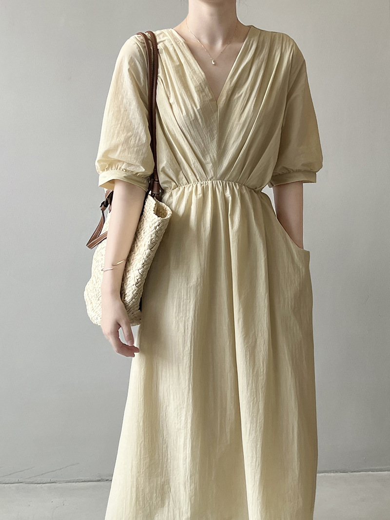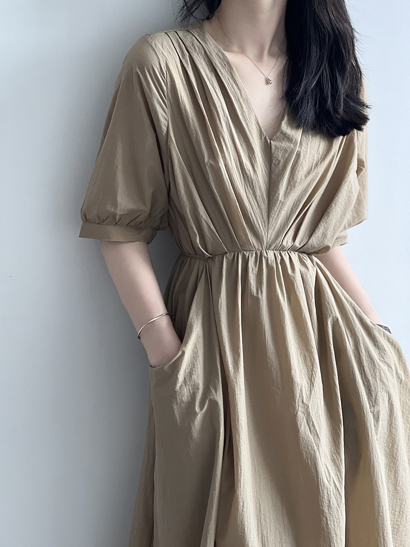 *o-ha-you*【FYS800829】復古V領褶皺連衣裙2024夏季新款氣質繫帶收腰中長裙洋裝-4色