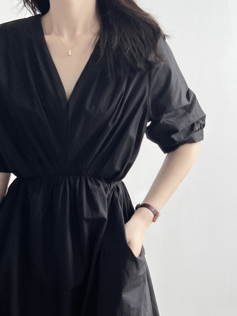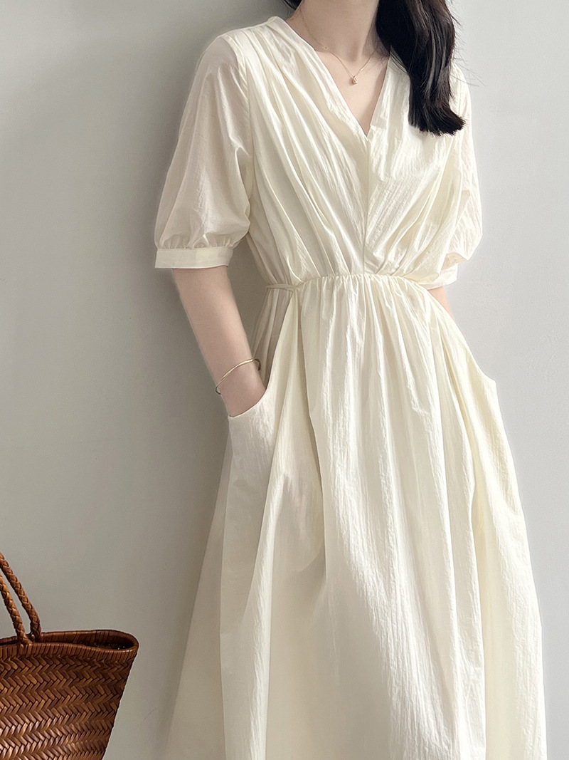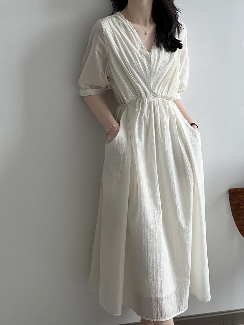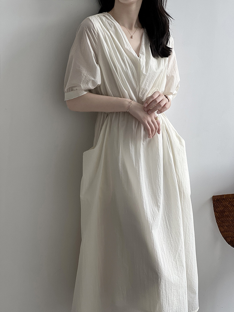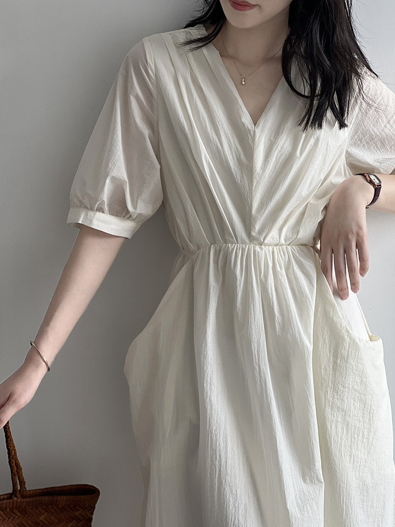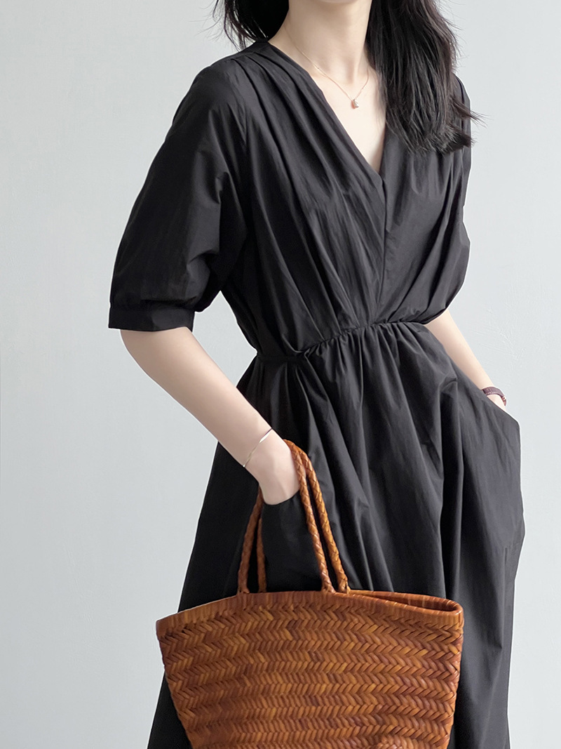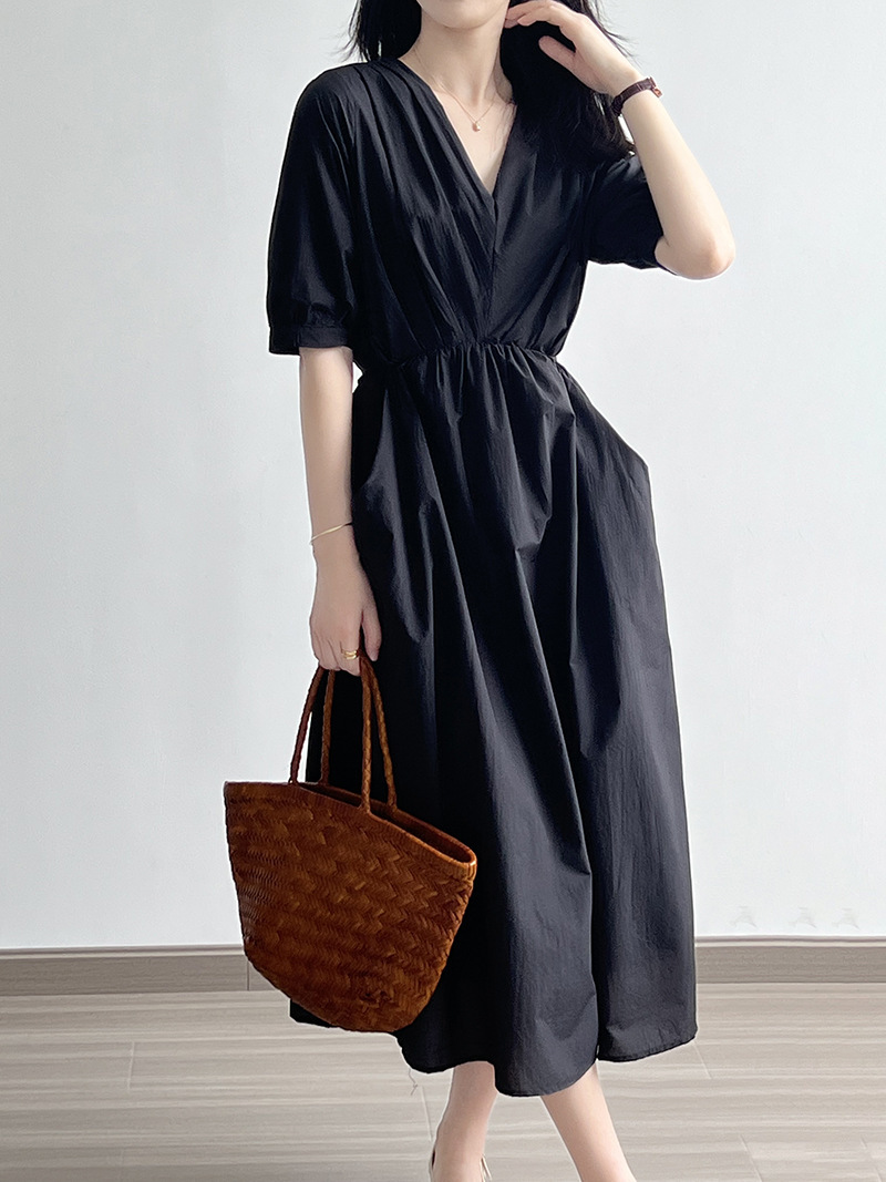 *o-ha-you*【FYS800829】復古V領褶皺連衣裙2024夏季新款氣質繫帶收腰中長裙洋裝-4色
