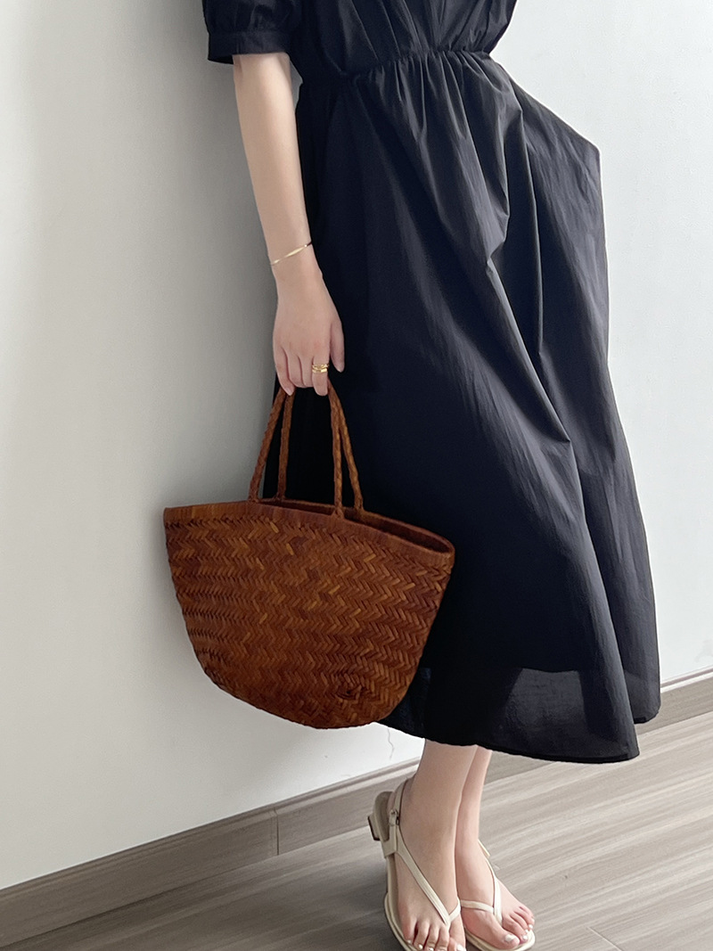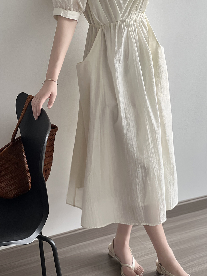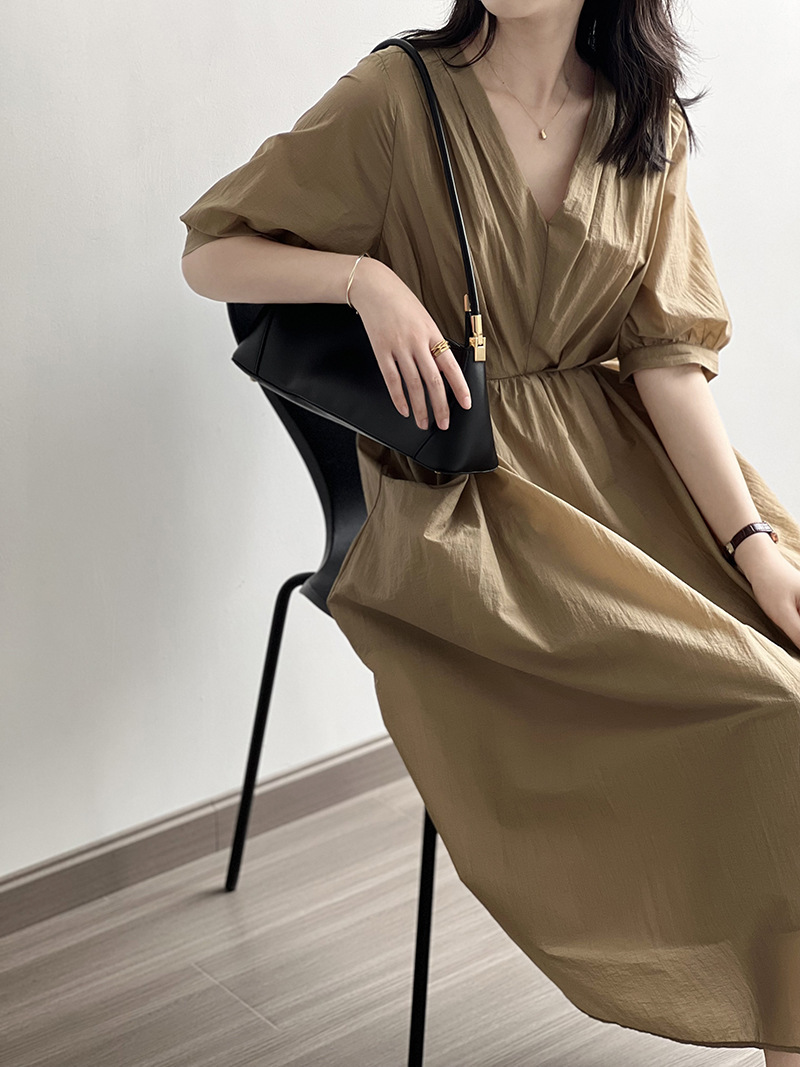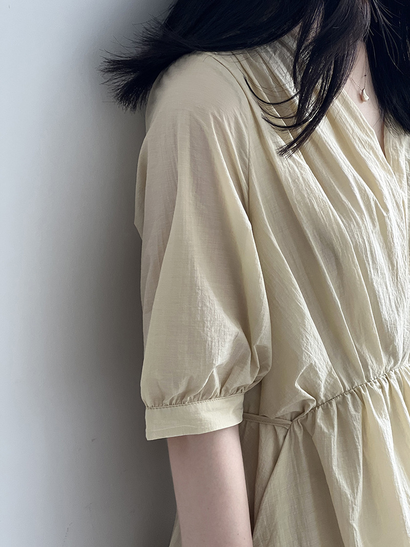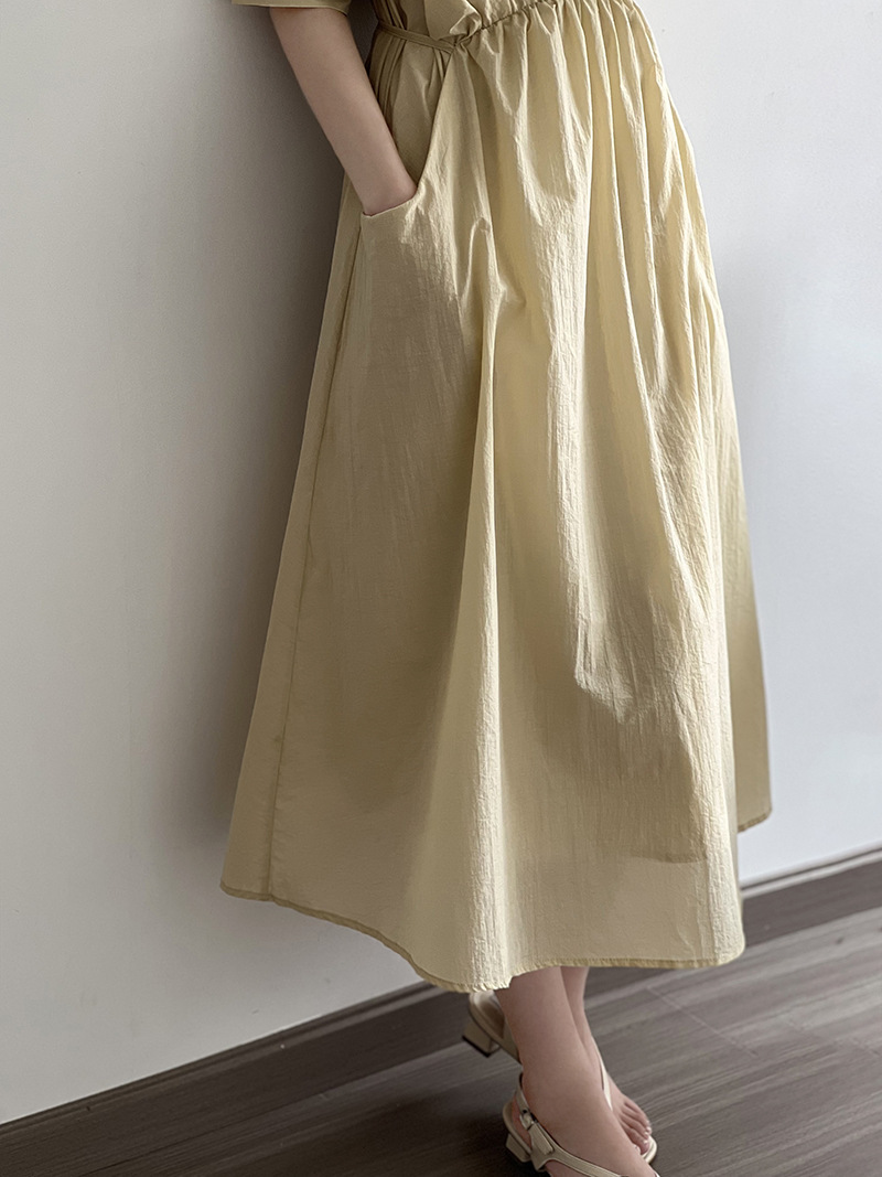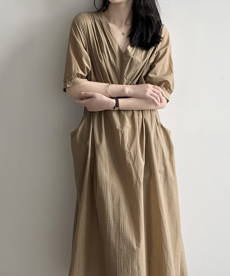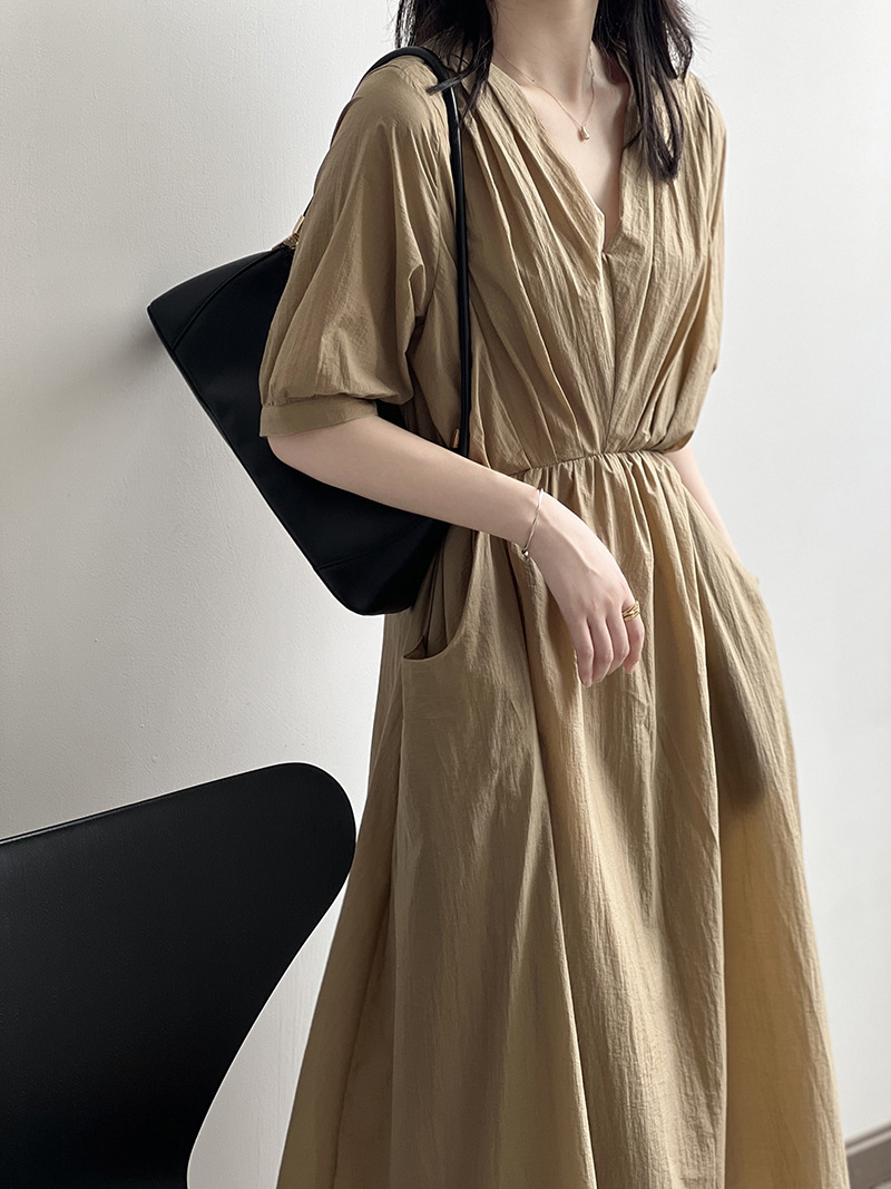 *o-ha-you*【FYS800829】復古V領褶皺連衣裙2024夏季新款氣質繫帶收腰中長裙洋裝-4色