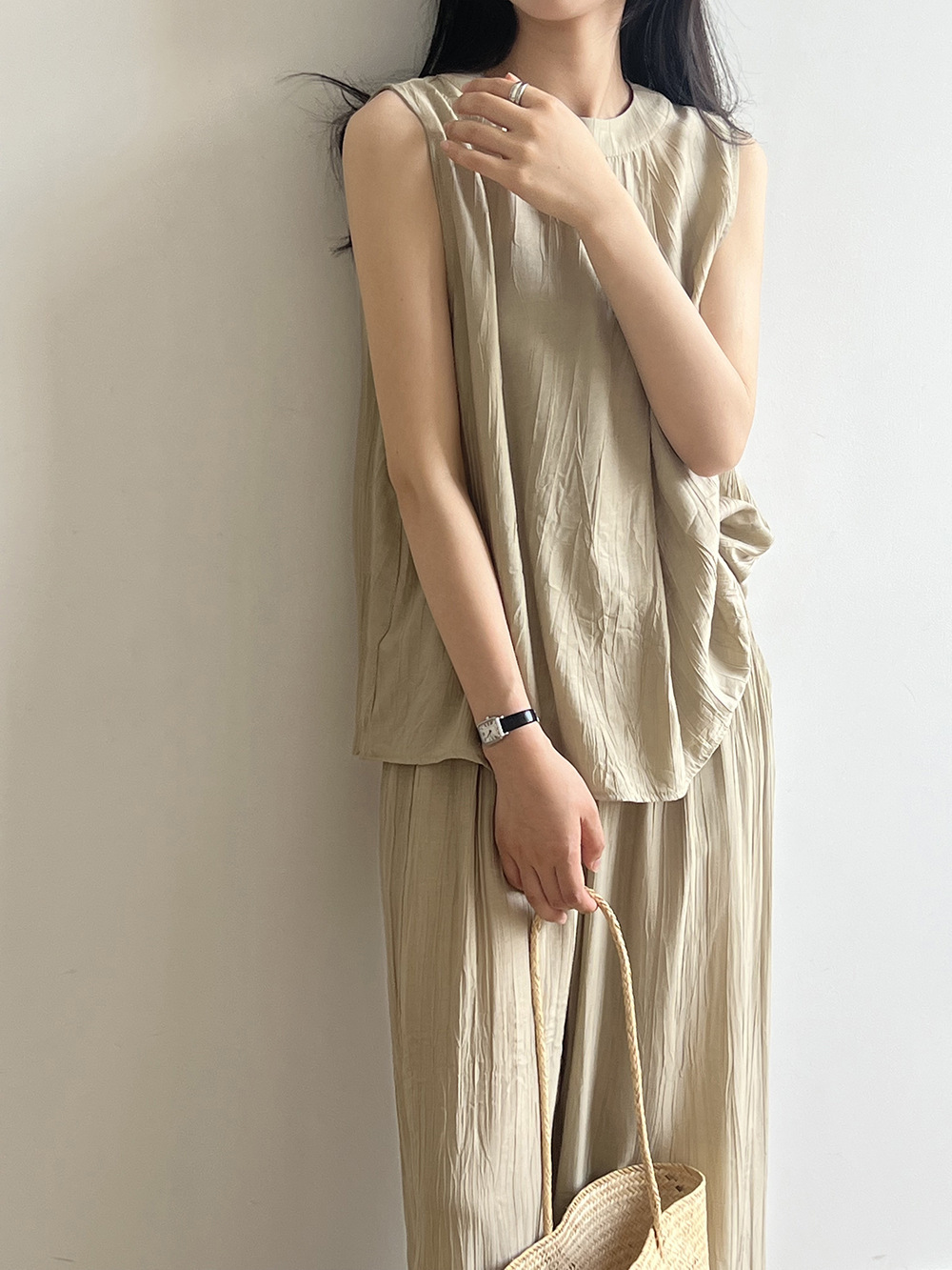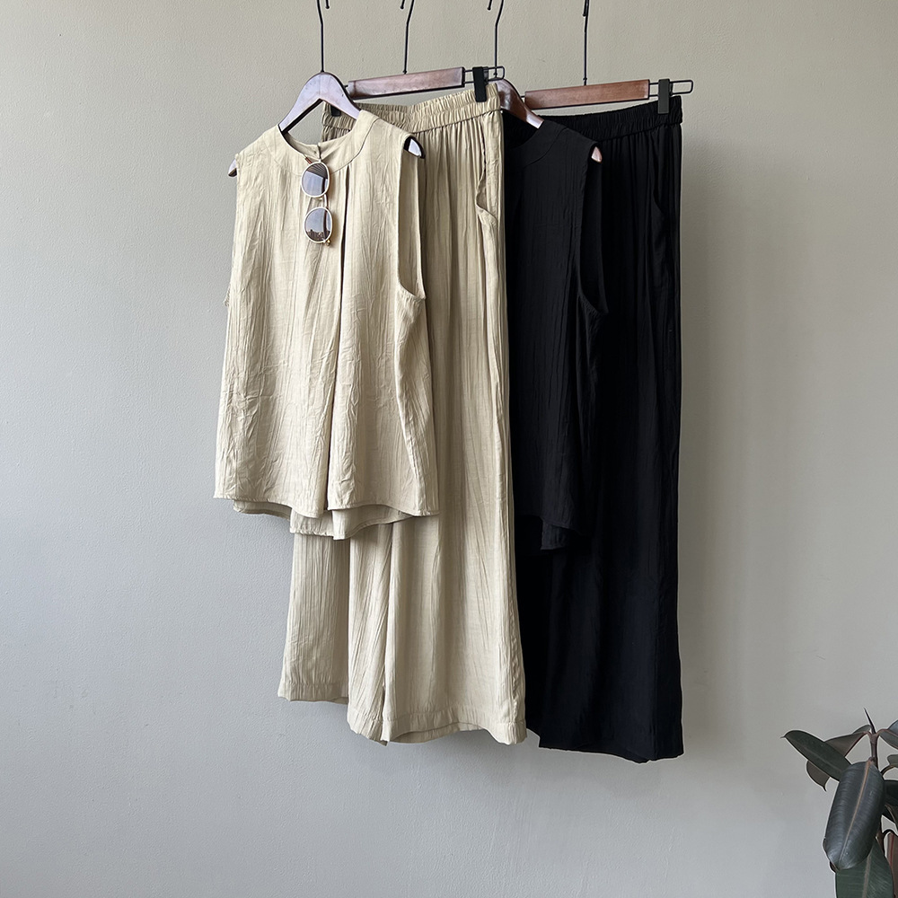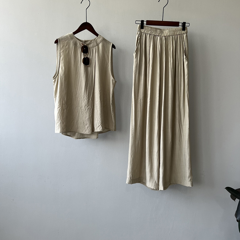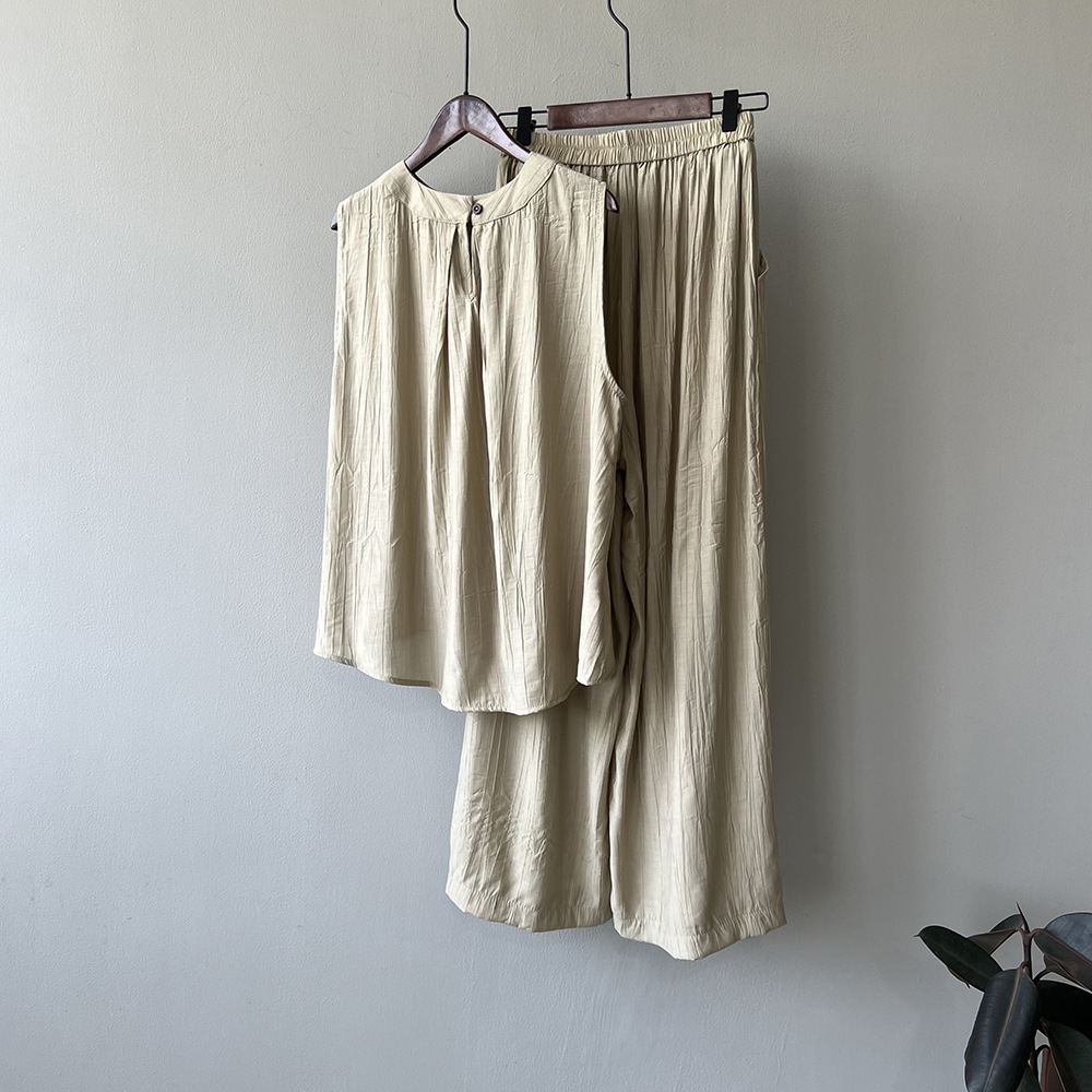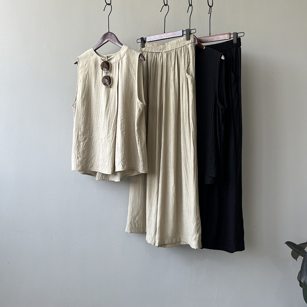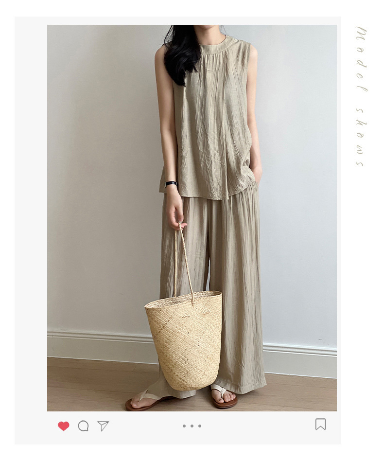 *o-ha-you*【FYS802059】氣質薄款無袖背心套裝2024夏季褶皺襯衫闊腿褲兩件套-2色