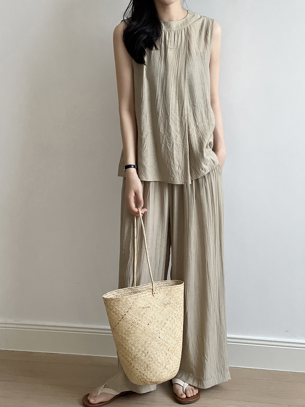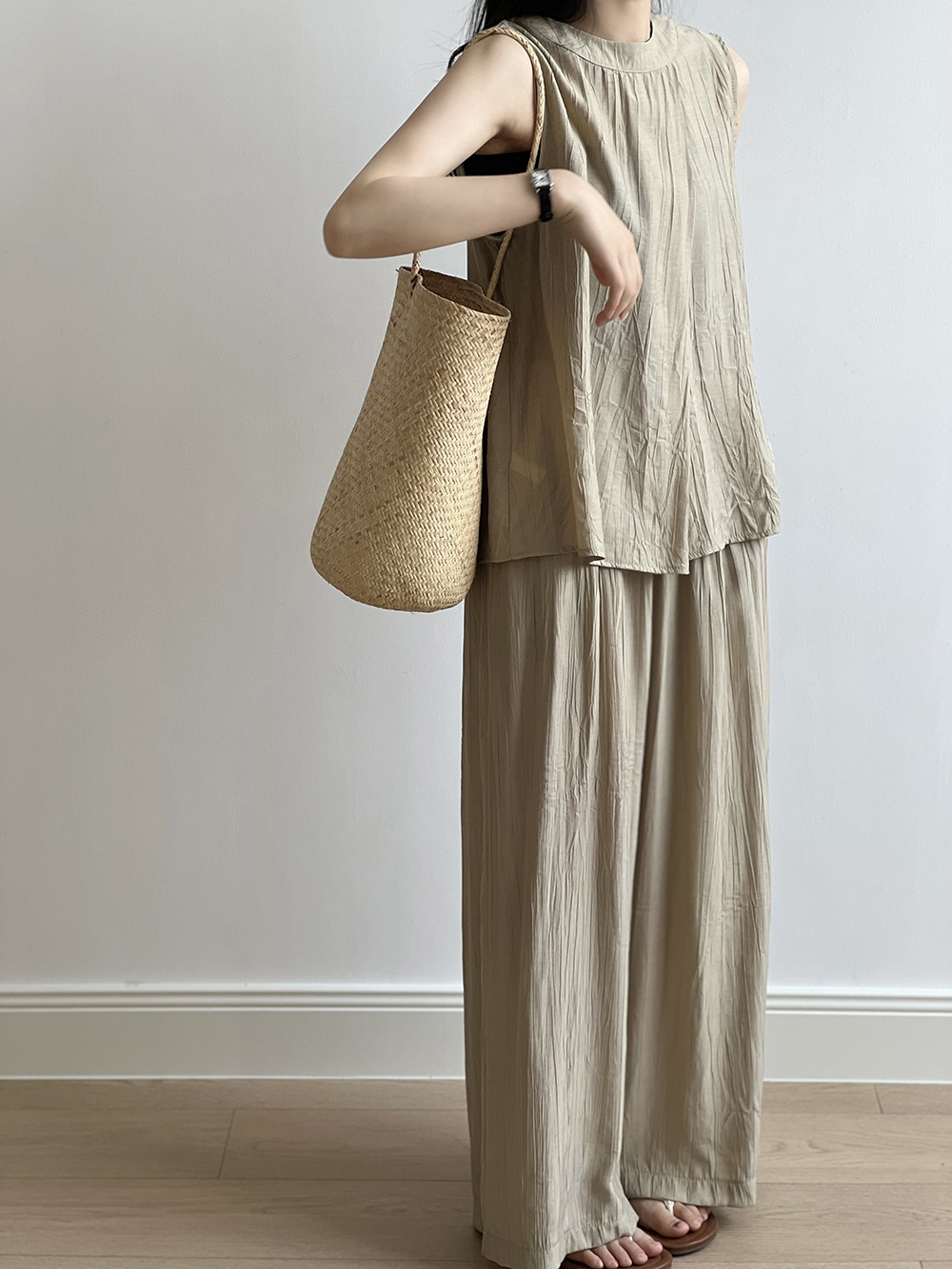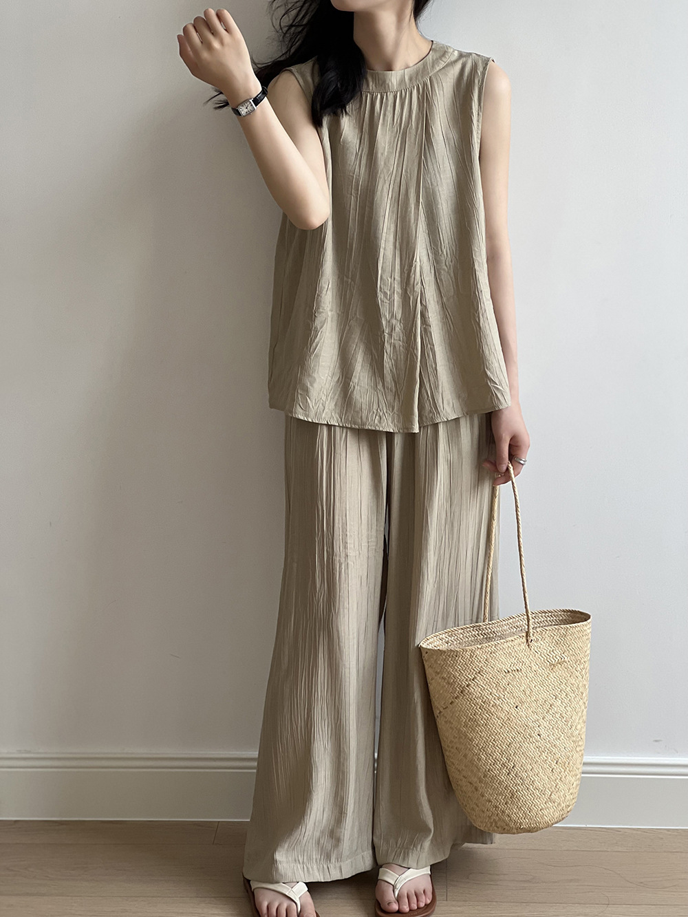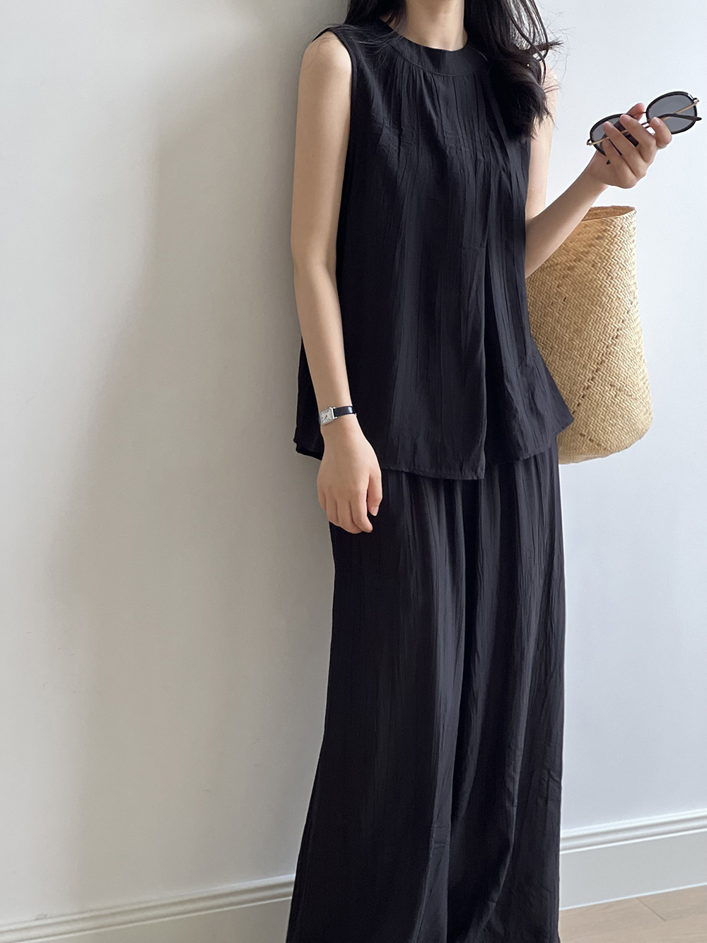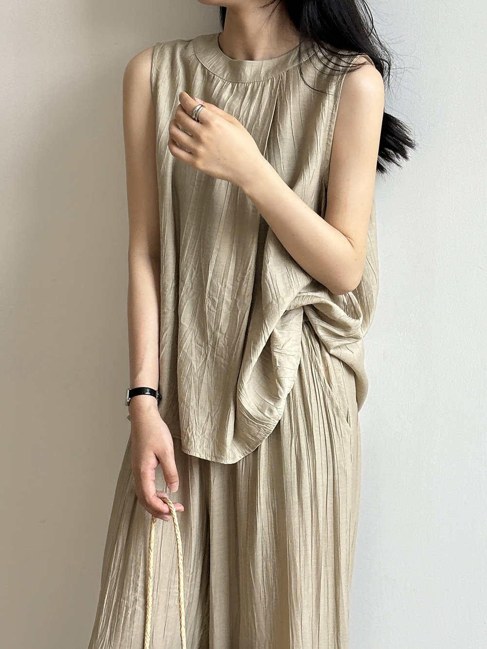 *o-ha-you*【FYS802059】氣質薄款無袖背心套裝2024夏季褶皺襯衫闊腿褲兩件套-2色