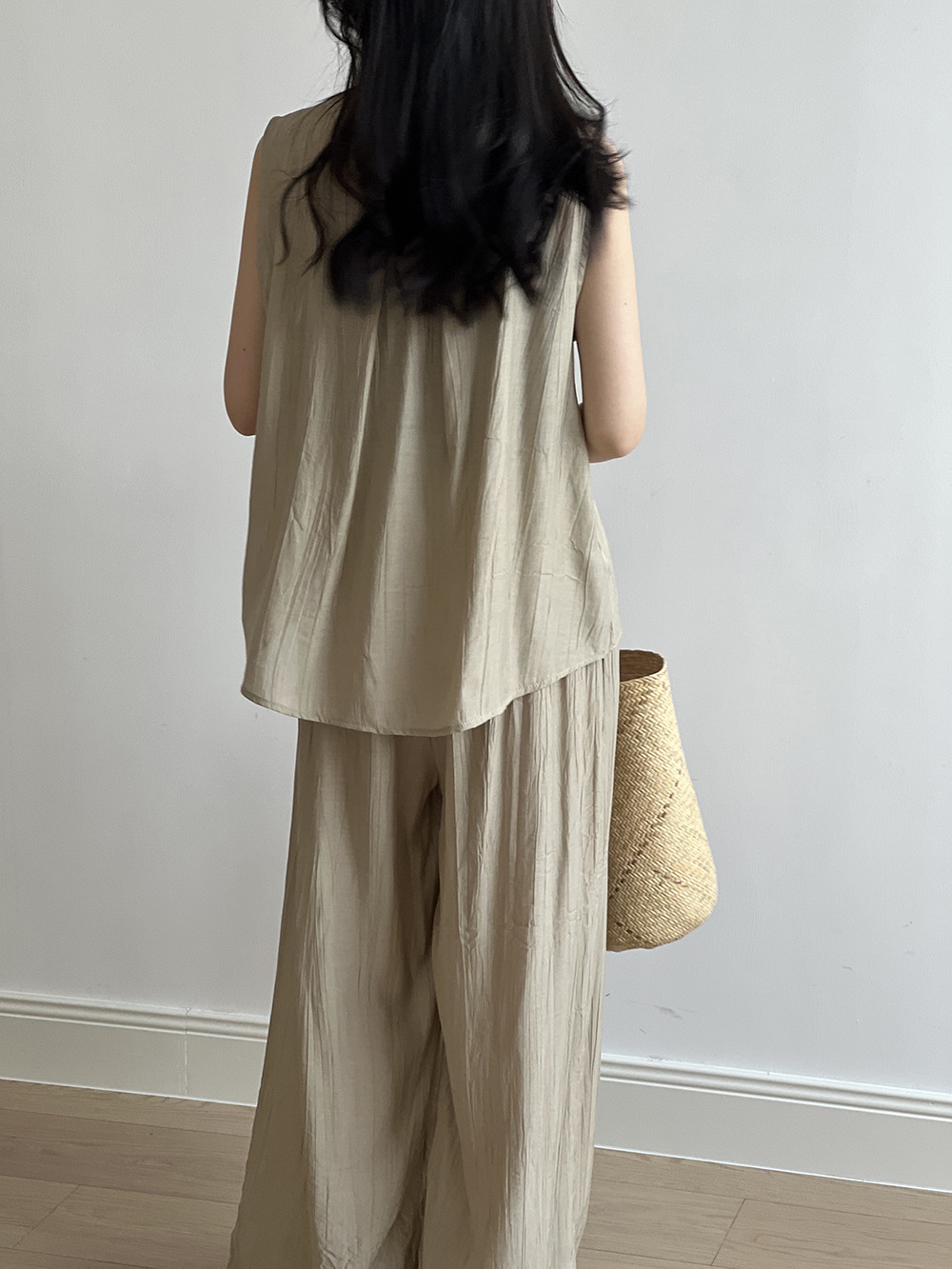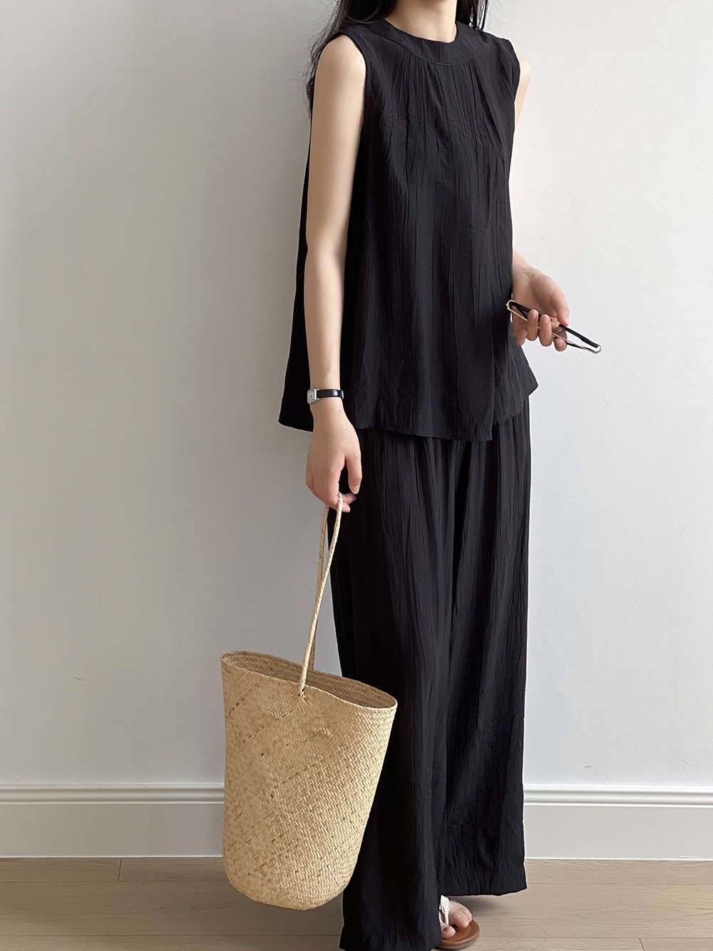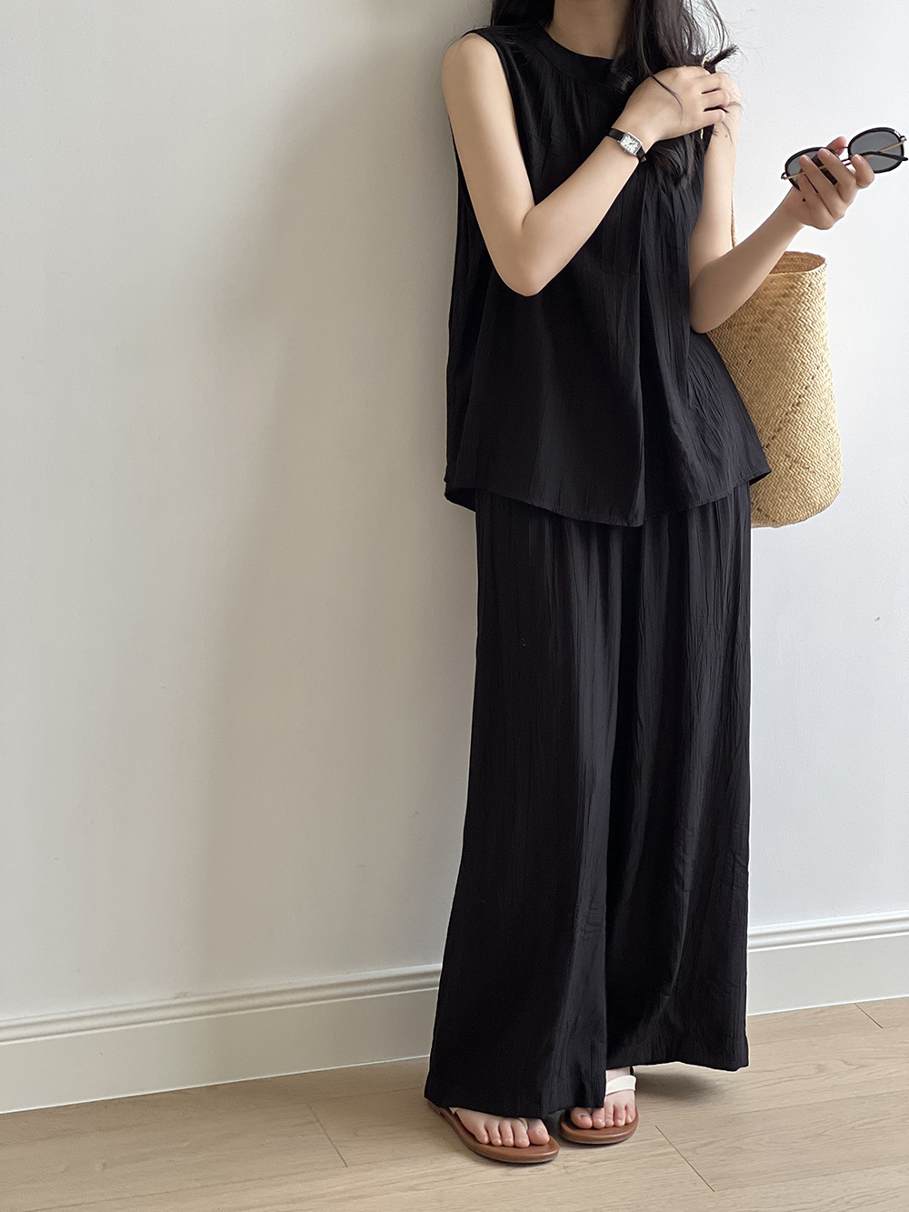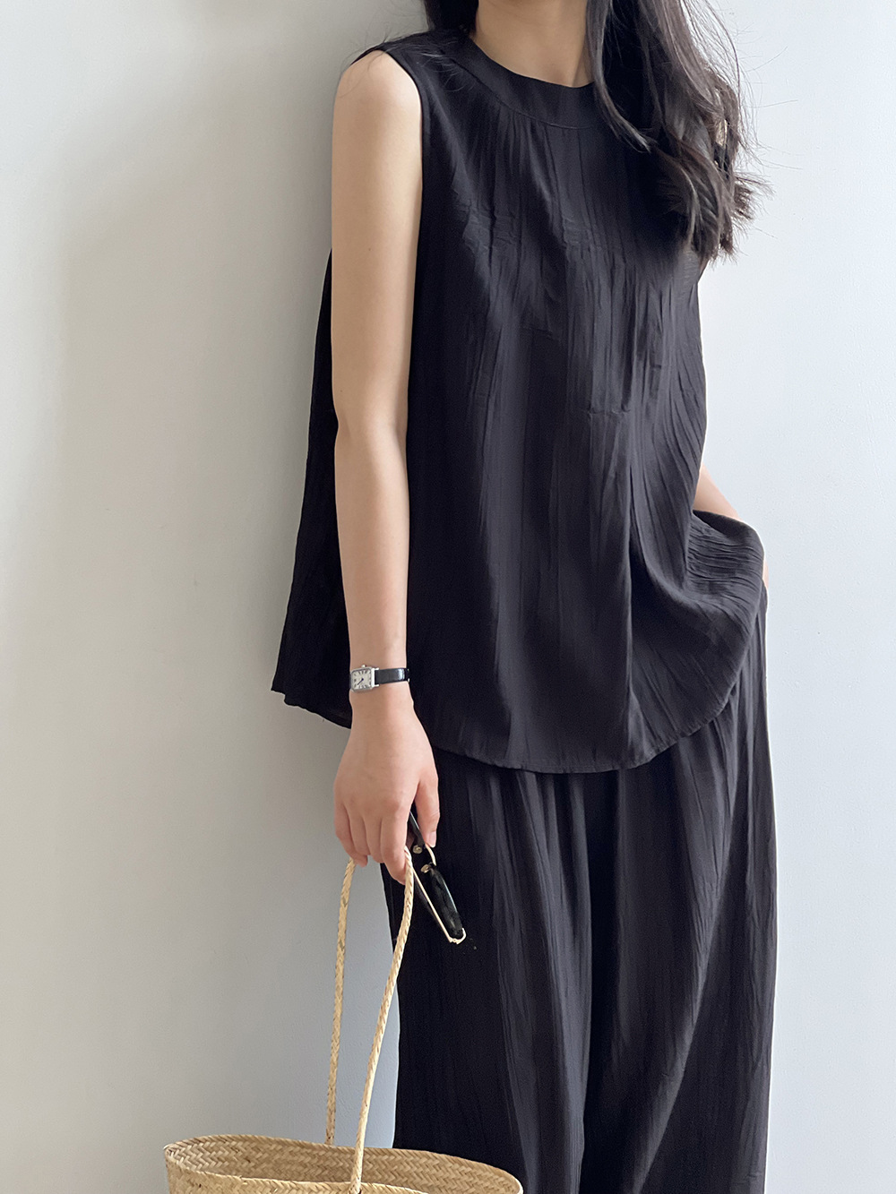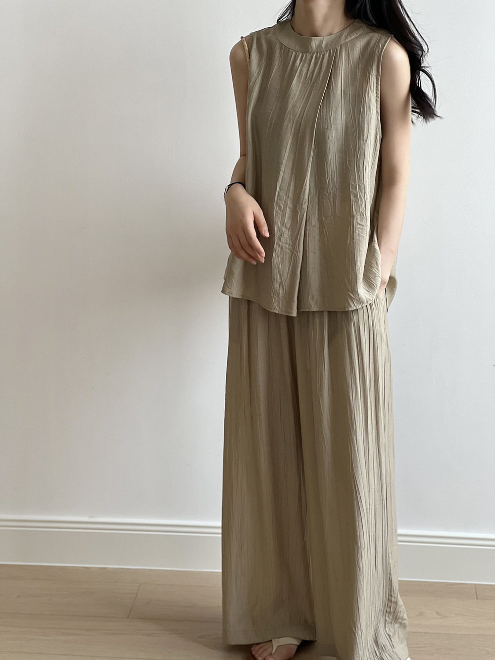 *o-ha-you*【FYS802059】氣質薄款無袖背心套裝2024夏季褶皺襯衫闊腿褲兩件套-2色