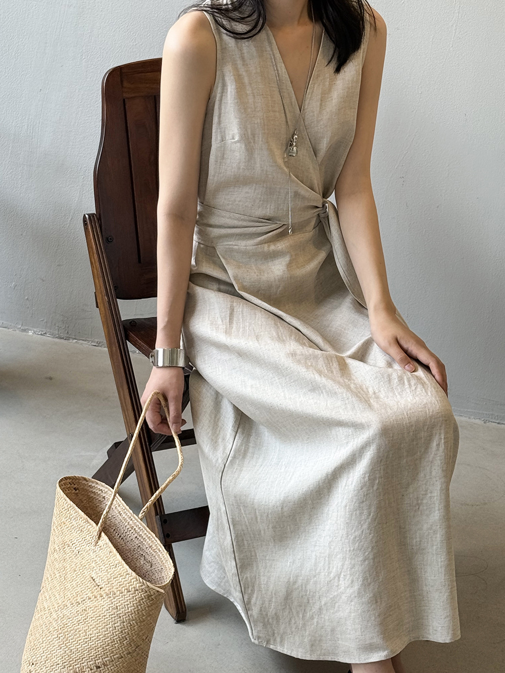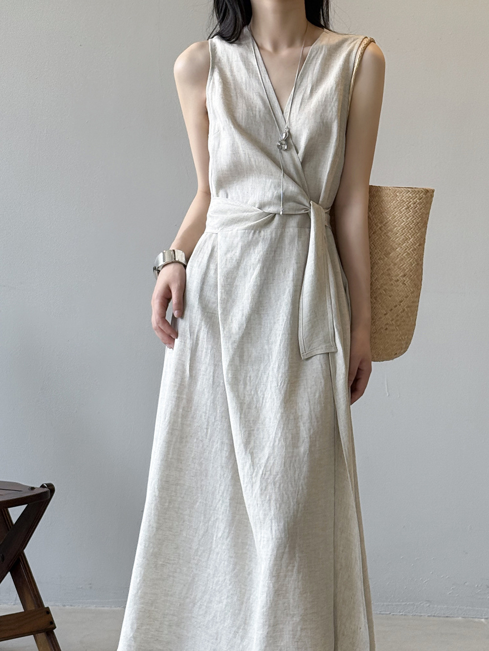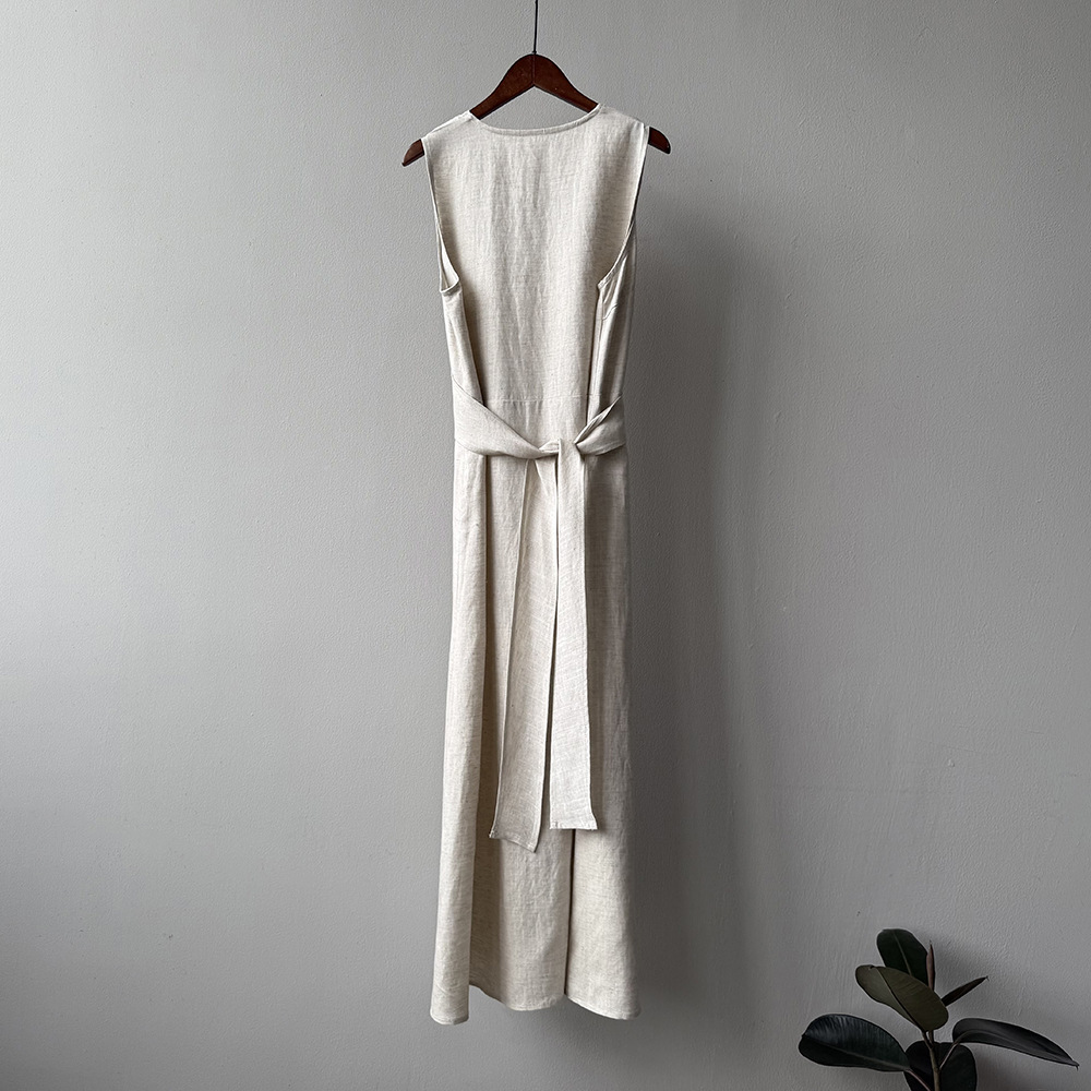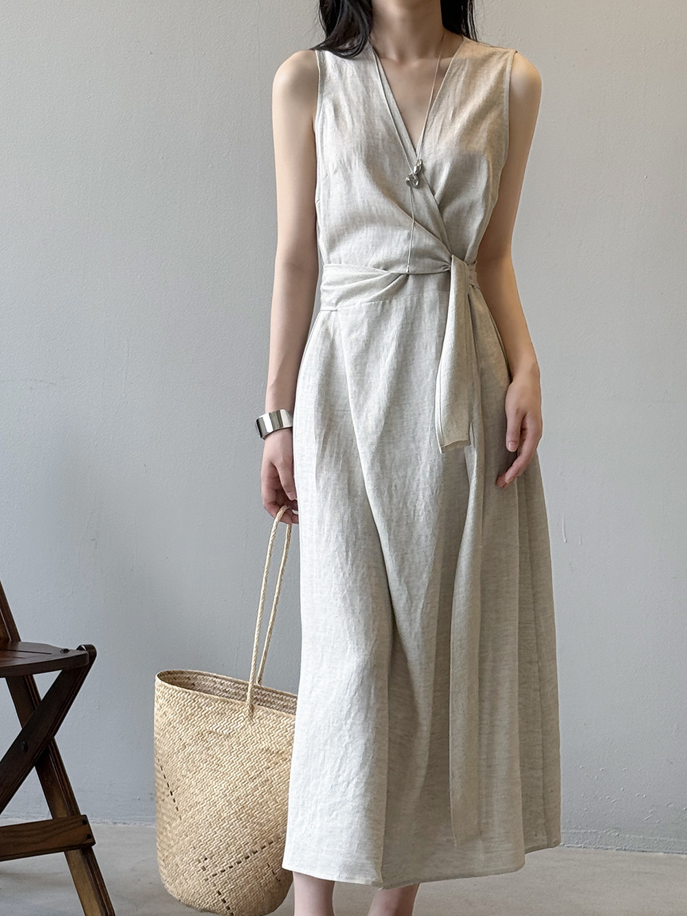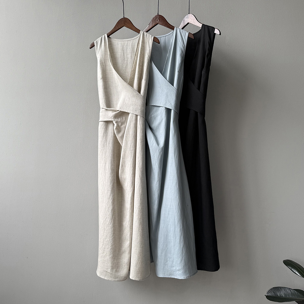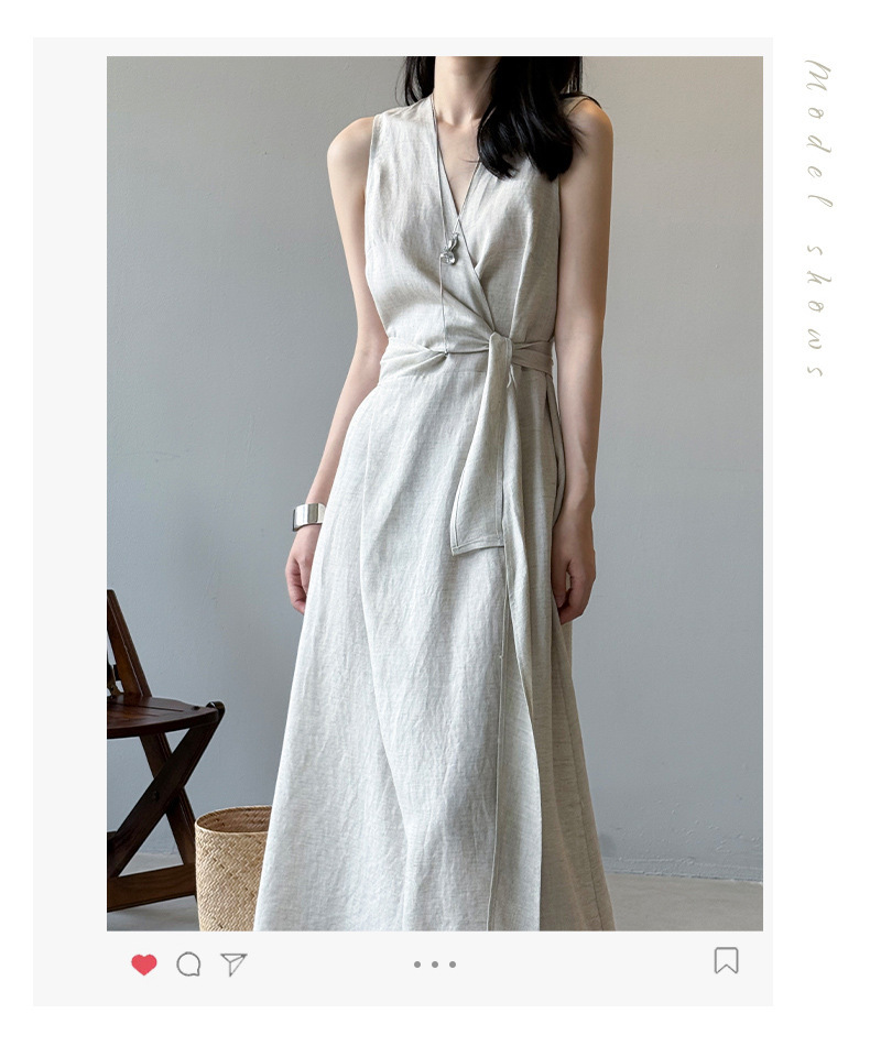 *o-ha-you*【FYS802313】法式天絲亞麻無袖背心V領連衣裙夏季韓版時尚百搭裙子洋裝-3色-麻本色M有現貨