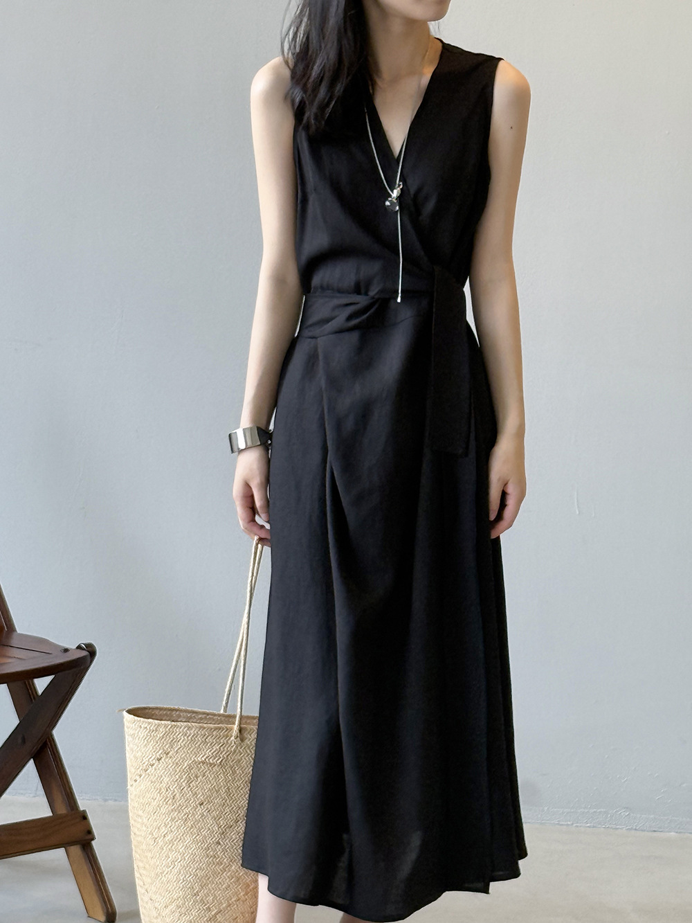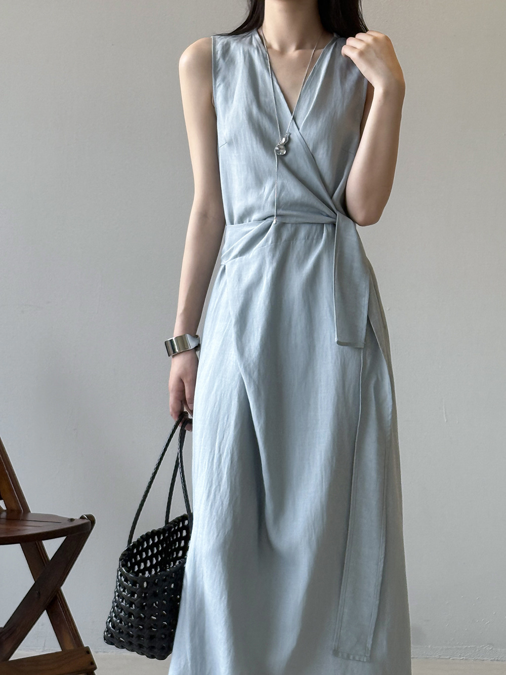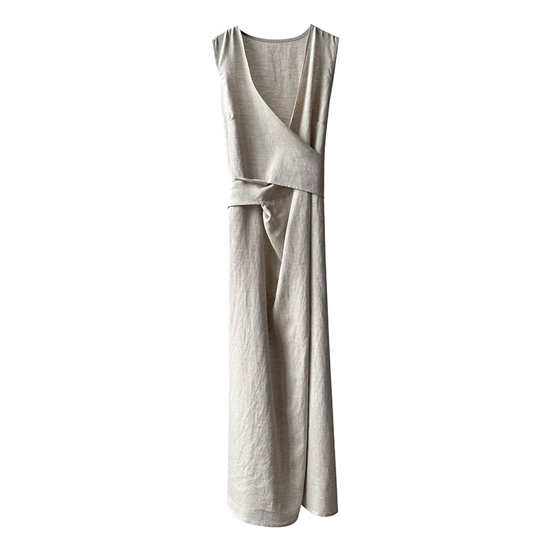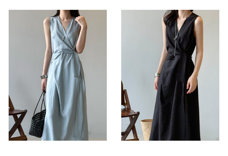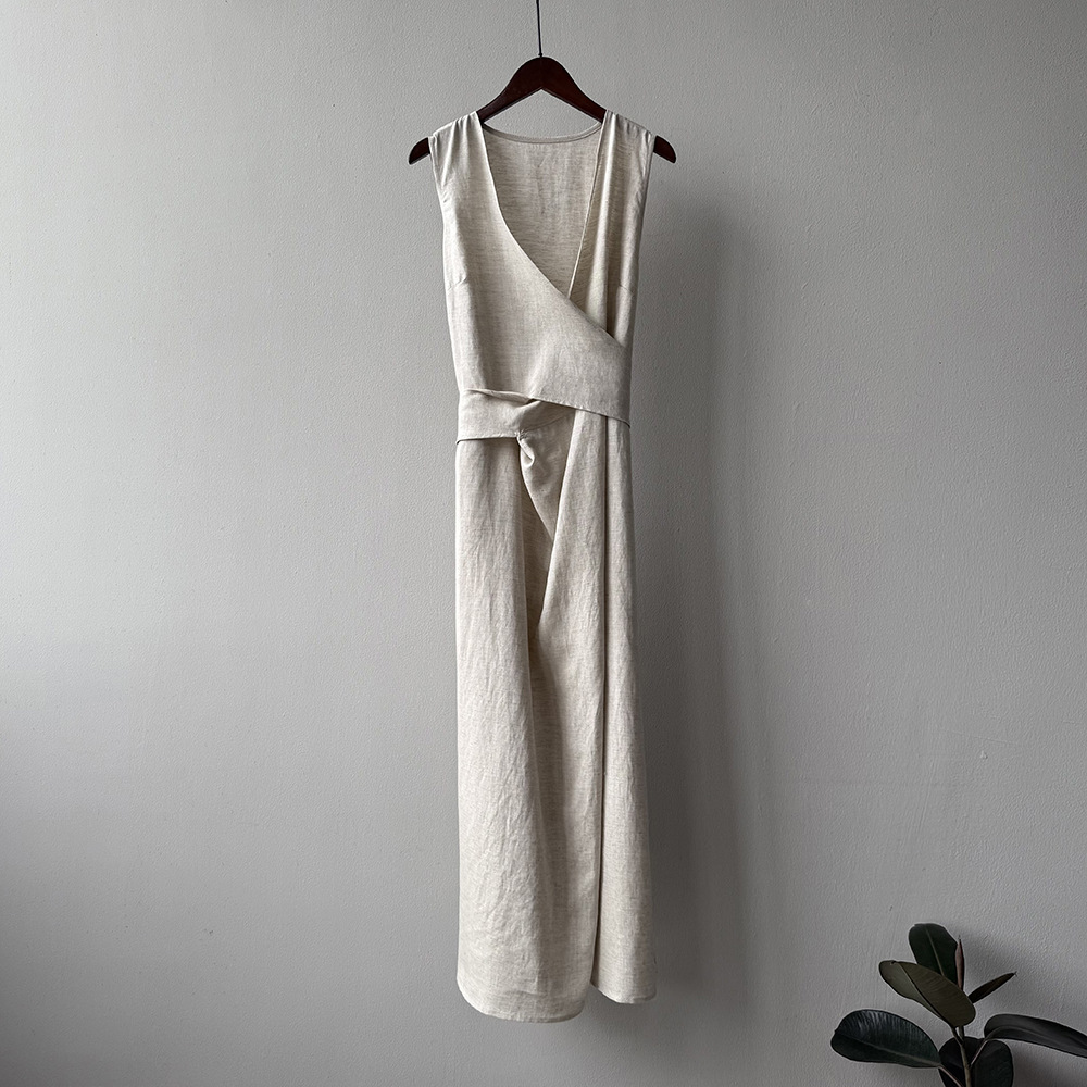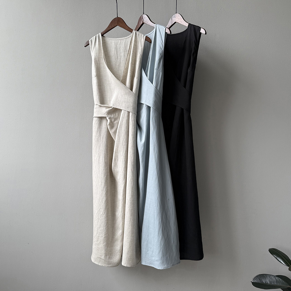 *o-ha-you*【FYS802313】法式天絲亞麻無袖背心V領連衣裙夏季韓版時尚百搭裙子洋裝-3色-麻本色M有現貨