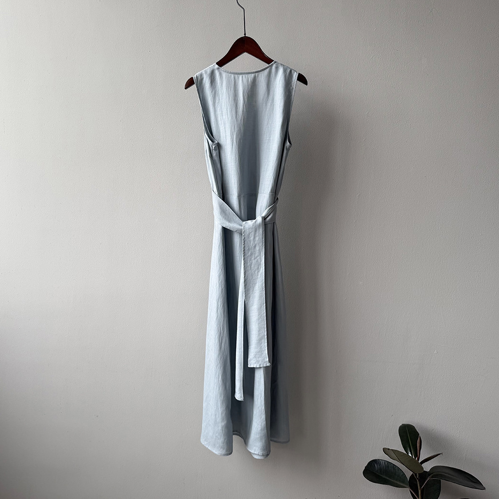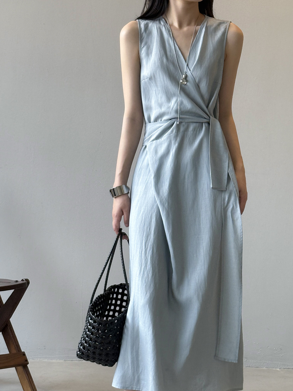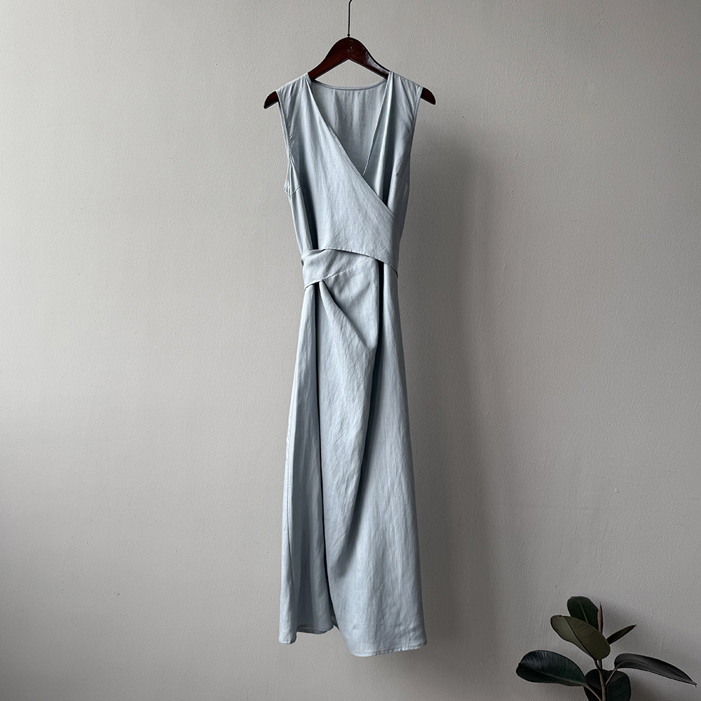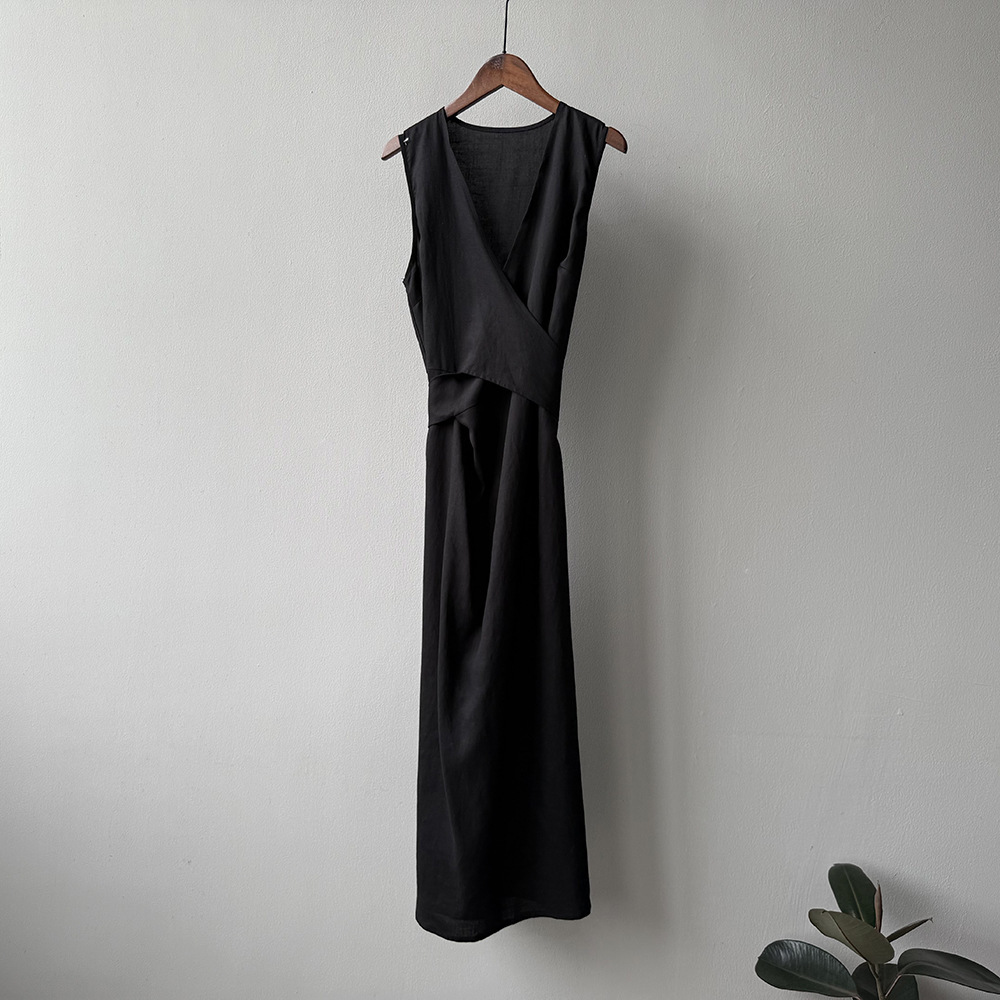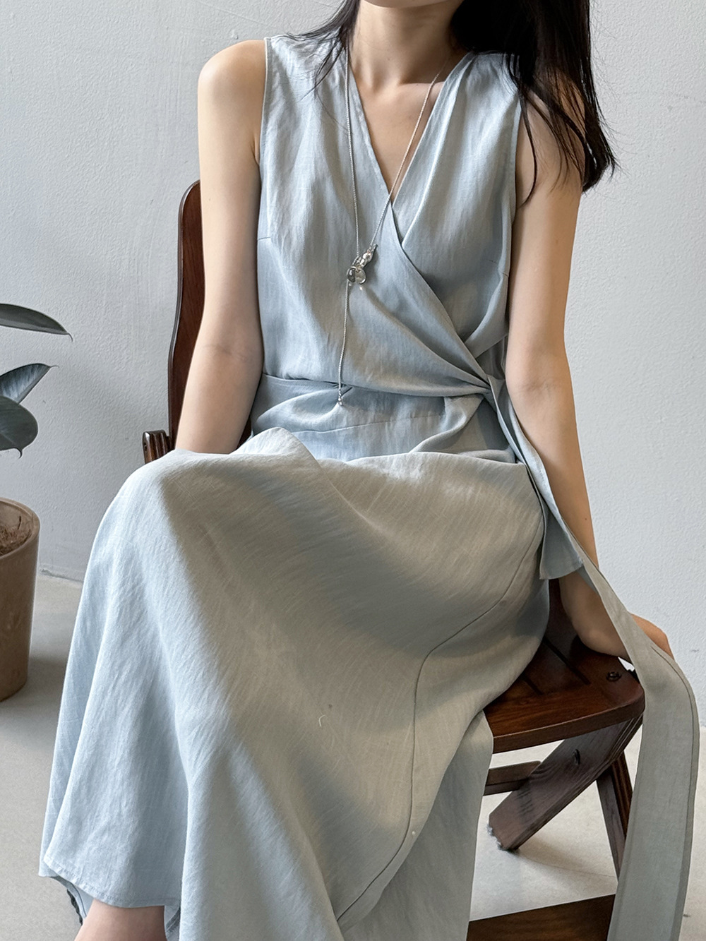 *o-ha-you*【FYS802313】法式天絲亞麻無袖背心V領連衣裙夏季韓版時尚百搭裙子洋裝-3色-麻本色M有現貨