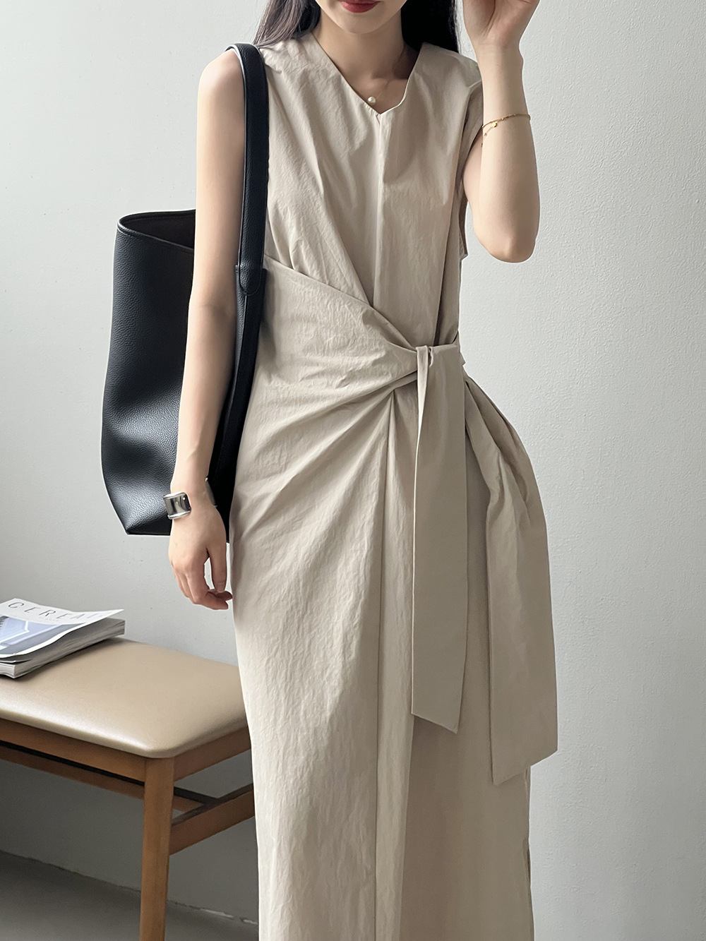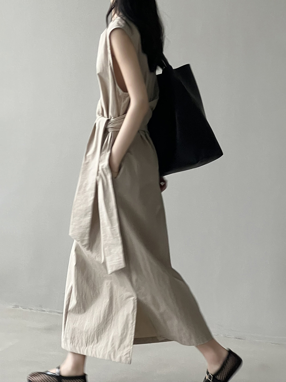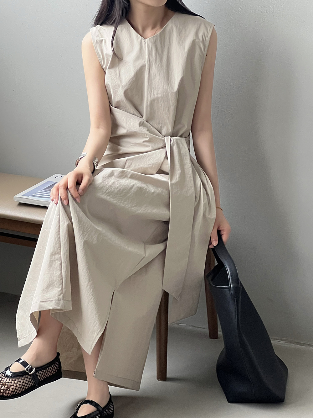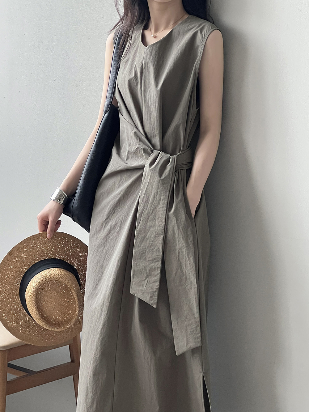 *o-ha-you*【FYS90098】收腰綁帶無袖連衣裙2024夏季新款設計感茶歇法式A字長裙洋裝-2色