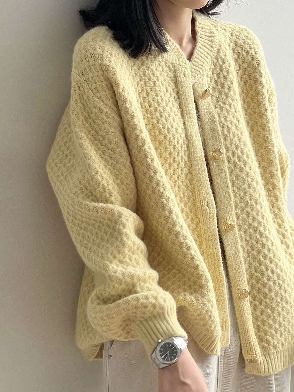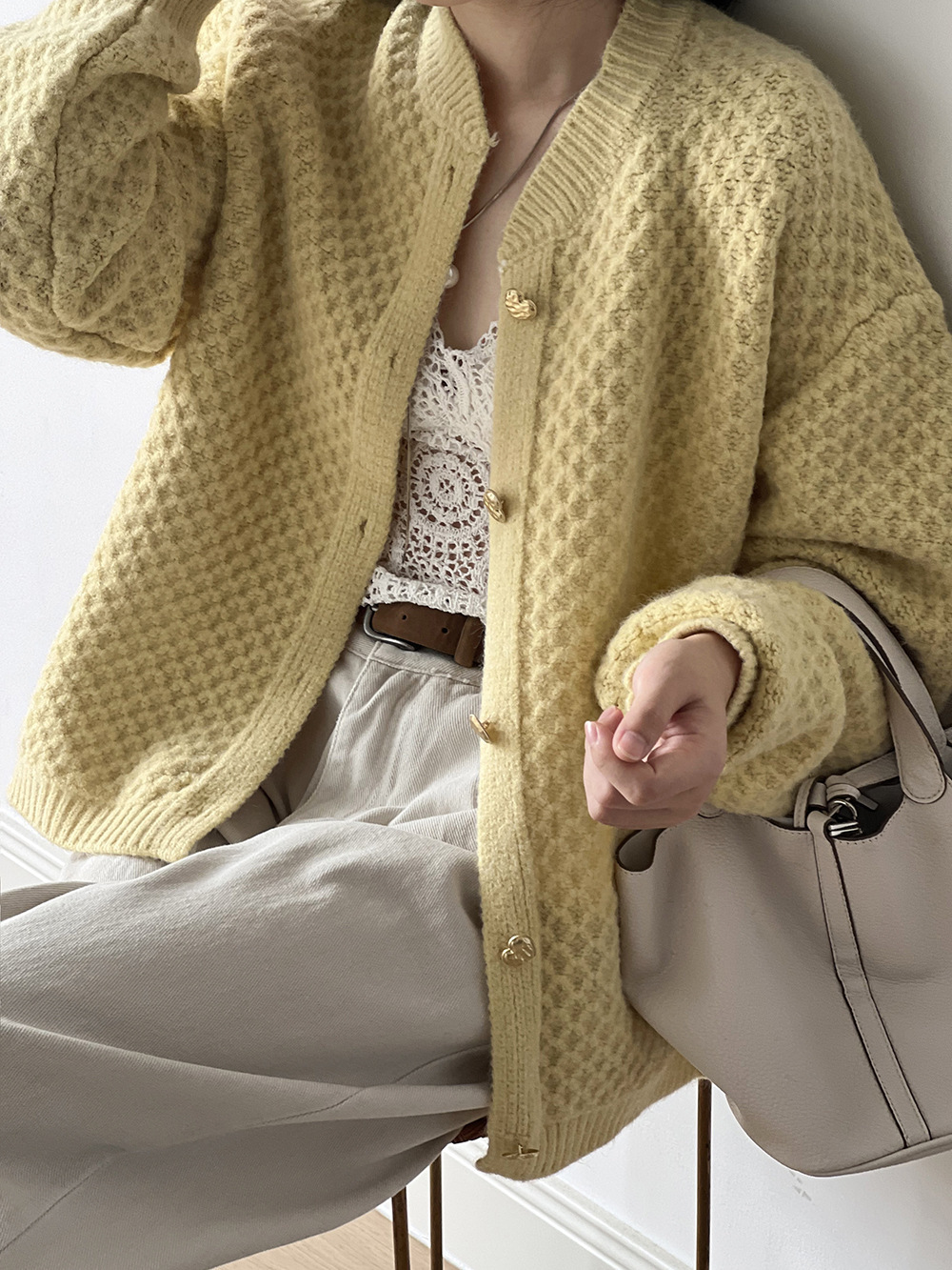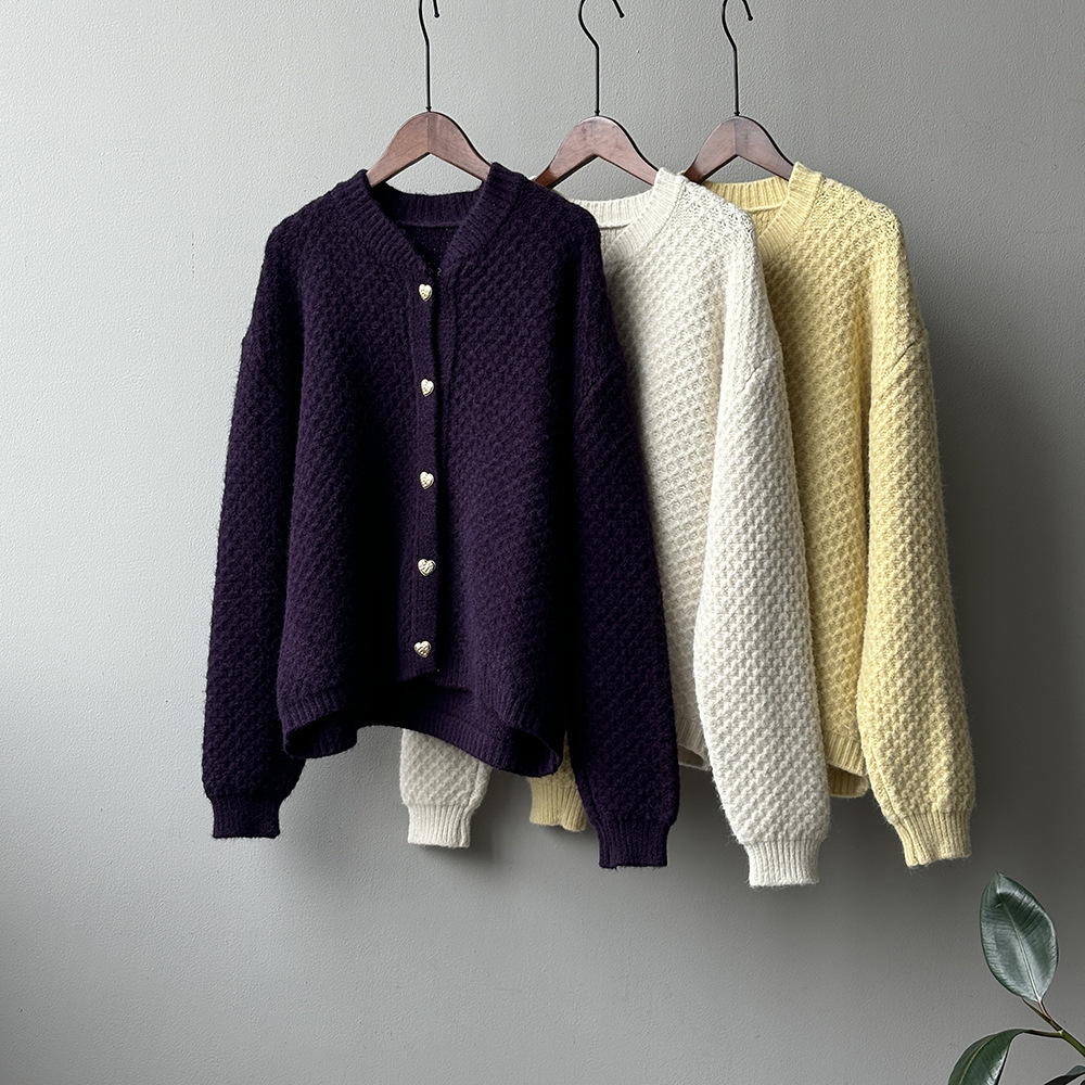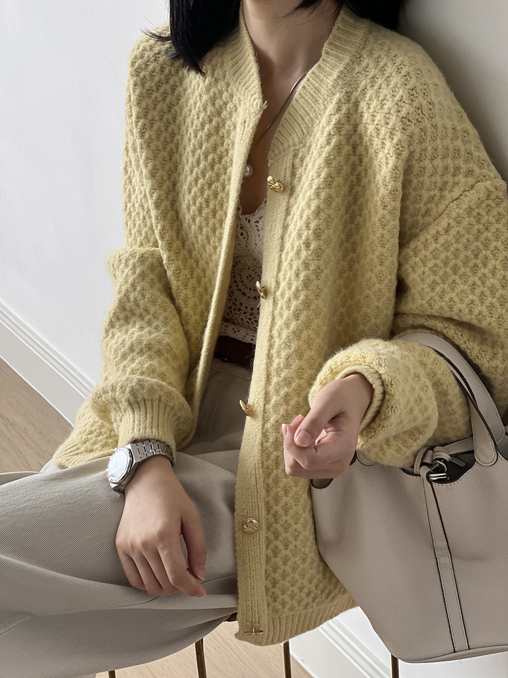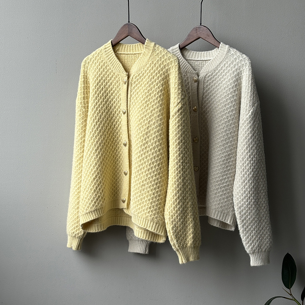 *o-ha-you*【FYSA105】菠蘿紋愛心扣圓領毛衣2024秋冬寬鬆軟糯慵懶風針織開襟衫-3色-香檳黃有現貨