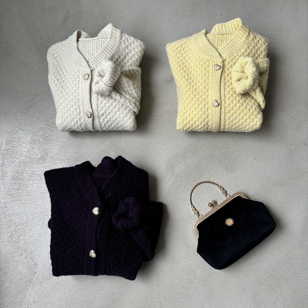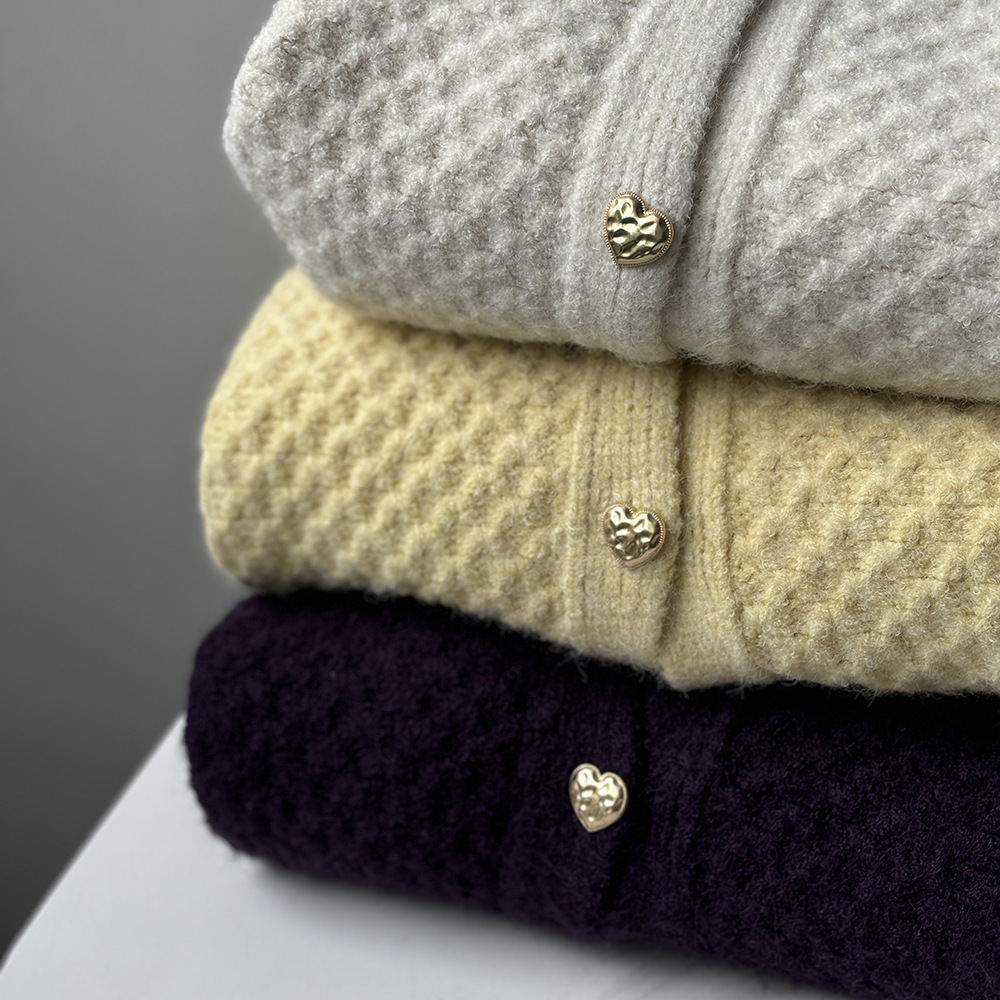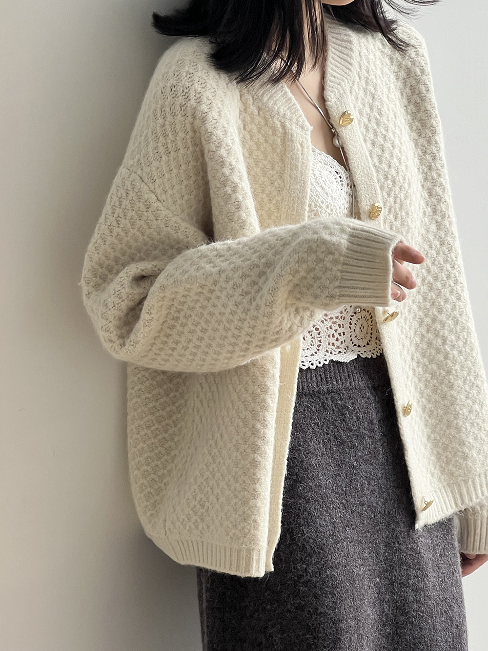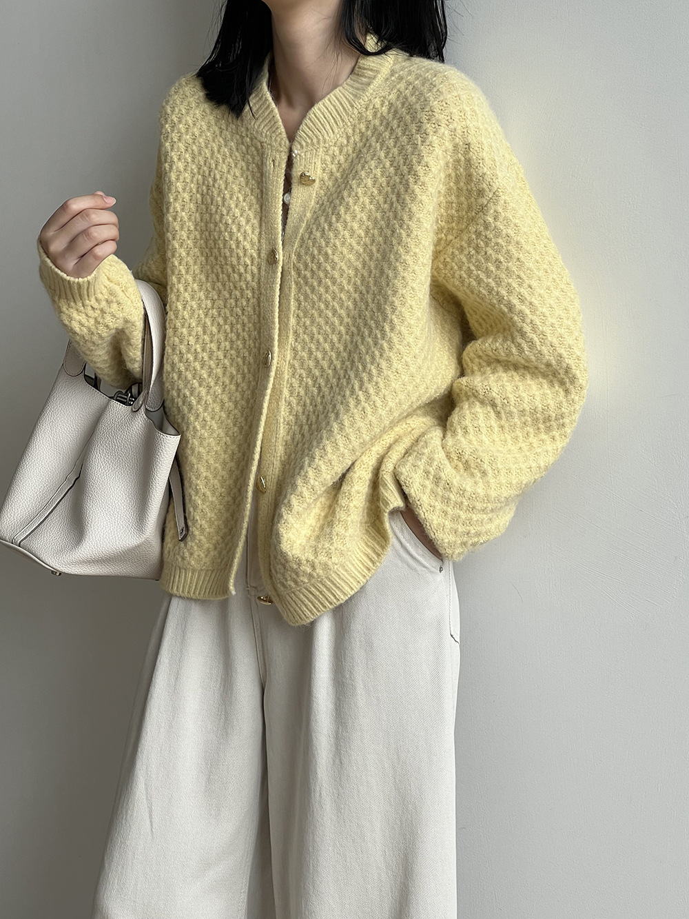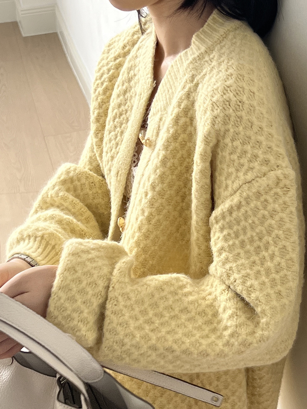 *o-ha-you*【FYSA105】菠蘿紋愛心扣圓領毛衣2024秋冬寬鬆軟糯慵懶風針織開襟衫-3色-香檳黃有現貨