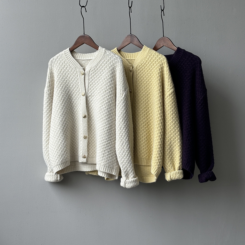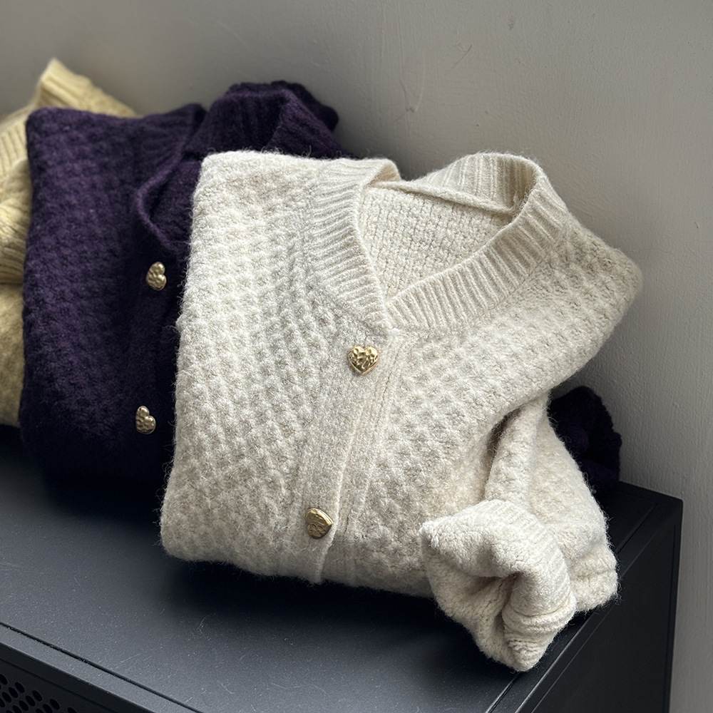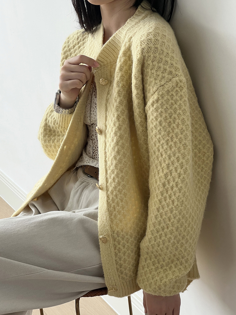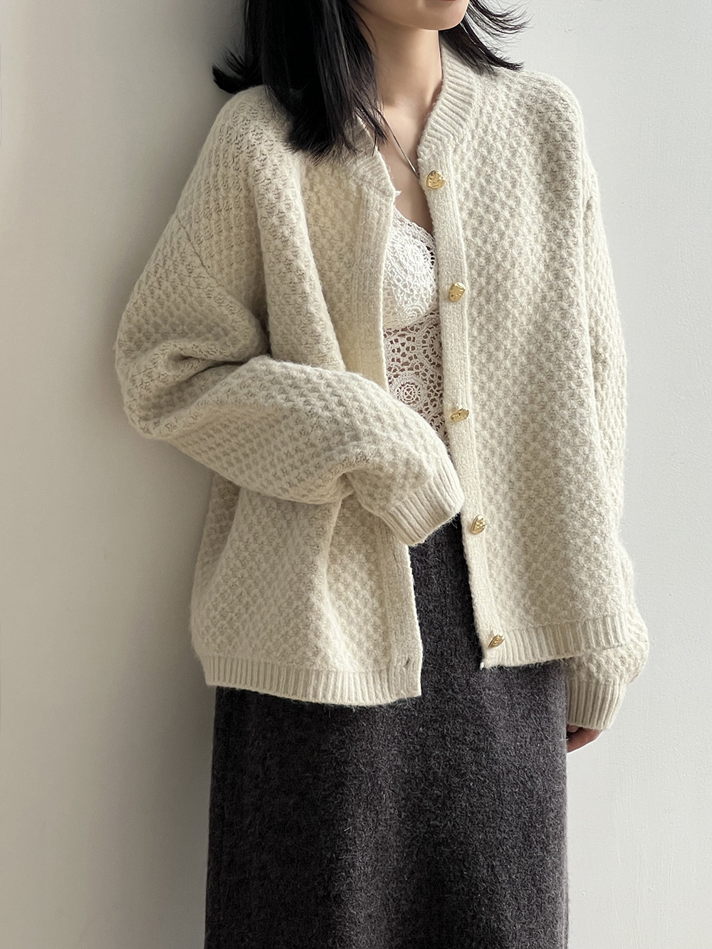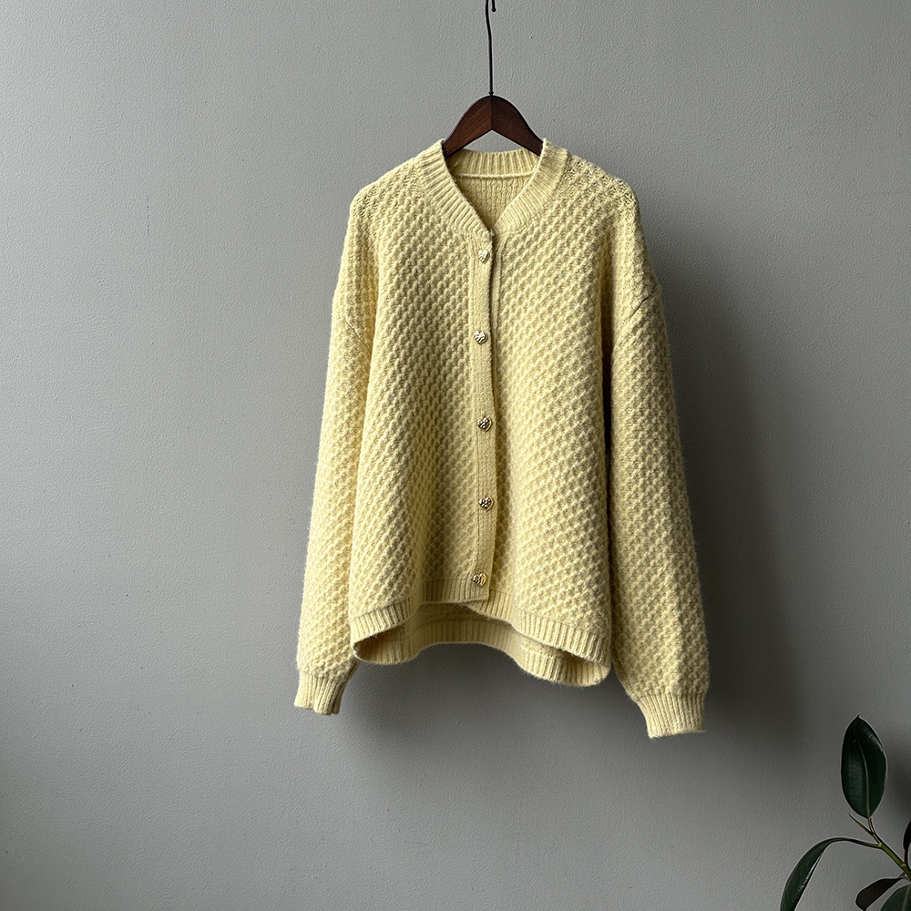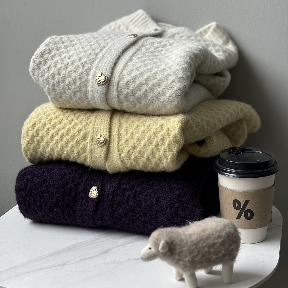 *o-ha-you*【FYSA105】菠蘿紋愛心扣圓領毛衣2024秋冬寬鬆軟糯慵懶風針織開襟衫-3色-香檳黃有現貨