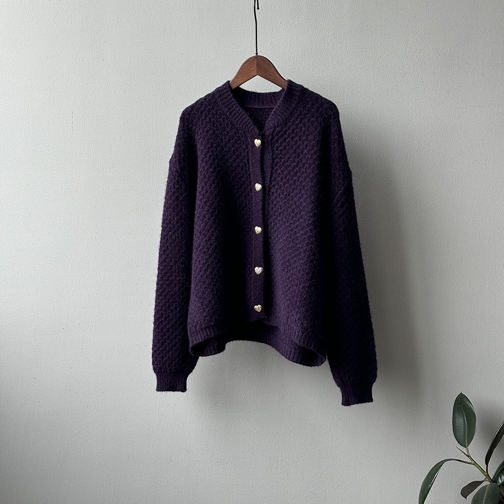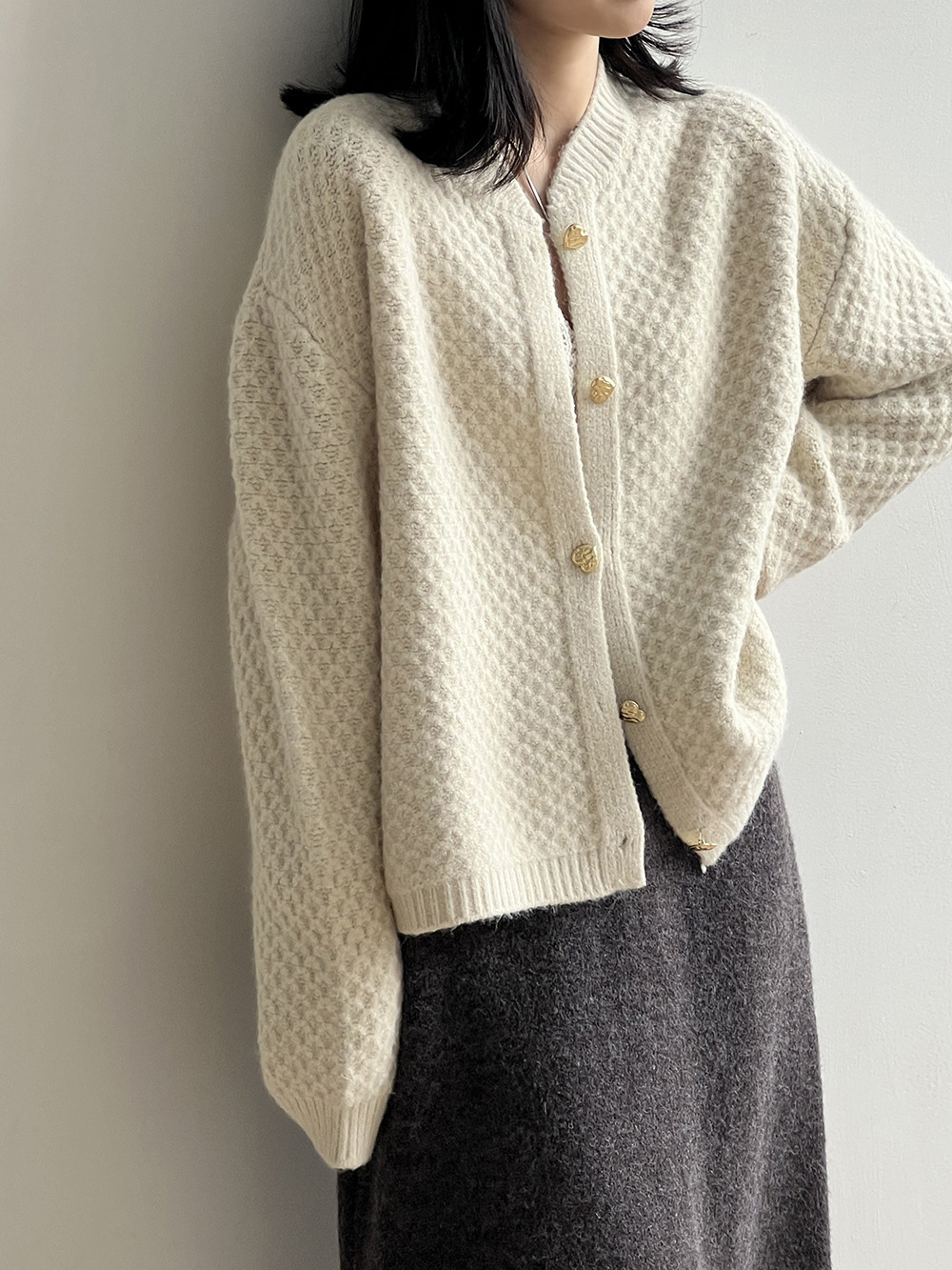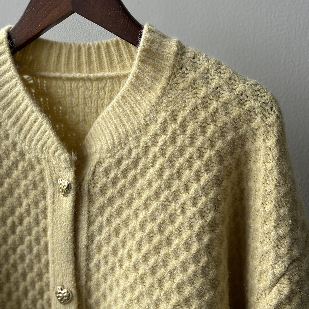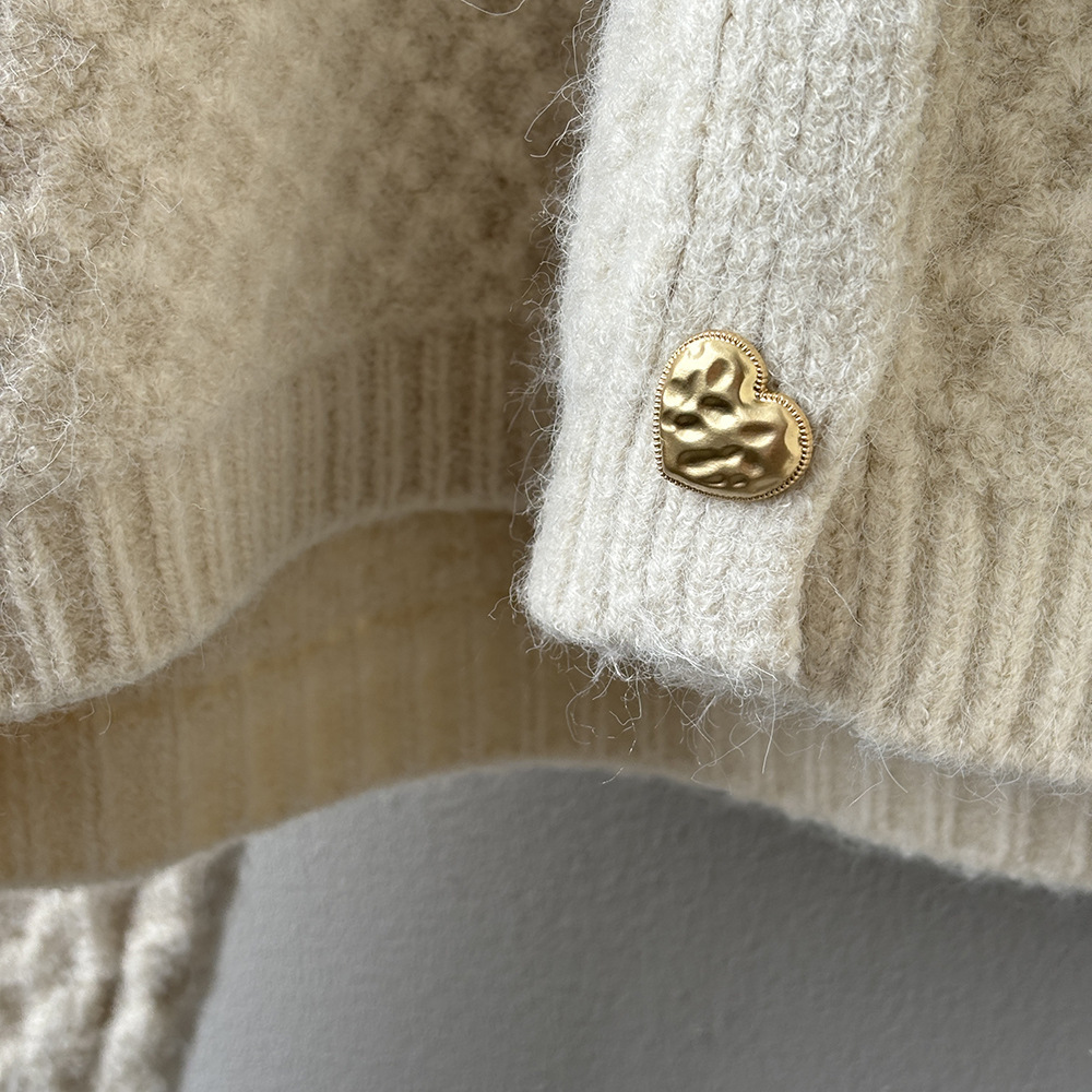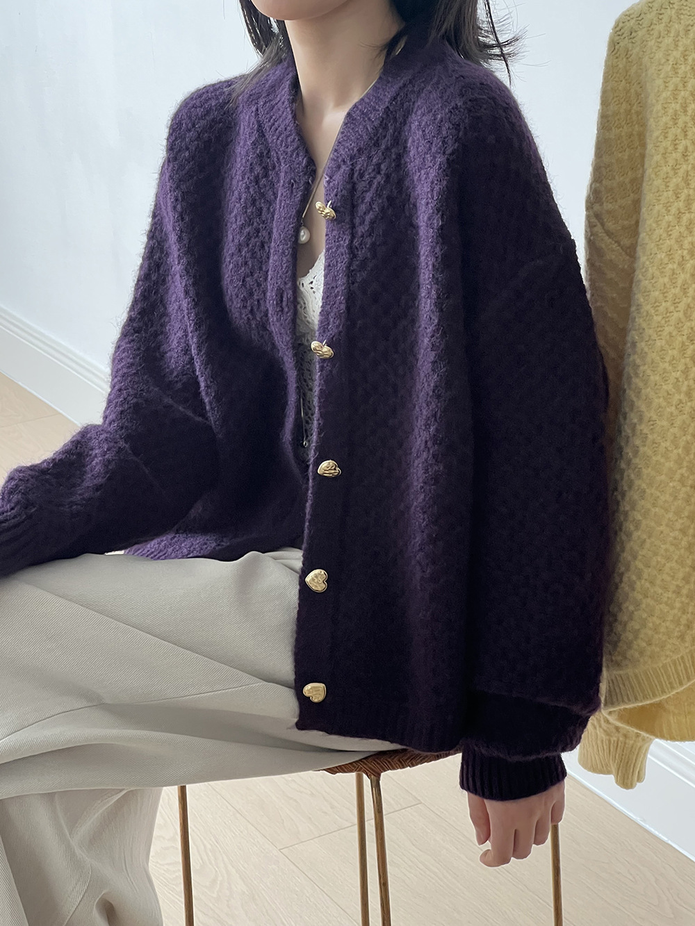 *o-ha-you*【FYSA105】菠蘿紋愛心扣圓領毛衣2024秋冬寬鬆軟糯慵懶風針織開襟衫-3色-香檳黃有現貨