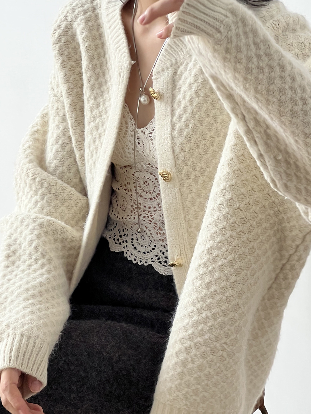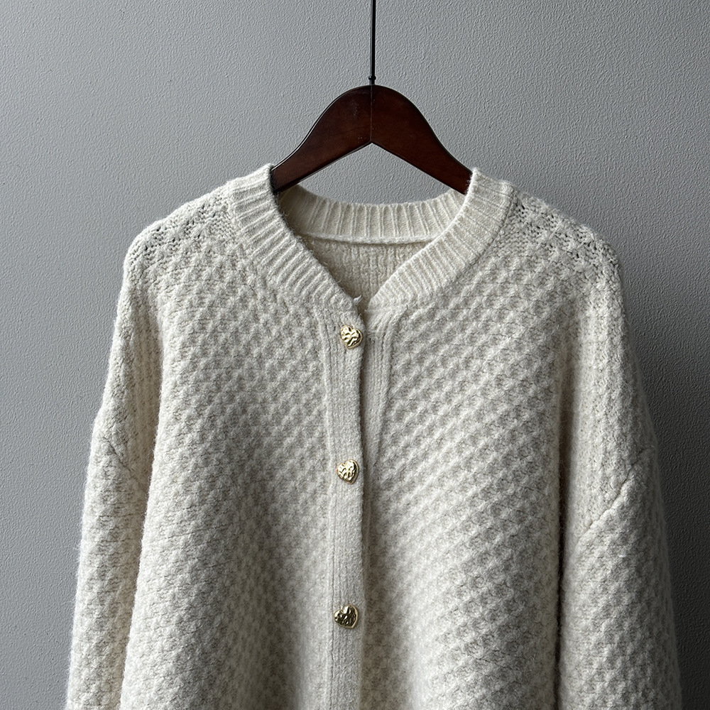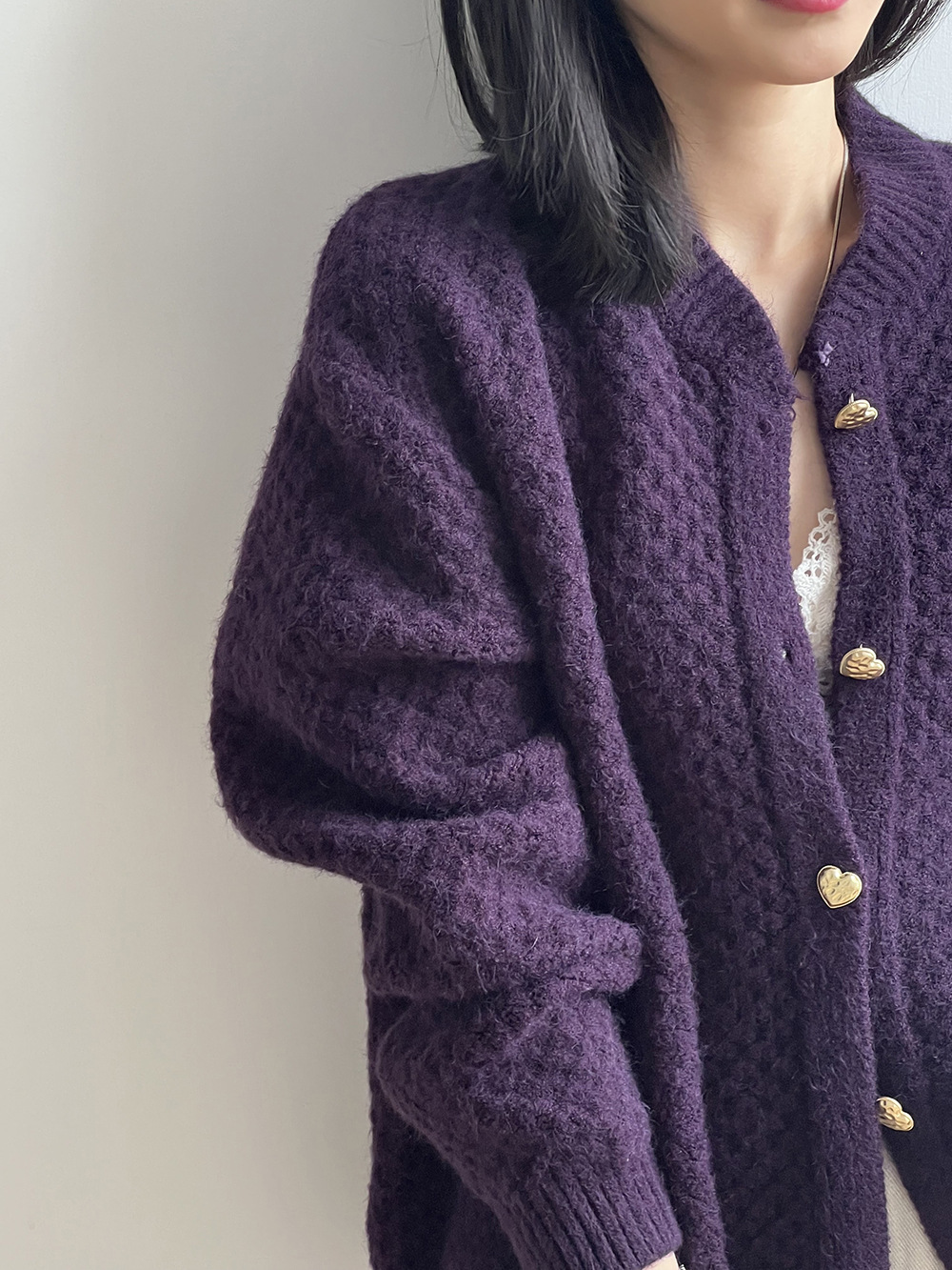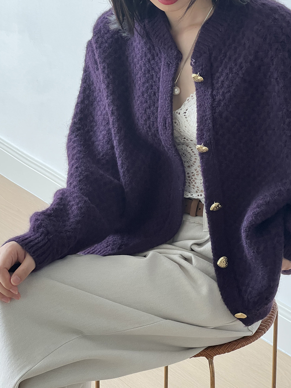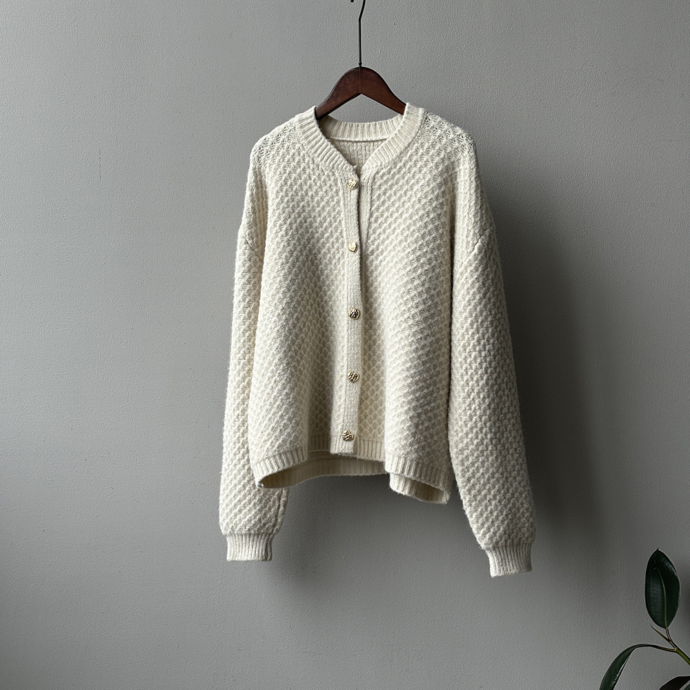 *o-ha-you*【FYSA105】菠蘿紋愛心扣圓領毛衣2024秋冬寬鬆軟糯慵懶風針織開襟衫-3色-香檳黃有現貨