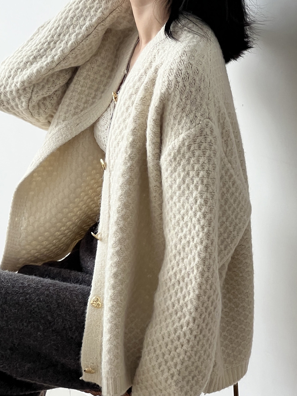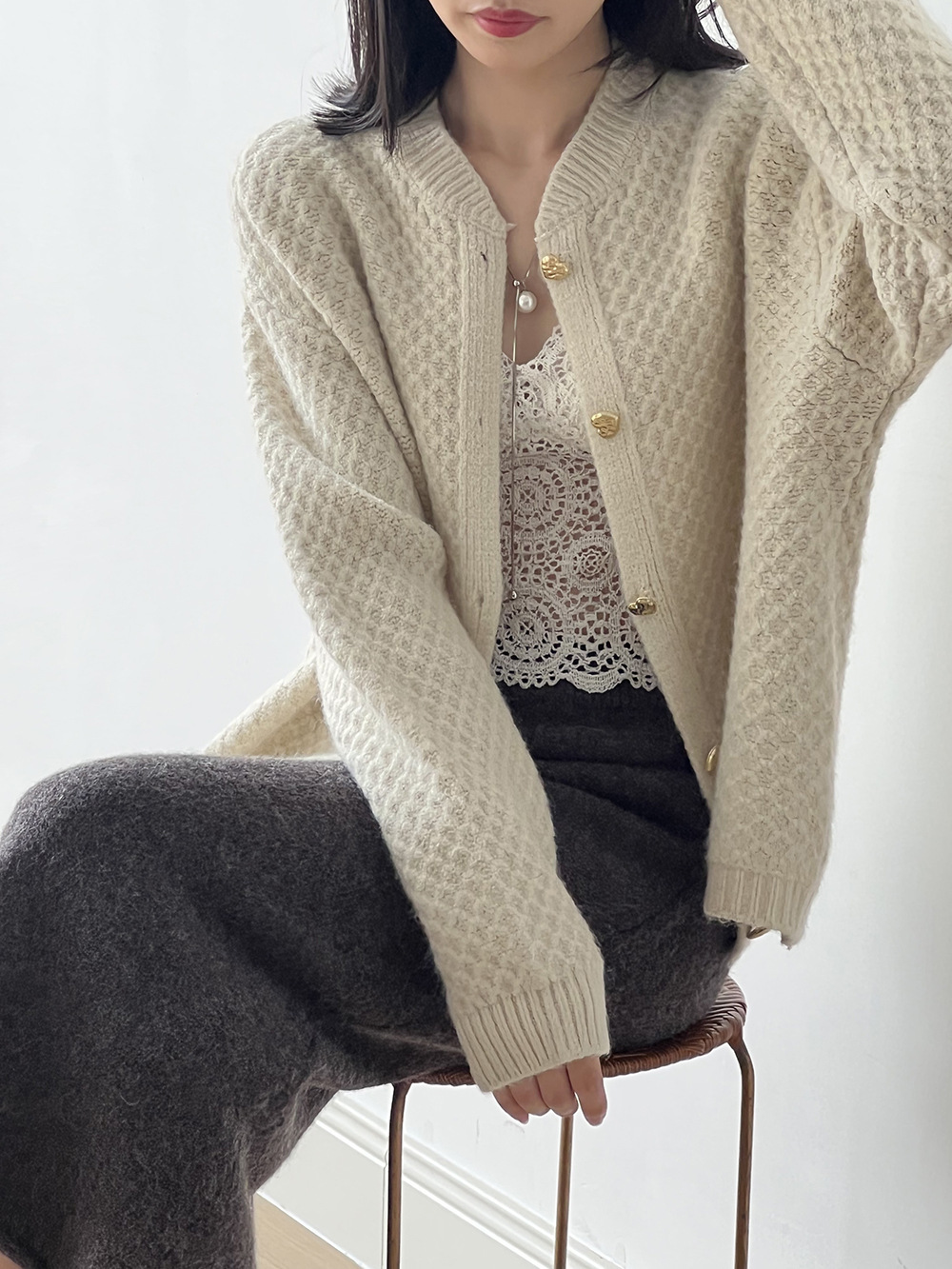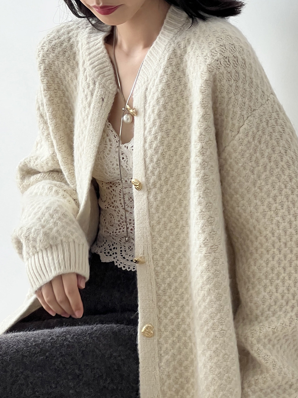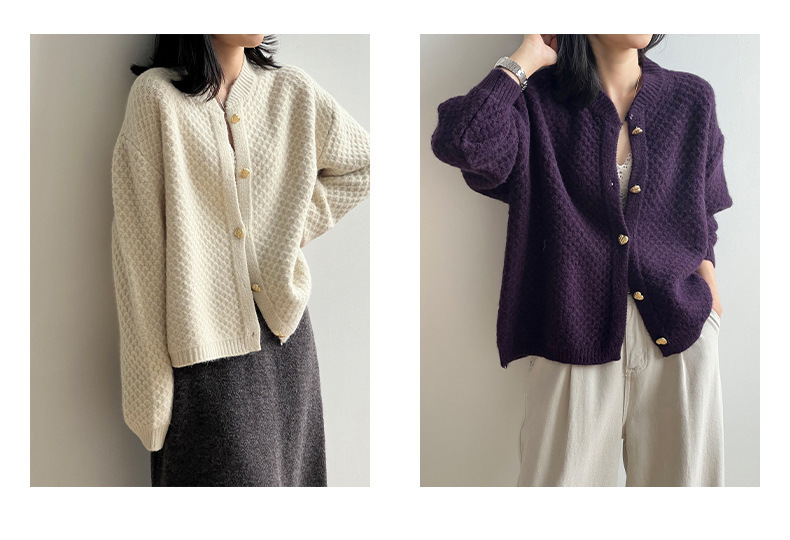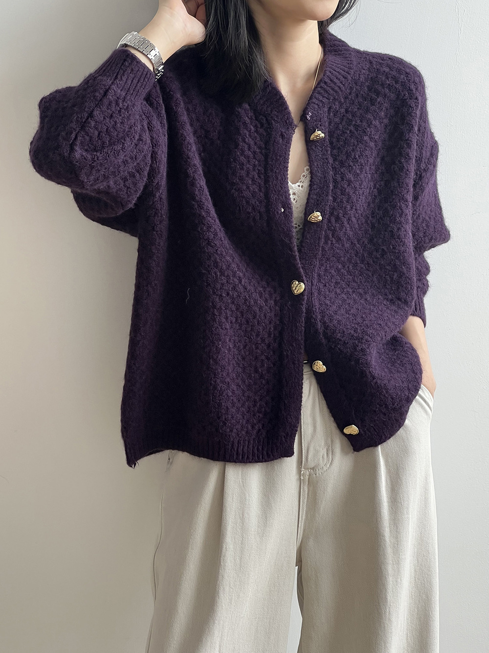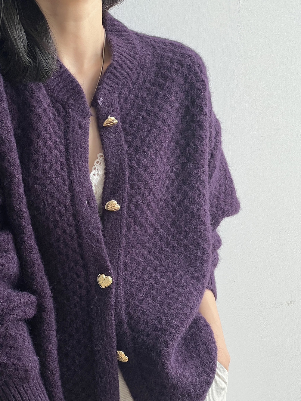 *o-ha-you*【FYSA105】菠蘿紋愛心扣圓領毛衣2024秋冬寬鬆軟糯慵懶風針織開襟衫-3色-香檳黃有現貨